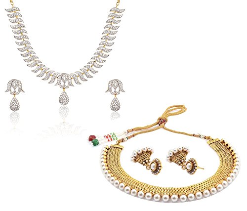 YouBella All Time Combo of American Diamond Jewellery Set and Traditional Pearl Necklace Set with Jhumki Earrings
