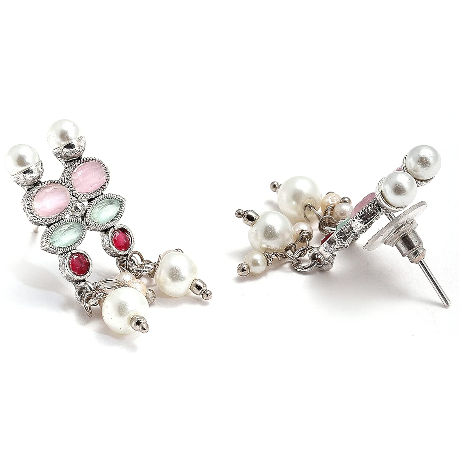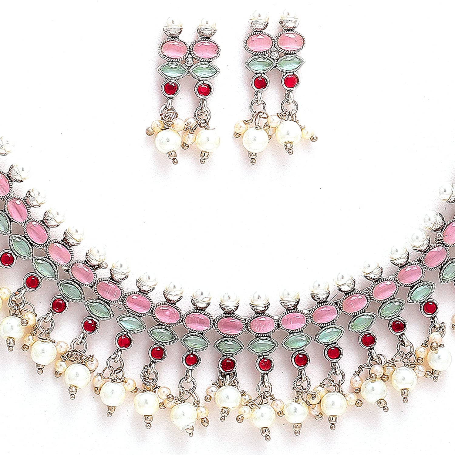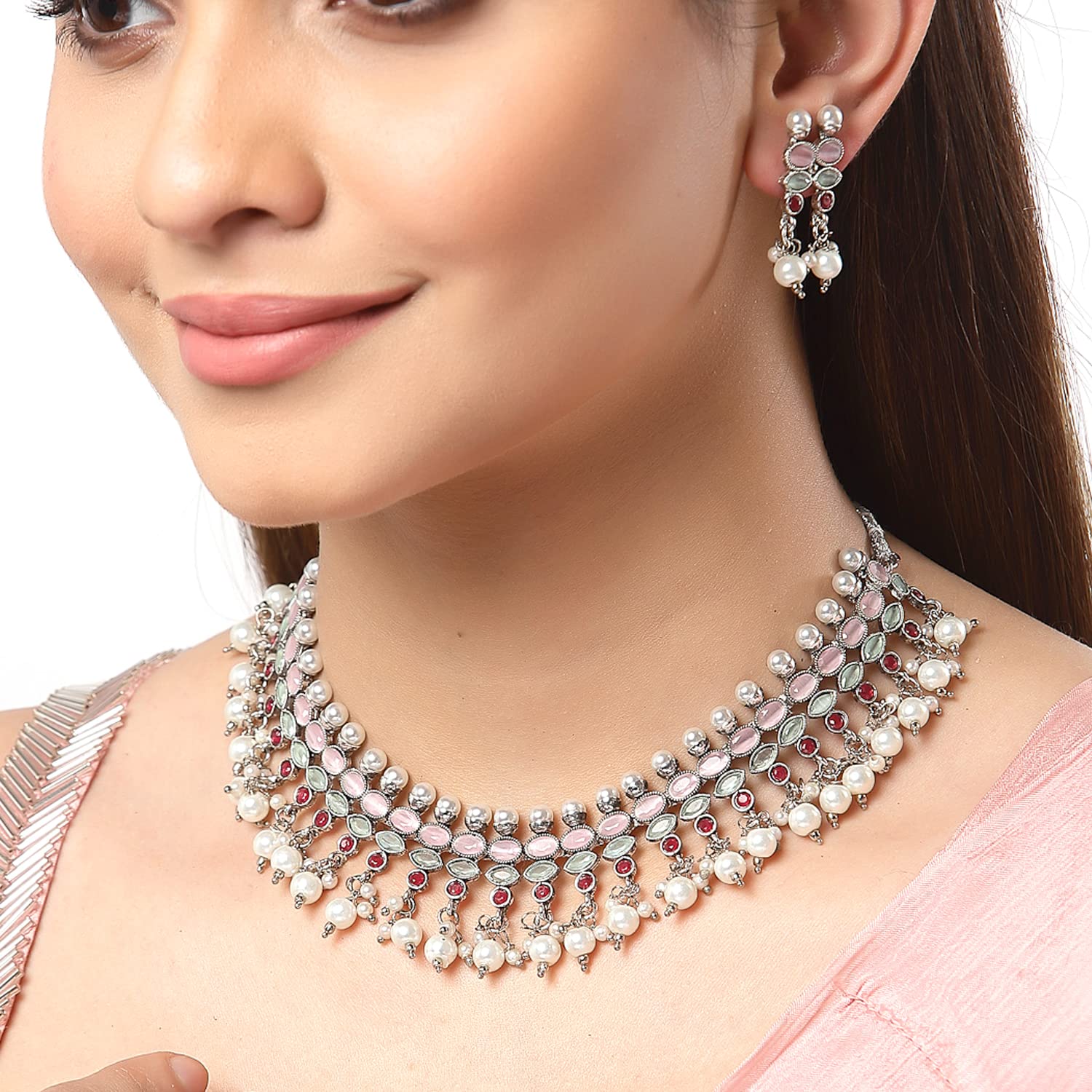 Zeneme is a celebration of womanhood a celebration of the life of a confident down to earth woman who is here in today's modern world with traditional sensibilities and a whole lot to give and share.Zeneme brings the best exquisite design jewelry to you at affordable prices. Our expert eye for craftsmanship rarity and quality can be seen through all of our flattering designs. This breathtaking necklace with earrings jewelry set is great for making a fashion statement. It will bring you a lot of compliments. Traditional necklaces add a hint of raw ethnic beauty to any look. Representing a classic fusion of exquisite craftsmanship and feminine elegance this set will definitely be a treasured inclusion in every woman's jewelry collection. Best gifts for mother sister wife and girlfriend.Features:Comfortable and lightweight Non-allergic to skinBeautifully crafted for a nice lookCare Instruction: Keep away from chemicals water and direct sunlight. Clean it with a dry and soft cloth or cotton.Our Jewelry is designed to enhance inner beauty and confidence to offers an effortless complement to elegant outfits.Fashion Latest Stylish Traditional Oxidised Silver Necklace Jewellery Set for Women. This is a must-have design that can be worn on special occasions to boost up your style factor and enhance the beauty of yours.