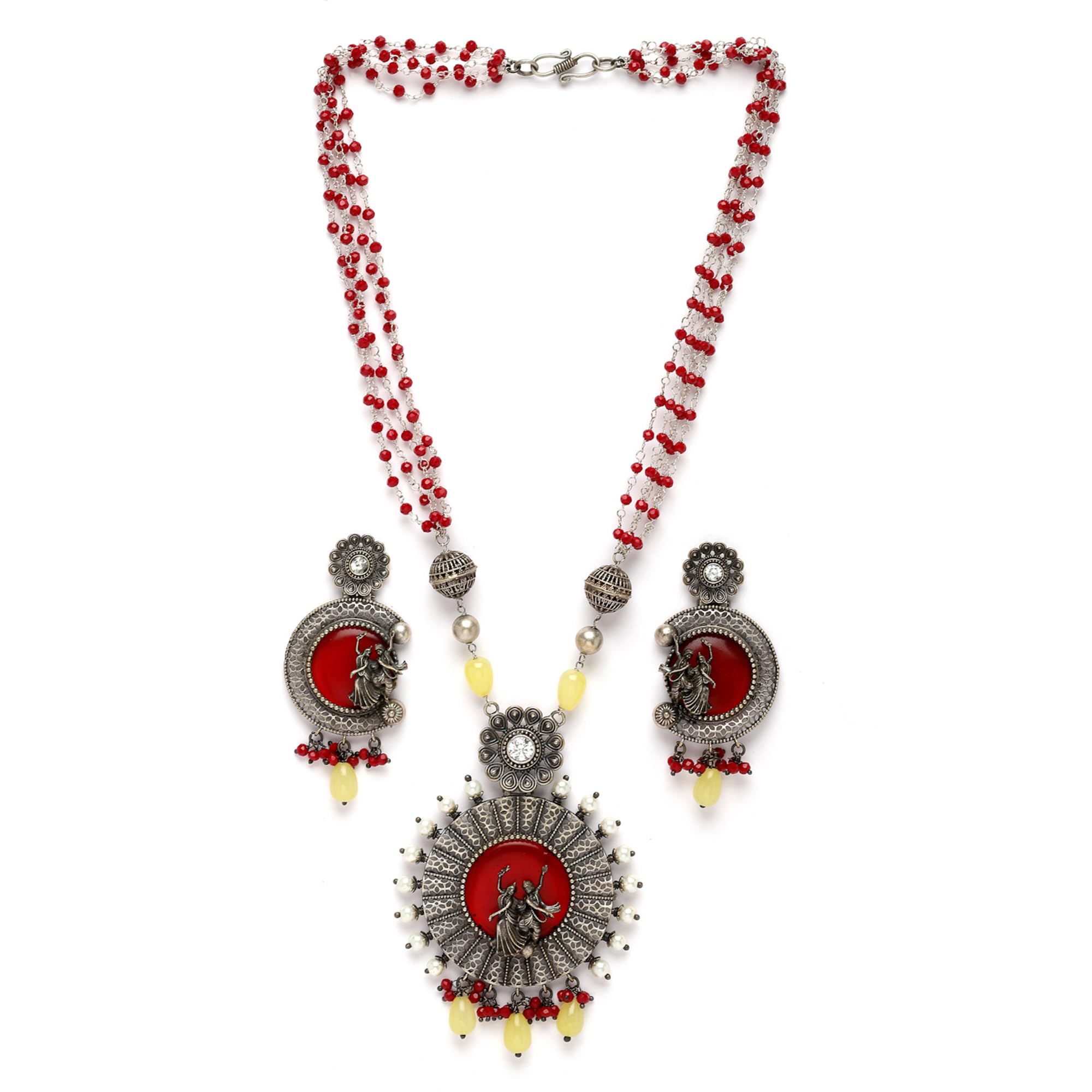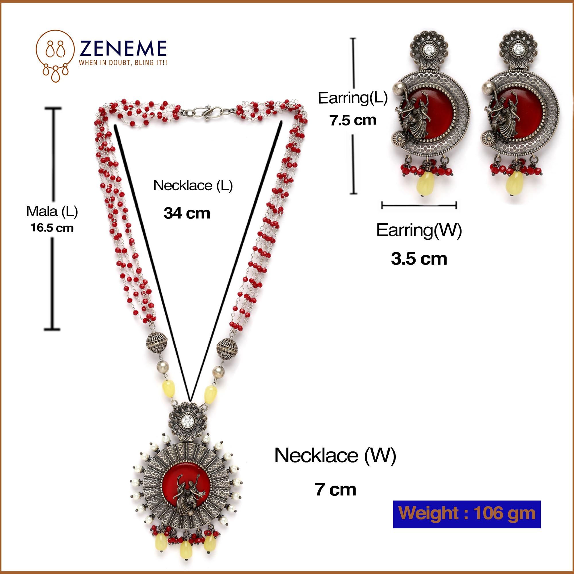 ZENEME Oxidised Silver-Plated Stone Studded & Beaded Antique Matte God Krishna Jewellery Set For Girls and Women