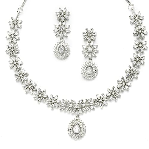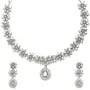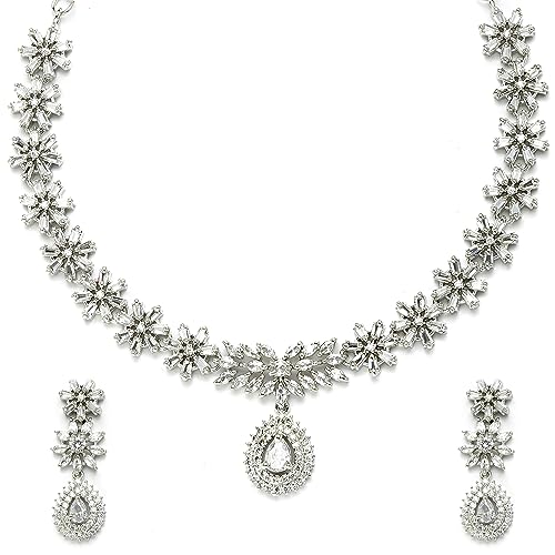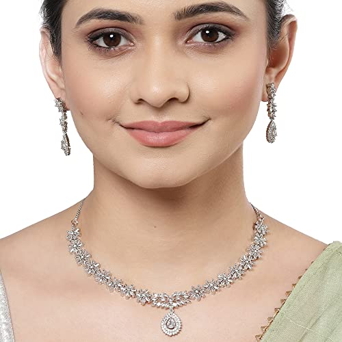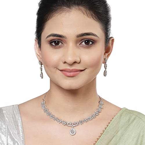 This jewellery set consists of a necklace and a pair of earrings. Rhodium-Colorwith Silver-Toned Floral Design necklace has White -studded sed by Hook closure. A pair of matching drop earrings sed with a post-and-back closure. Brand:- Zeneme Collection:- Jewellery Set Colour:- Silver and White Base Metal:- Brass Stone Type:- Occasion:- Western Type:- Necklace and Earrings Necklace Type:- Collar Earrings Type:- Drop Earrings Necklace Closure:- Hook Earring Closure:- Post and Back -On:- Plating:- Rhodium-ColorWhat you get:- 1 Pcs of Necklace 1 Set of Earrings Care Information:- Wipe your jewellery with a soft lint-free cloth after every use. Always store your jewellery in a fabric-lined flat box to avoid accidental scratches and loosening of stone settings. Avoid contact with hairspray perfume and cosmetics from your jewellery. Do not soak your jewellery in water avoid using gold in swimming pools.