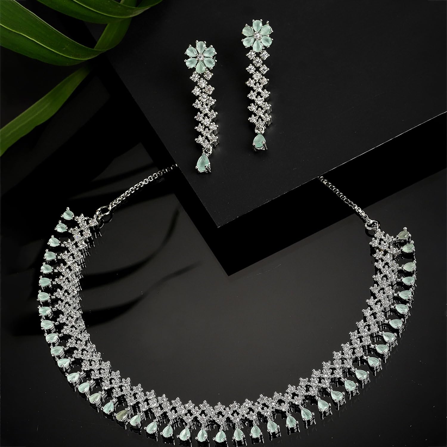 Be a trendsetter and embrace yourself with the wide collection of ZENEME. Jewelry has its own place in our hearts. It is every woman's best friend and more.Since a decade (2011) and with vision of fulfilling every woman's desire to look radiant with the unique collection of jewellery which is not just a tradition it is a form of lifestyle. Zeneme has consistently ensured that it spreads happiness with it's masterpieces not just in India but across the globe.From the house of Zeneme these Traditional necklaces add a hint of raw ethnic beauty to any look. Representing a classic fusion of exquisite craftsmanship and feminine elegance this set will definitely be a treasured inclusion in every woman's jewellery collection. The American Diamond Studded Rhodium Plated Silver Toned Necklace jewellery which is Modern design for a type look desired by women along with a pair of matching earrings. Best worn with saree suits and lehenga. A simple piece that can boost confidence and is definitely a must-have relevant for all the age groups of women.
