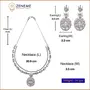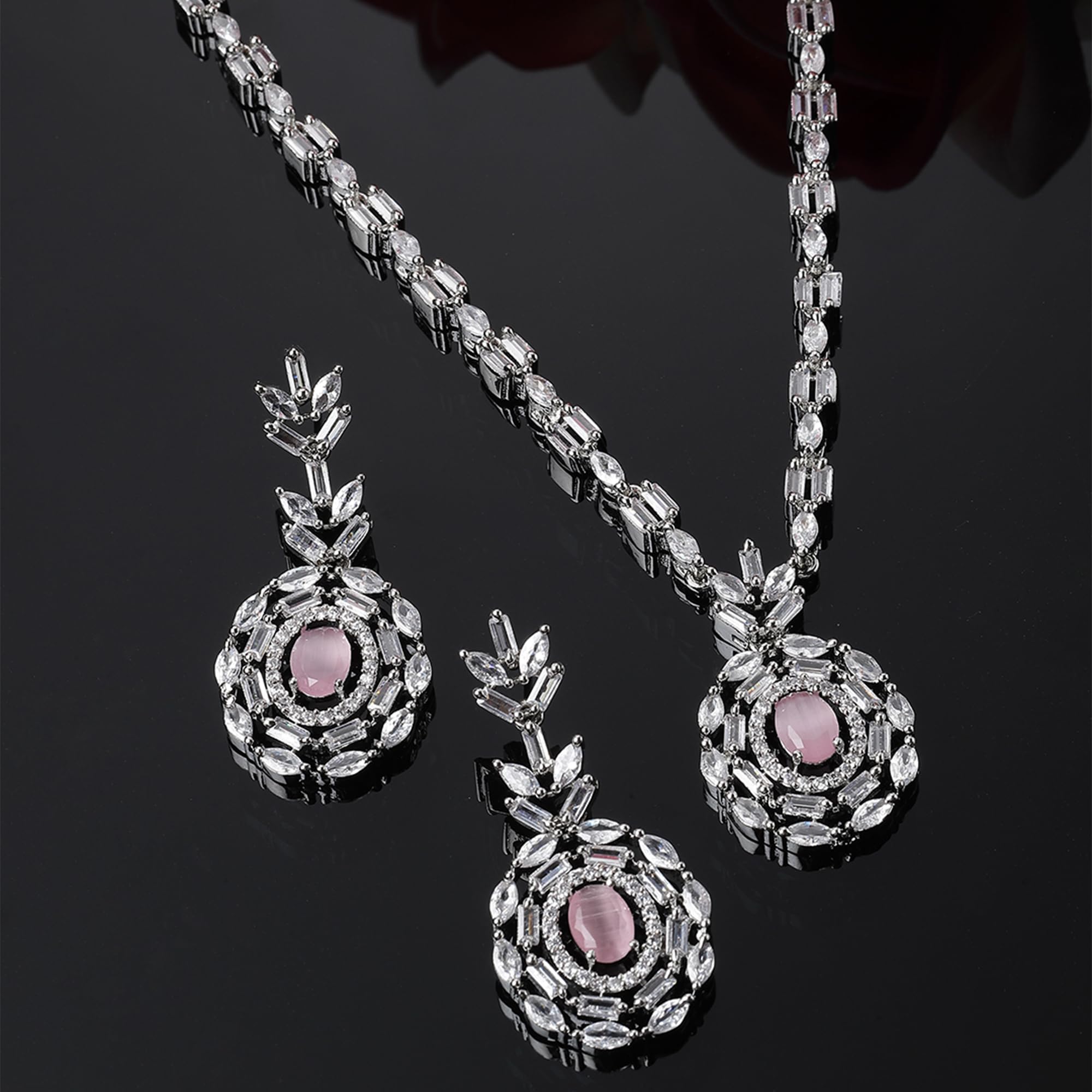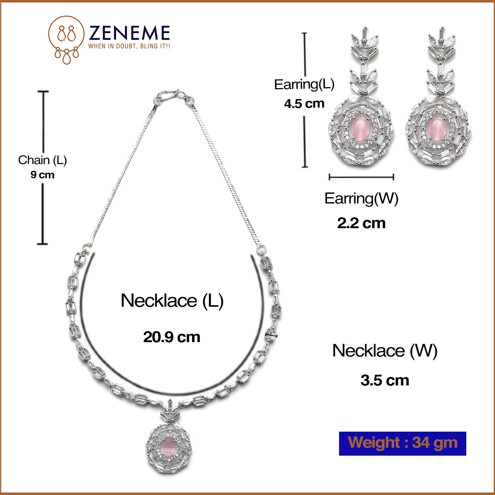 ZENEME Rhodium-Plated Silver Toned Square & Circular Shaped American Diamond Studded Necklace with Earring Jewellery Set for Girls and Women