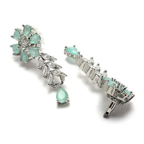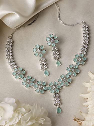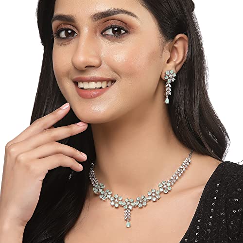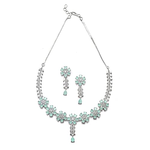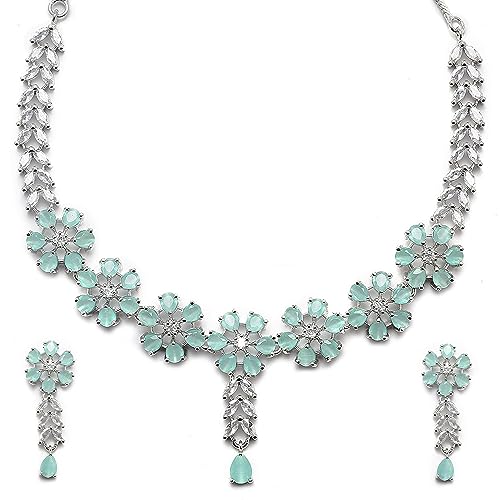 What You Get:- This jewellery set consists of a necklace and a pair of earrings. Rhodium-Plated Silver Toned Necklace has Flower shaped American Diamond studded detail secured with a S-Hook closure. A pair of matching Drop Earrings each secured with a Post and Back Closure. LUXURY GIFTING IDEA:- Give a meaningful and luxurious gift with Zeneme Jewellery. A favourite gift choice each Zeneme jewellery for women comes with a Signature gift box and makes excellent gift choice for birthdays wedding anniversaries Valentine's Day Mother's Day Diwali Christmas and all your special occasions. MATERIAL CRAFTSMANSHIP:- Finest quality stones and environmentally friendly nonprecious Metals are used for making the jewelry set. It is safe for wearing for long hours. Exquisite handwork is required since some crystals are too small to pick my fingers really hard and time-consuming. JEWELLERY CARE:- Keep the jewellery away from direct heat water perfumes deodorants and other strong chemicals as they may react with the metal or plating. Store the jewellry when not in use in a storage box or a cloth pouch to retain its shine. Nickel free and Lead free as per International Standards that makes it very skin friendly. The plating is non-allergic and safe for all environments.