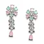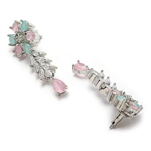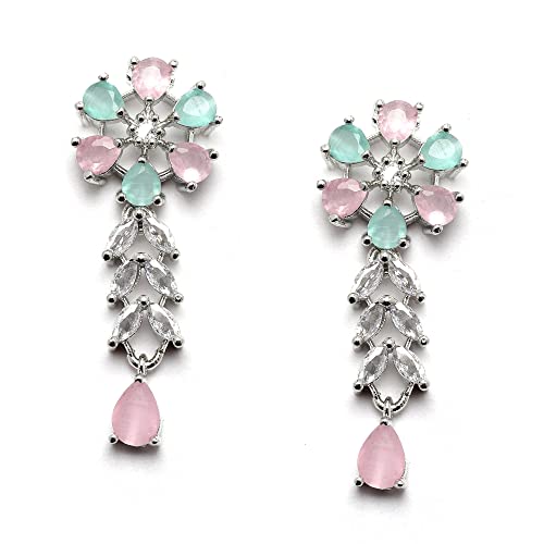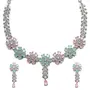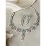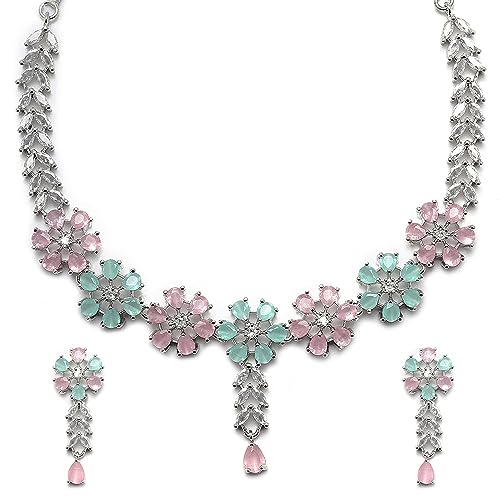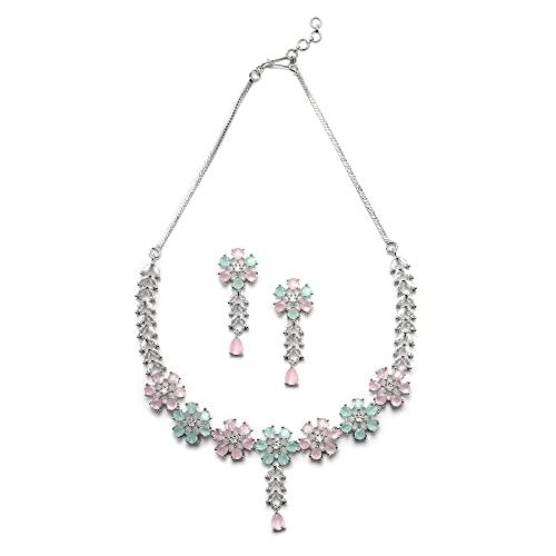 ZENEME Women's Rhodium-Plated Silver Toned Flower Shaped American Diamond Studded Necklace With Earring Jewellery Set Free Size Lime Green & Pink