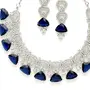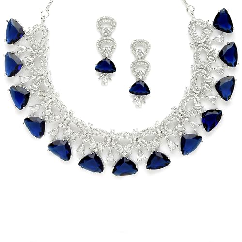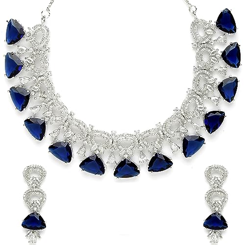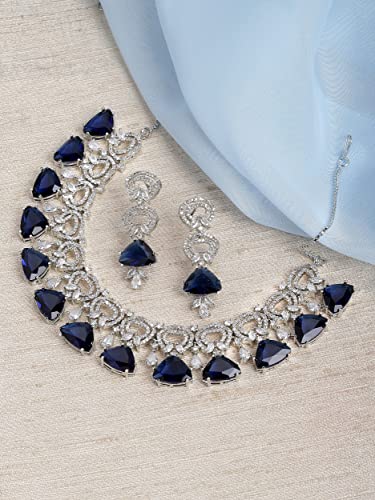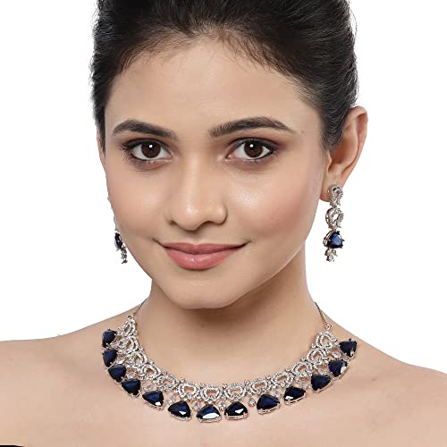 ZENEME Women's Rhodium-Plated With Silver-Toned And White American Diamond Studded Choker Necklace And Drop Earrings Jewellery Set