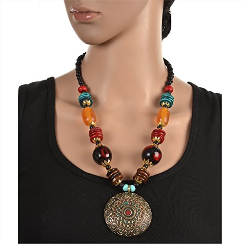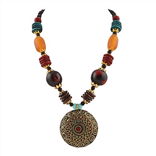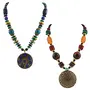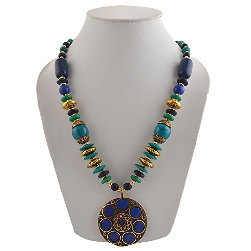 Combo of 2 beautiful Tibetan style beaded necklace. Necklace beautifully handcrafted with a combination of blue red green golden carved beads and dui beads. Round pendant showcases beautiful inlay work in blue green red and gold. Boho style statement fashion necklace for women. Pair with Sarees Kurtis or other ethnic Indo-western as well as casual wear. These Tibetan style fashion necklace will complement your ethnic as well as casual wear. Great for gifting to friends too. Necklace length=23'' Pendant length=2.3'' pendant Width=2.3''; Necklace (with blue pendant)length=20'' Pendant length=2'' Pendant width=2''