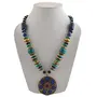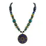 • Necklace beautifully handcrafted with a combination of blue red green golden carved beads and dzi beads. Round pendant showcases beautiful inlay work in blue green red and gold.