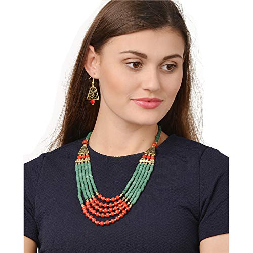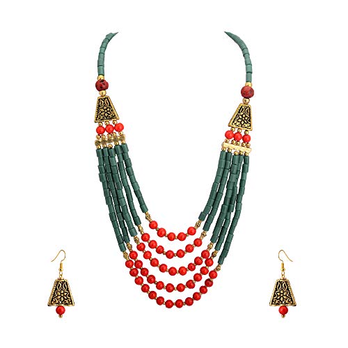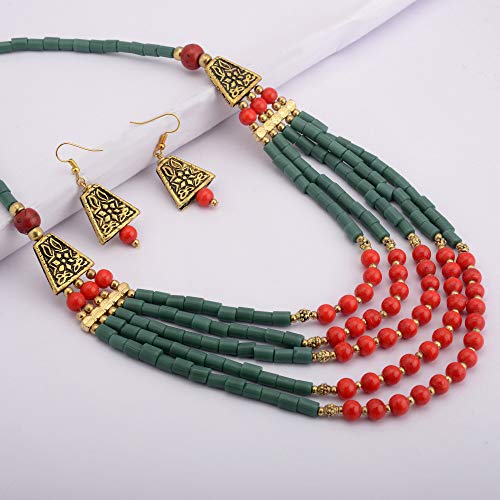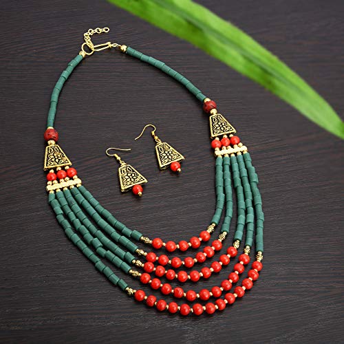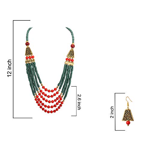 Amazing Tibetan multi strand necklace Necklace beautifully handcrafted with red black and golden beads. Golden designer beads gives an amazing look to the necklace.Falls beautifully with the neck. Easy to wear adjustable S-hook clasp for adjusting easily around the neck.Chic Boho style statement fashion necklace for women. Pair with Sarees Kurtis or other ethnic Indo-western as well as casual wear. Necklace length=22''