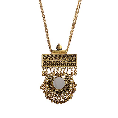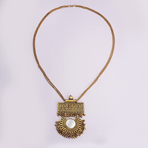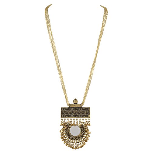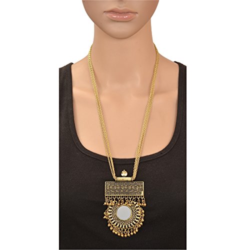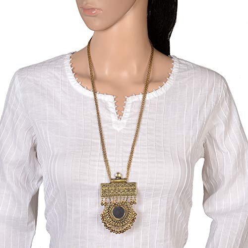 Stunning Afghani long pendant necklace from Zephyrr for a perfect bohemian gypsy look.Bohemian Necklaces like these are the biggest trend of the year. This piece is sure to make heads roll Amazing crescent shaped design with carved design on the pendant with dangling silver beads mirrors and metallic tassels looks eye-catching.Easy to wear using an adjustable metallic lobster clasp on the back side.Necklace length=17'' Pendant Length=3.5''