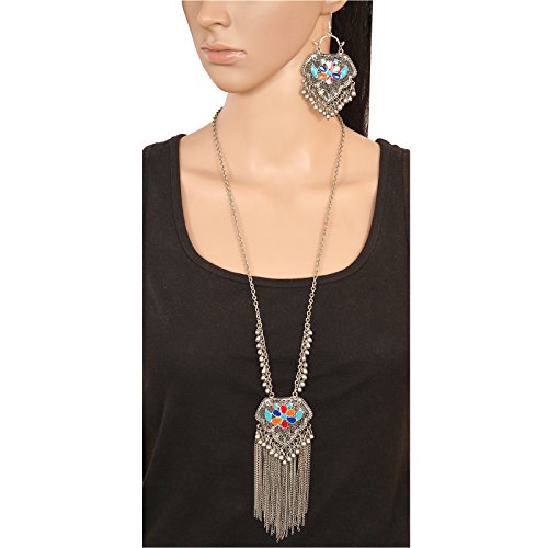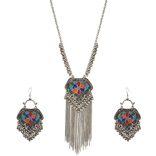 Stunning heavy look ethnic dangler Afghani hook chandbali earrings and pendant necklace set in silver tone.Long necklace with pendant with blue orange and red enamel work and silver beads and chain tassels. Floral design on hook dangler earrings with blue orange and red enamel work gives a traditional touch to the earrings. Silver beads dangle to create a striking look.Perfect with ethnic & traditional wear. Can also be a perfect gifting option for friends and dear ones.Each earring weighs- 26 g ; Earrings Length=4'' earrings Width=1.6'' Necklace length=19" pendant length=5"
