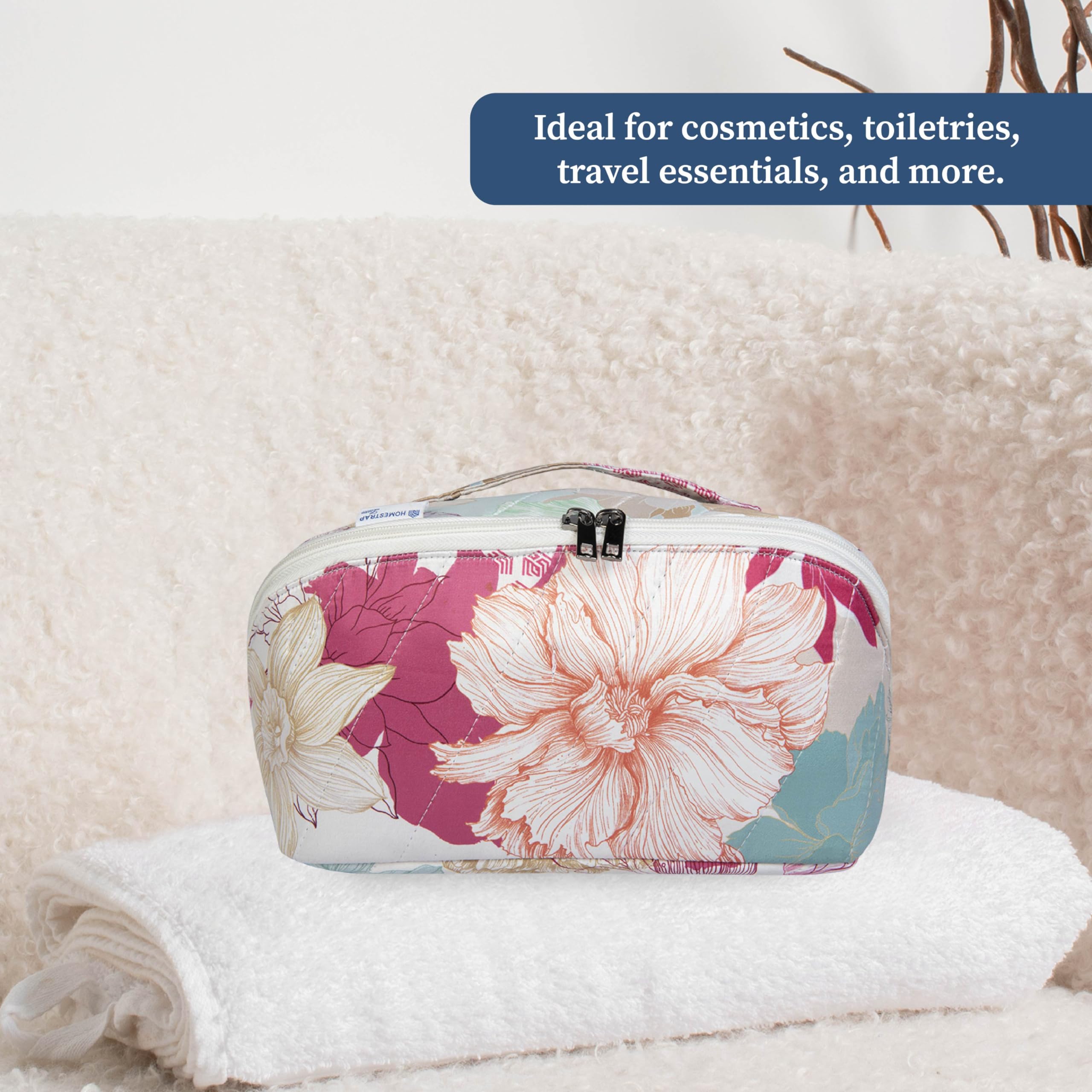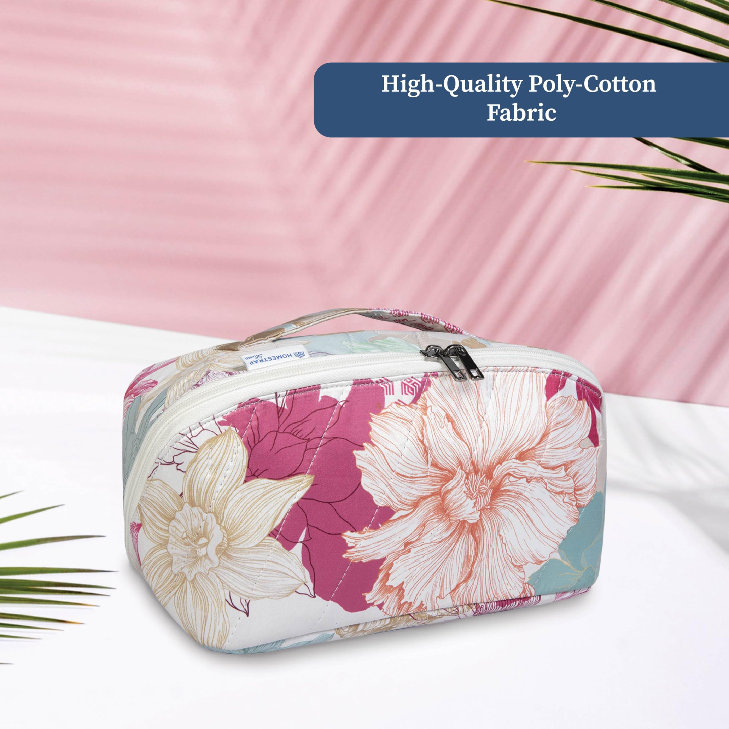Embrace the vibrant charm of the Gulmohar tree with Homestrap's "Gulmohar - Organize in Full Bloom" cosmetic organizer bag. Measuring 25L x 20W x 12H cm this elegant makeup pouch features a stylish floral design and is made from durable high quality fabric. The large opening and flat design offer easy access and organization while metal zippers and neat stitching ensure durability. A separate dirt-resistant pocket keeps your makeup and cosmetic items tidy. Versatile for travel business or daily use it also makes a thoughtful gift for any occasion. Trusted by over 4 million users Homestrap ensures superior protection for your essentials. Whether you need a makeup organizer makeup pouch travel organizer or cosmetic organizer bag this product caters to all your needs.