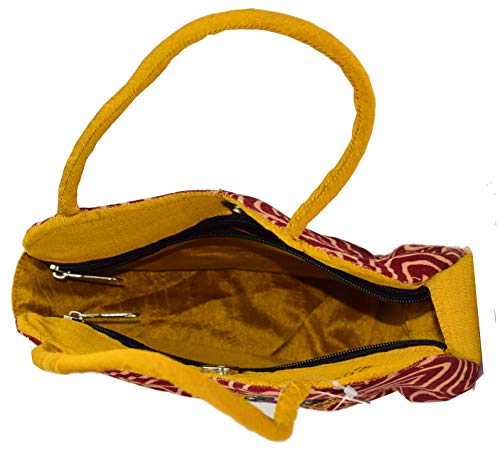 • Material : Mushru Silk Dimensions : 25 CM x 20 CM x 7 CM 1 Main Compartment and 2 Inside side Chained Pocket