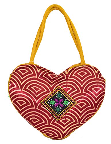 Ethnics of Kutch Women's presents -Mushru Silk HEART Handle Purse - unique piece of Kutchi Fusion Traditional Handicraft- Fusion of Style Fasion and Tradition - HEART Handle Purse. This Heart Shaped Handle Purses are attractive blend of Ethnic Traditional Handicraft Fashion and Modern Style and with Contemporary look for Young Women and Girls. This mushru silk handle purse is fusion of Ethnic Kutch Handicraft work and modern design. Carry it on your hand wherever you go be it a party or gathering casual and routine use collages or shopping its ethnic looks and shine will make you stand out from the rest. Traditional Kutchhi Hand Work Patch makes it more catchy and enhances its beauty
