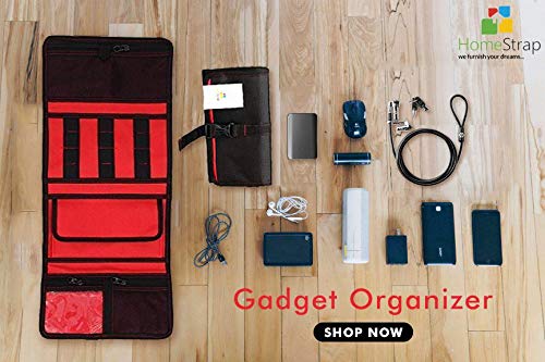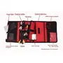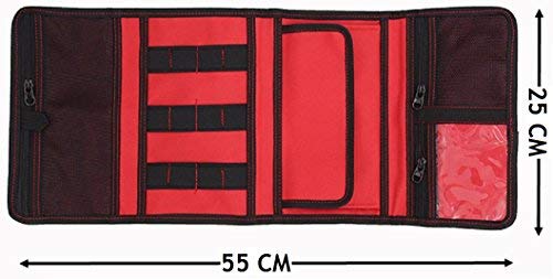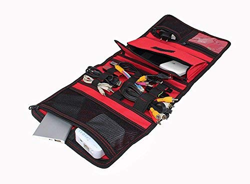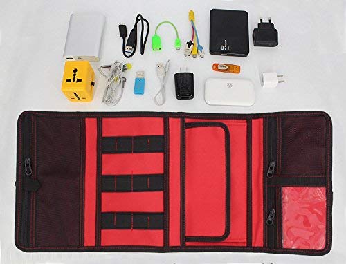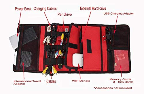 4 large & 8 small elastic organizer to hold various items like cables pens drive and tools etc. 2 small 1 large mesh pocket with zipper for external hardisk power bank 1 small mesh pocket with Velcro closure for memory & sim cards 2 additional mesh pocket