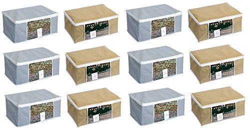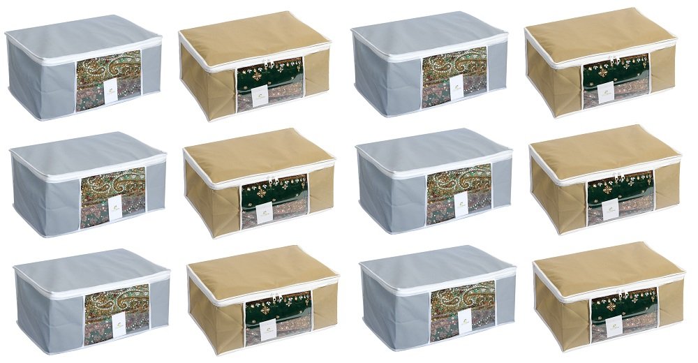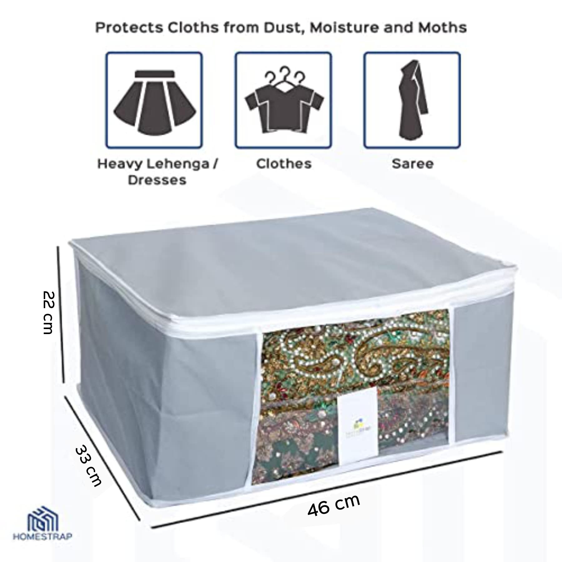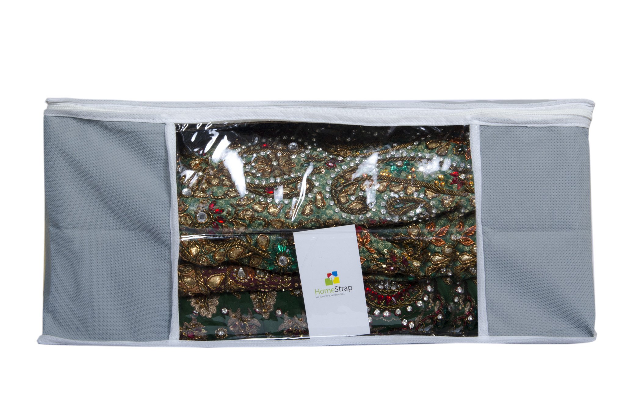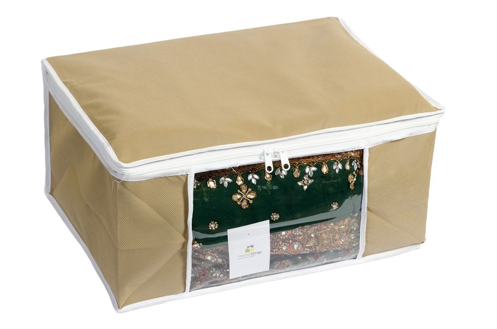 HomeStrap Non Woven saree covers helps you organize and store your sarees woolens shirts extra linen etc.Transparent front window to instantly know what is kept inside. Made in heavy VIRGIN non woven fabric makes it strong and durable 2 heavy zippers for easy opening and closing. Match it with HomeStrap Grey colour underbed or Beige colour underbed for total storage solution.