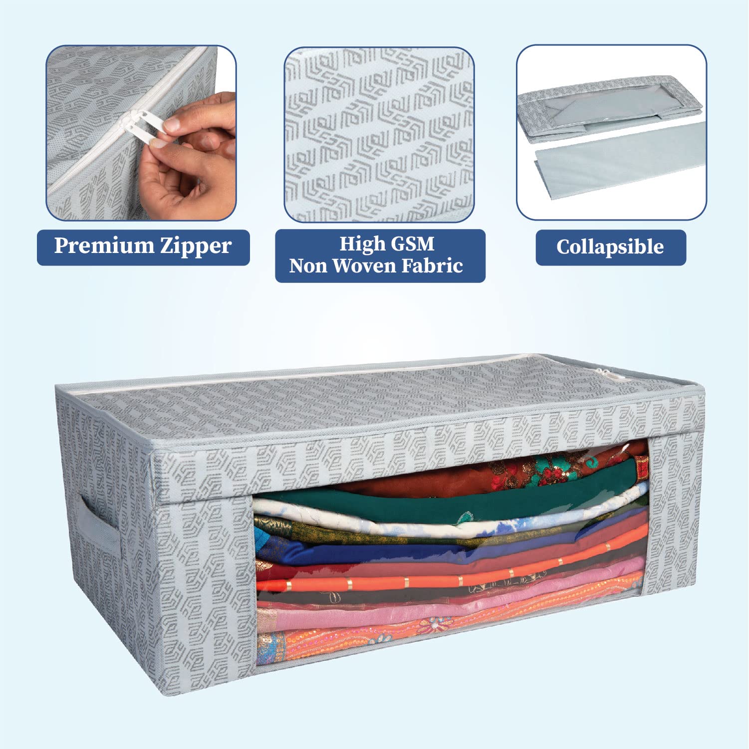 Homestrap Saree Bunker | Cloth Stacker with Front Window and Side Handle | Foldable Stackable Printed Clothes Storage Organizer | Grey