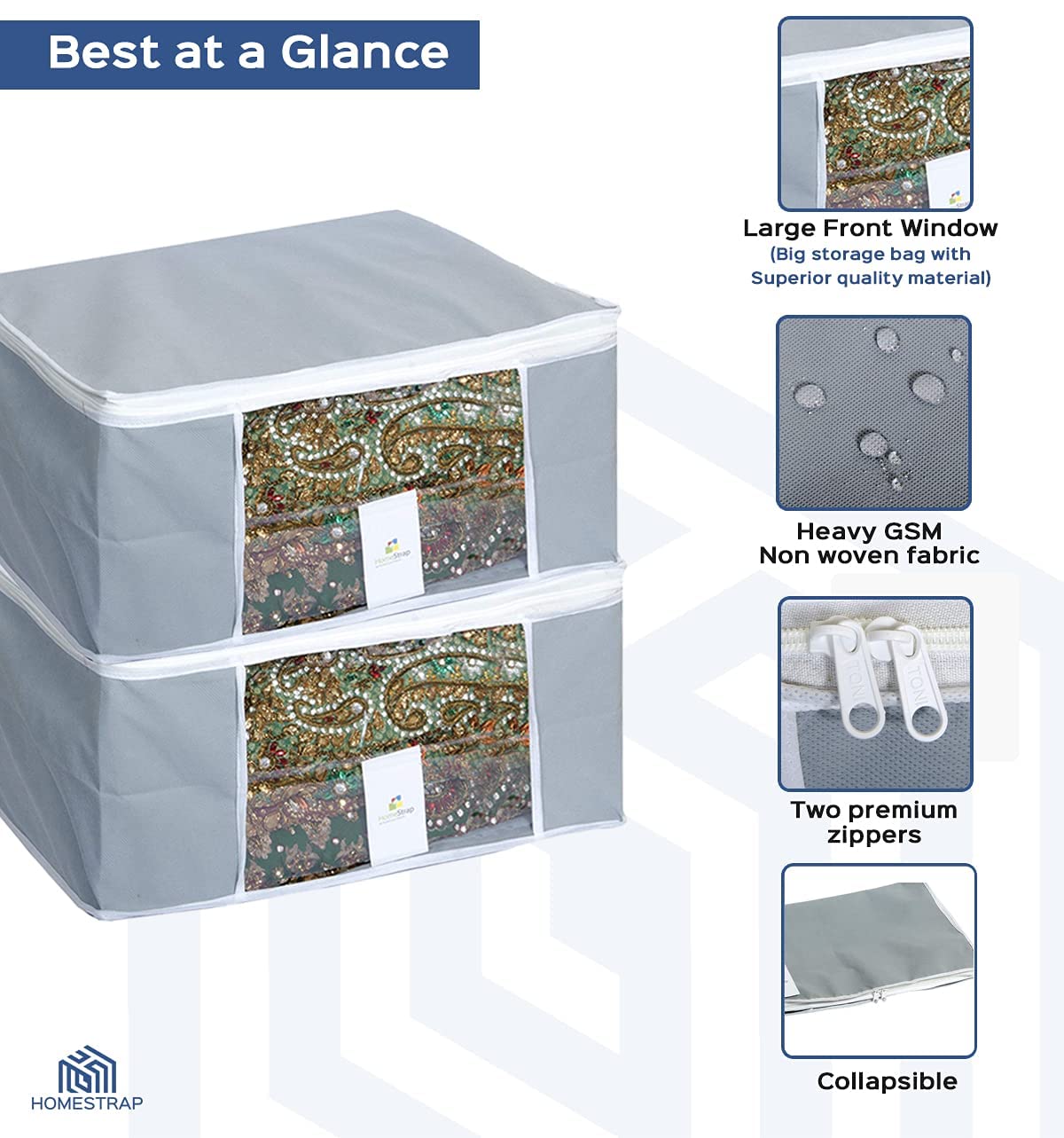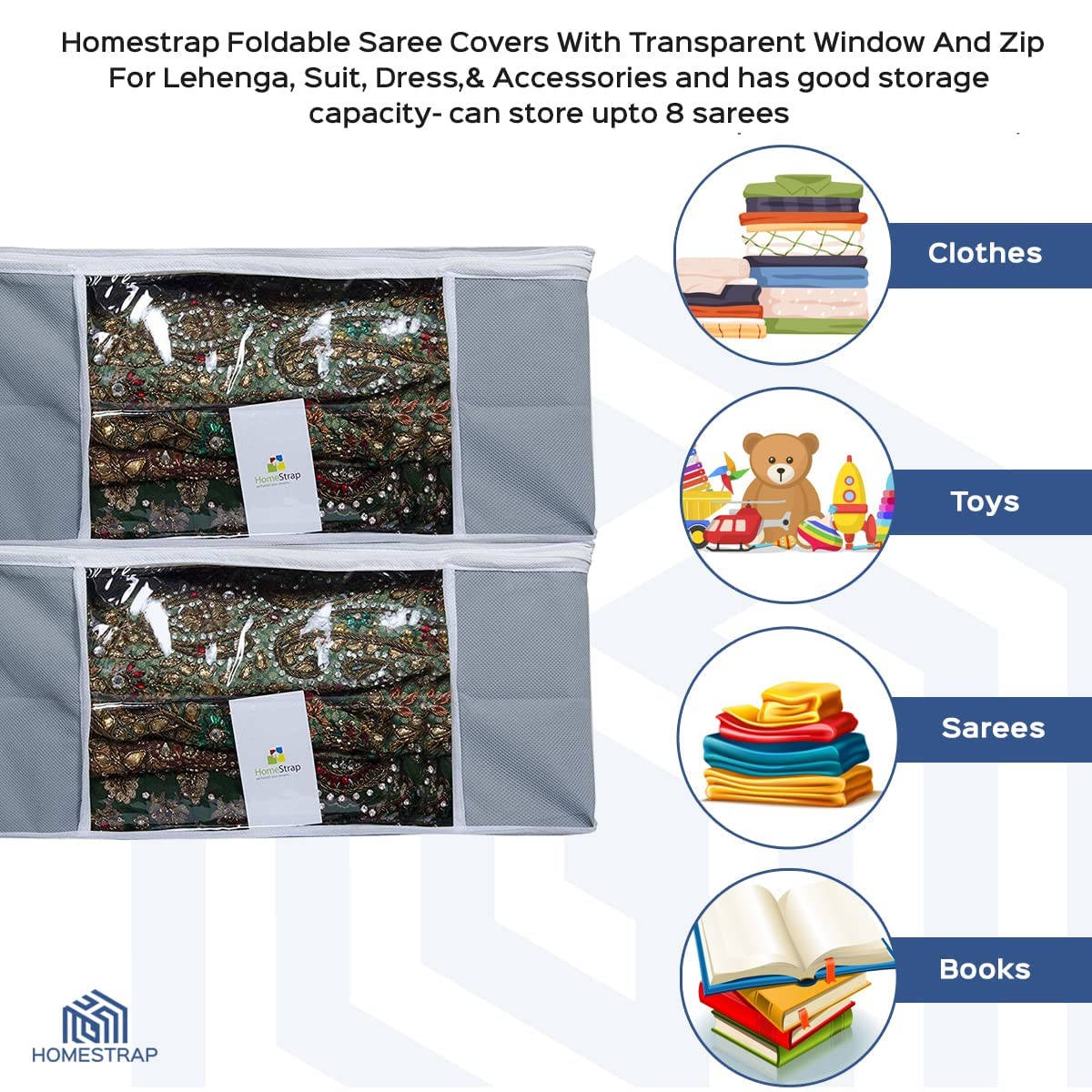 HomeStrap Brings an innovative Home storage solution for all your storage problems. Saree covers for your convenience. It is the perfect solution to keep expensive sarees and other garments in one bag to avoid dust insect and moisture. Transparent plastic view from the front for your sarees. It is provided with anti-slide zipper - making it lightweight and durable. Every wedding and the festive season finished you need to organize the off-season sarees into your closet or under-bed if you put the sarees in the closet or under bed directly they may look dirty when you wear them in next season the saree bags will protect your sarees and keep them clean. These saree bags Organizing your suitcases or travelling bags is therefore very easy. Keep your sarees in these storage bags and stack them neatly in your cupboard which can protect your sarees from dust This could be a perfect home to bedsheet regular cotton or silk sarees Lehenga garment suit heavy wedding saree single saari blouse dress shirt t-shirt coat blazer baby Kids toys.