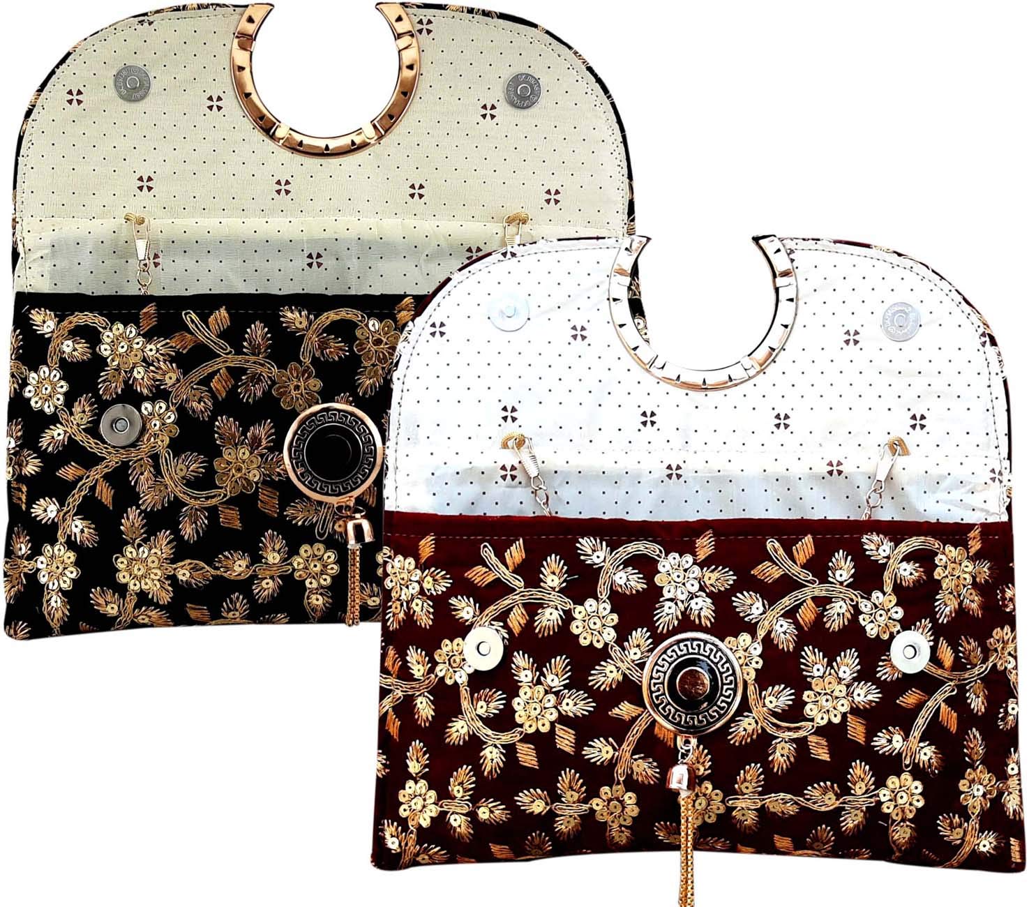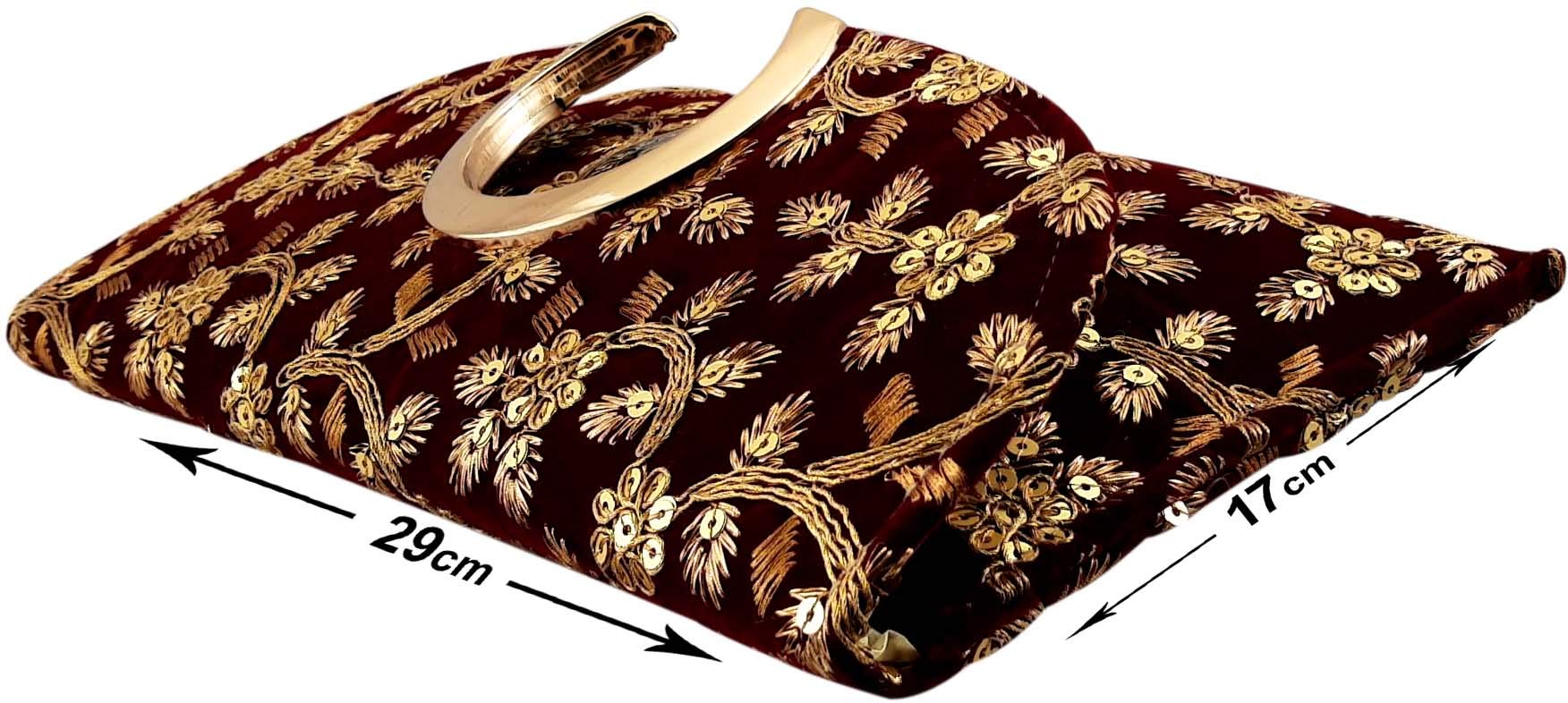 Outer Material: Velvet ; Inner Material: Satin Craft Trade Traditional Bags Has Decorated Embroidery Worked. OCCASION: The formal clutch is perfect for wedding weekend evening party prom cocktail various parties night out or formal occasions and so on. This Clutch Bag go well with both Indian and Western outfits and are superb for Wedding and Festive parties wherein it will best complement your Designer Saree Lenhga or any other dress. Product Dimension : Length (29 cm) x Height (17 cm) X Width (2 cm) Handcrafted bag made by keeping in mind the latest fashion of women. It is very easy to carry with ampler of space and will definitely boost your look and personality with its great art work of rajasthan Bag Has More Space To Keep Your Daily Stuffs money and cards will be comfortably In It.