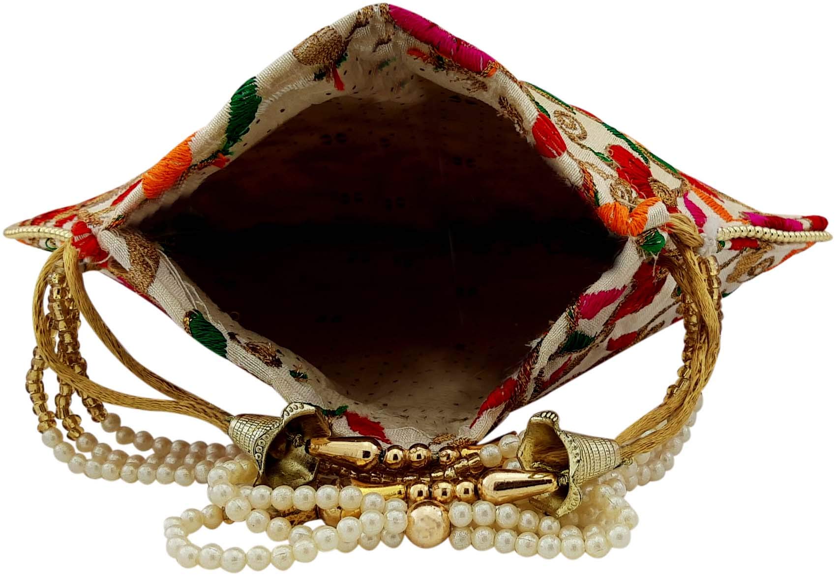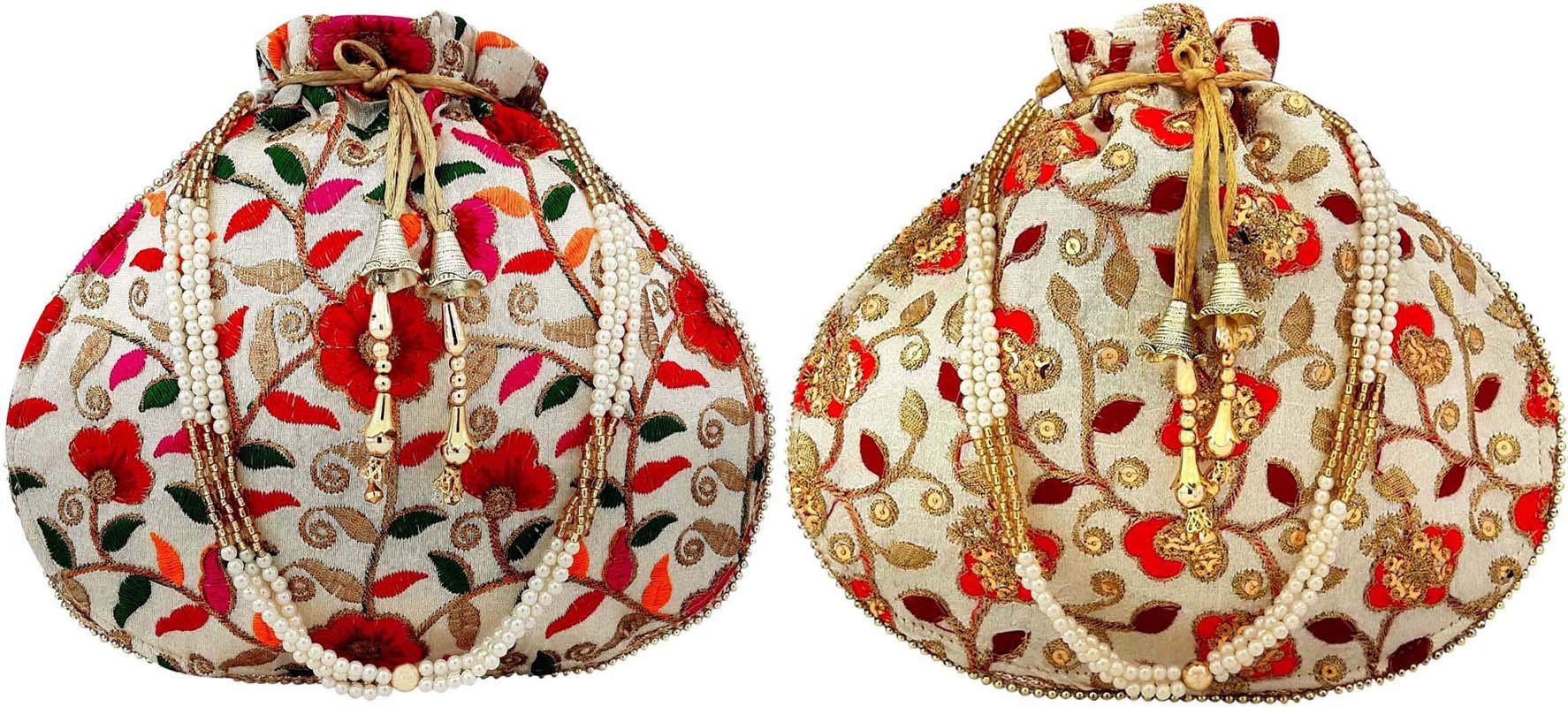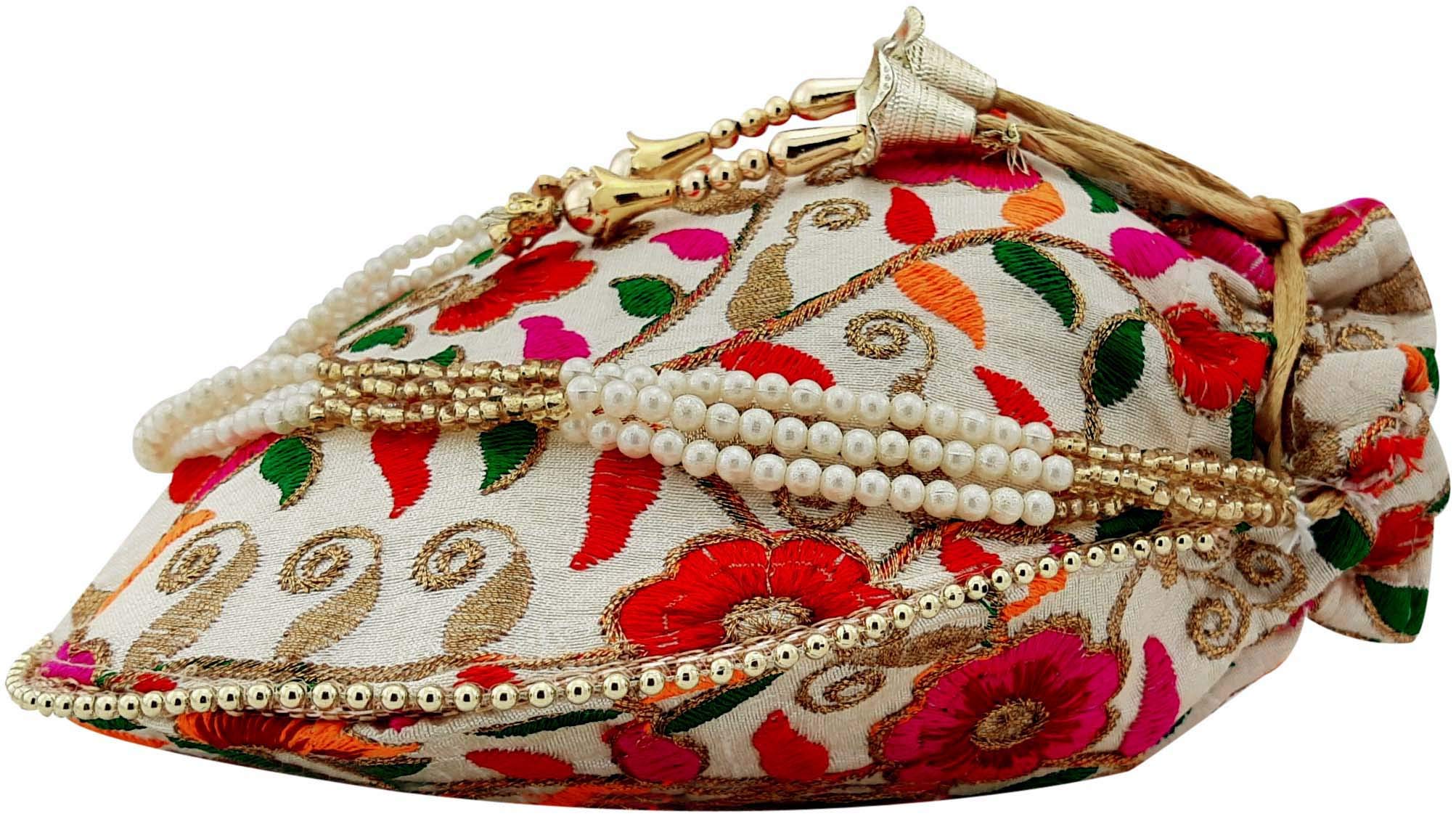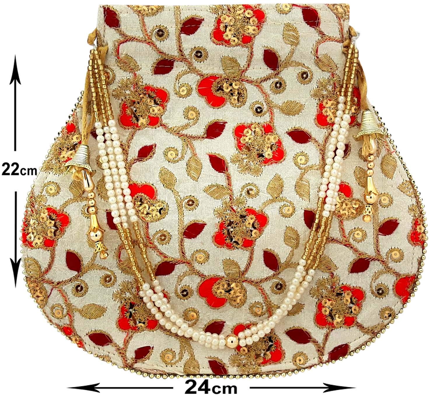 Potli Bag is a Ethnic Stylish Clutch kind of Indian Handbag Potli bag looks very nice with any traditional dresses also goes well with any Casual Indian Dresses. Spacious Compartment that can easily carry today's big smartphonesmobiles and other valuables things. Potli bag are designed for any evening party or casual occasions at any time of the day. Marriage ceremonies to all kind of wedding parties. It can be one of the best gift for any woman. They will just Love it. This Stunning Potli Bag Is Made From Raw Silk With The Embellishment Of Embroidery Sequin Beads And Pearls Etc.