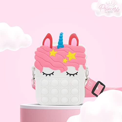 Sling it like a Princess! Make a style statement with this cute & stylish Unicorn sling bag from Princess By RENEE. Made with premium quality silicon which is soft and durable this bag is a perfect accessory to flaunt and store all the makeup goodies from the Princess range. Unicorn sling bag comes with pop fidget buttons and will not cause any harm to children or pets. This multipurpose bag can be used as a vanity pouch a coin purse or whatever a Princess wishes! It comes with a detachable and adjustable strap which makes it more functional and adds to its style quotient. Let your Princess carry it all with style and make stylish entrances wherever she goes.