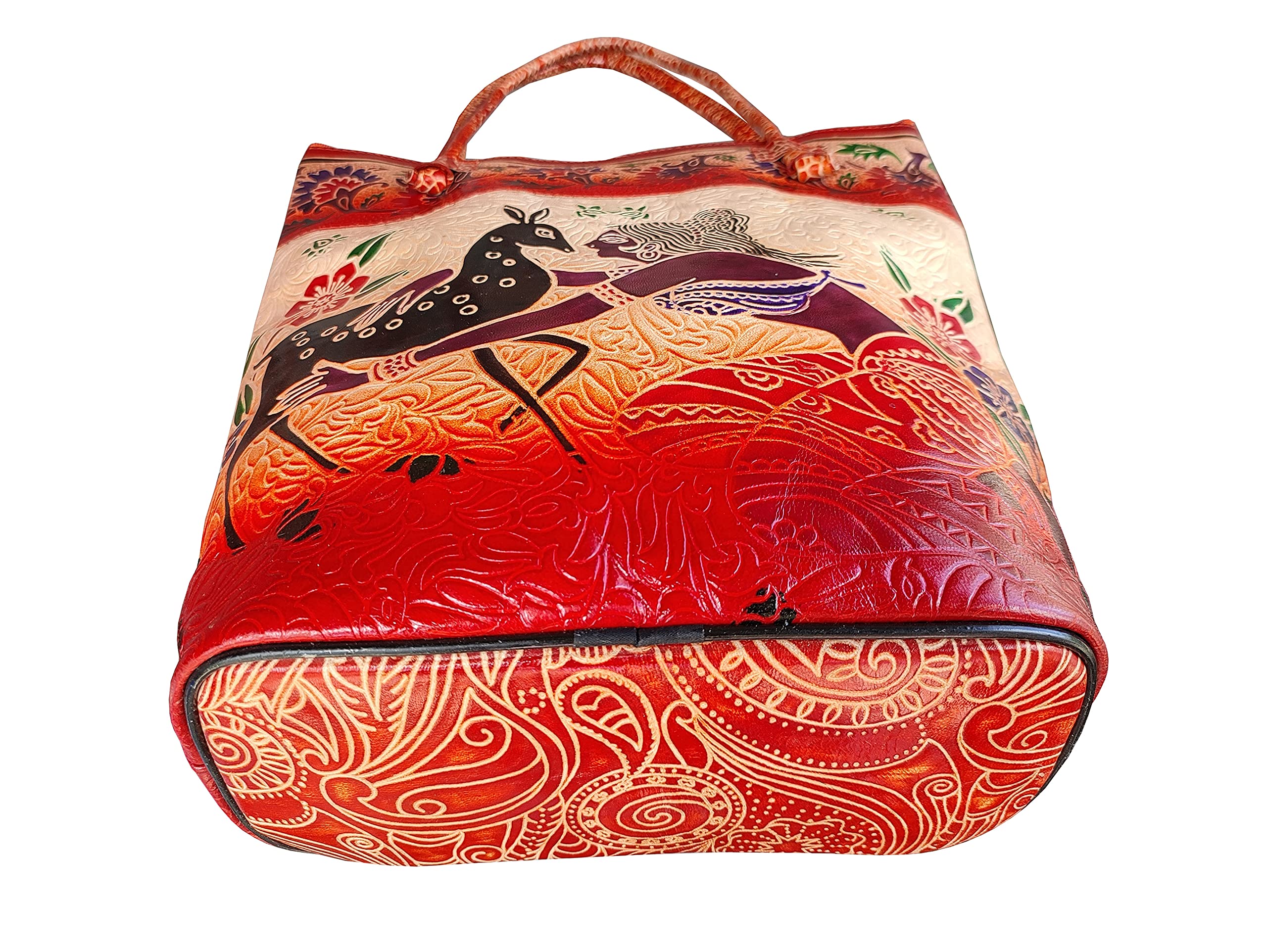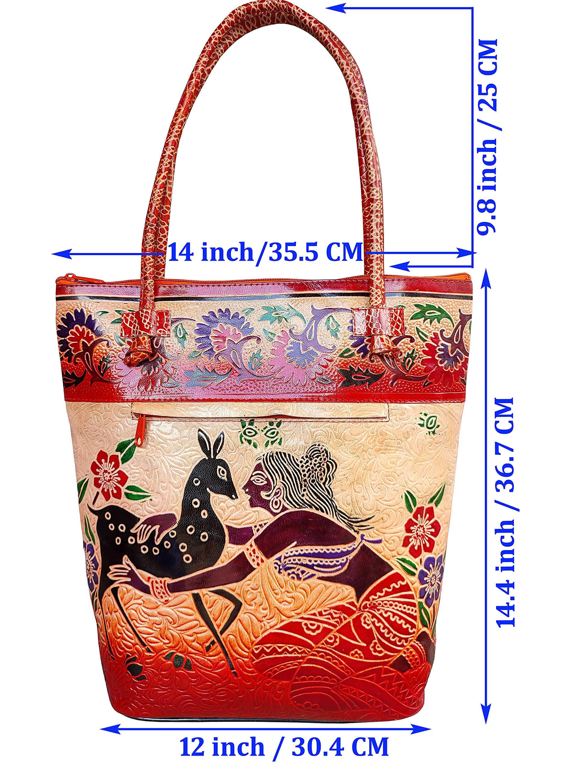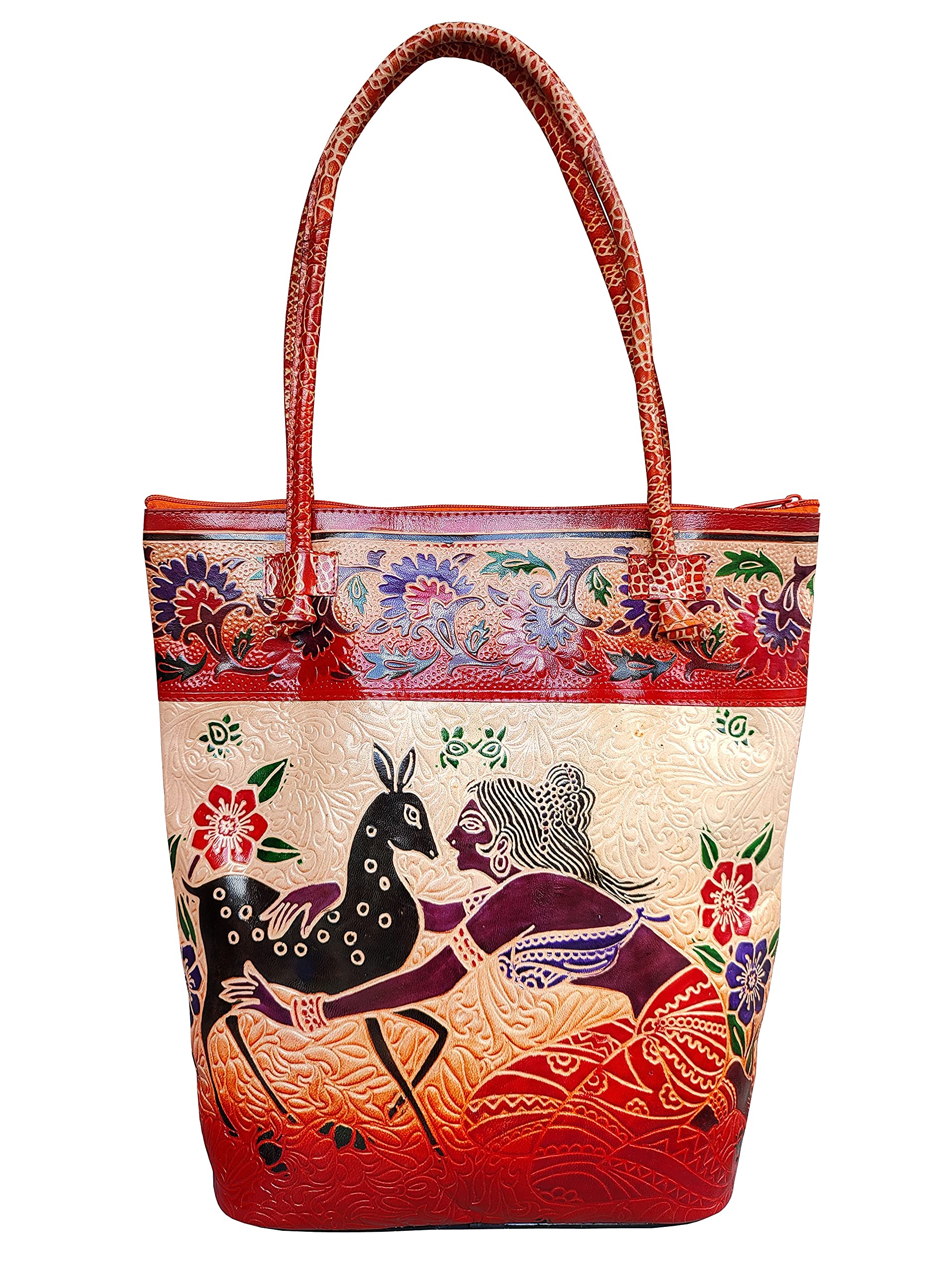 Handcrafted from Genuine Leather a Beautiful Ethnic Art of West Bengal. Design on Both Sides Double Shoulder Tote Handle One Main Zipper compartment One Zipper pocket in Back and Two Compartments inside One zipper and One open cell phone compartment. Closes fully with zip. This purse is a classic example of age old Shantiniketan craft which was introduced in West Bengal India during the 1940s. The Shantiniketan style evolved as a result of the Art Movement and these products have now become world famous for their applique batik and embossed craft work. The process of burnishing the leather gives it an elegant sheen and brings out the colors. The major embossing craft is done by hand and is an intricate process. After the final leather made it is then stitched into the desired product coated with a lacquer finish for making the product shiny and long lasting. We are happy for your interest SHANTINIKETAN EMBOSSED LEATHER PRODUCTS and artist of Shantinikan thanks to you.