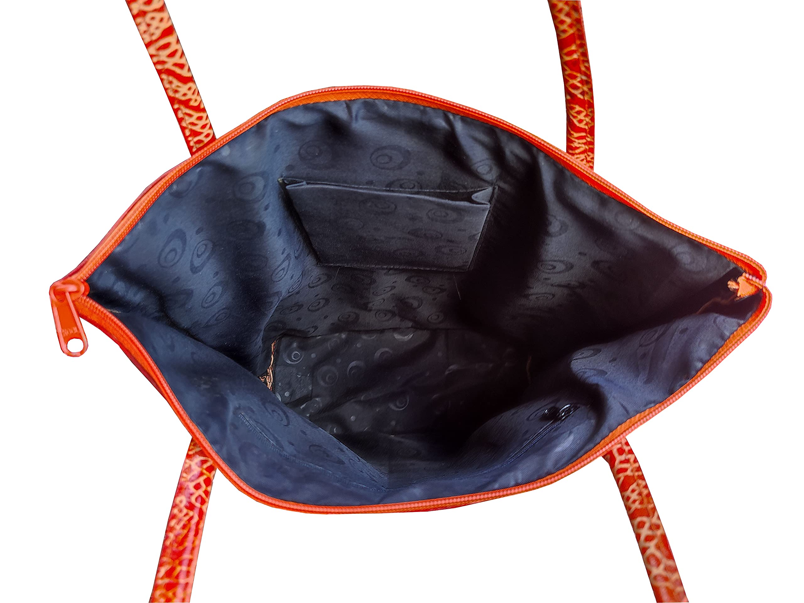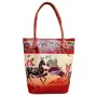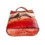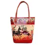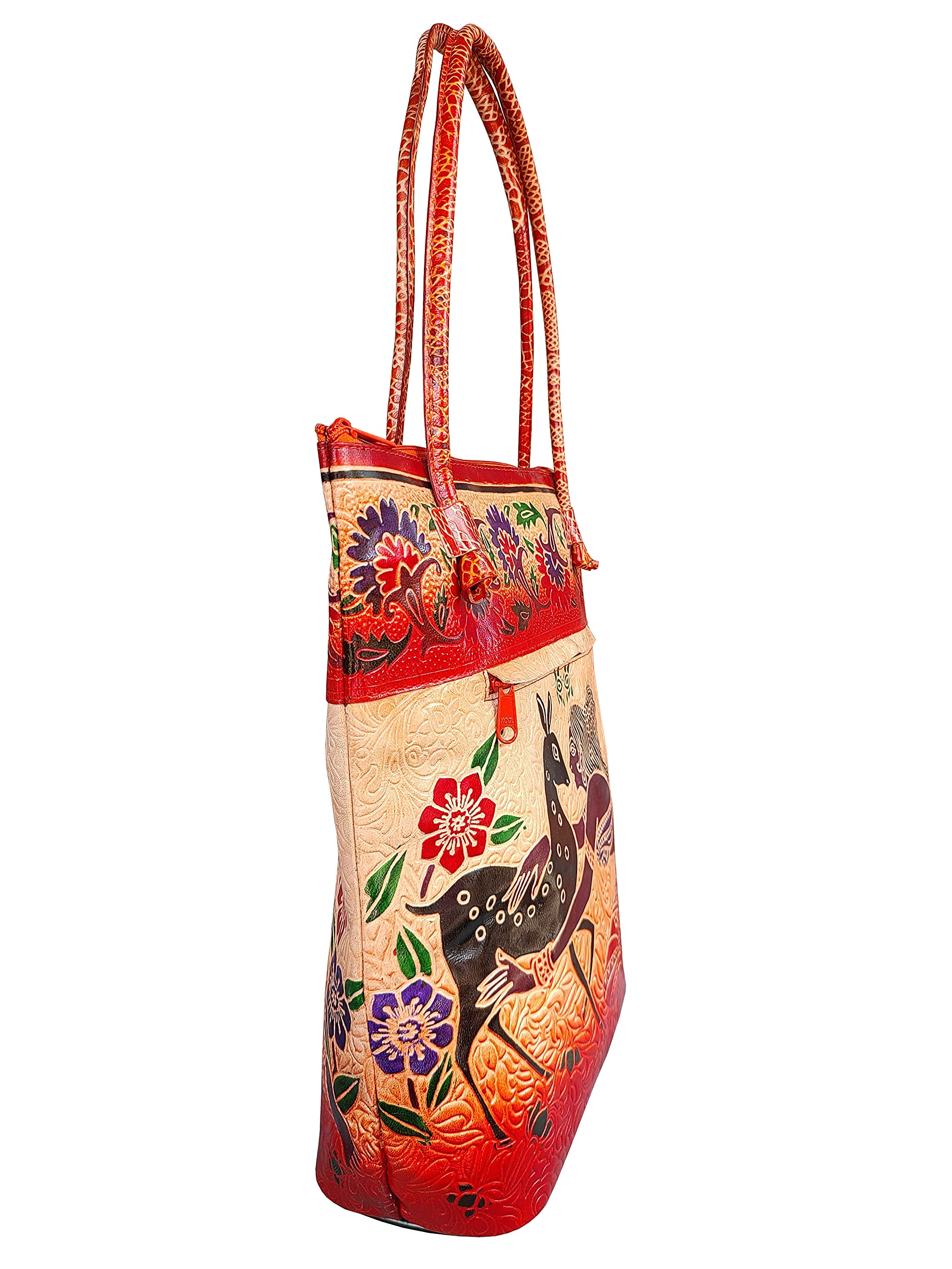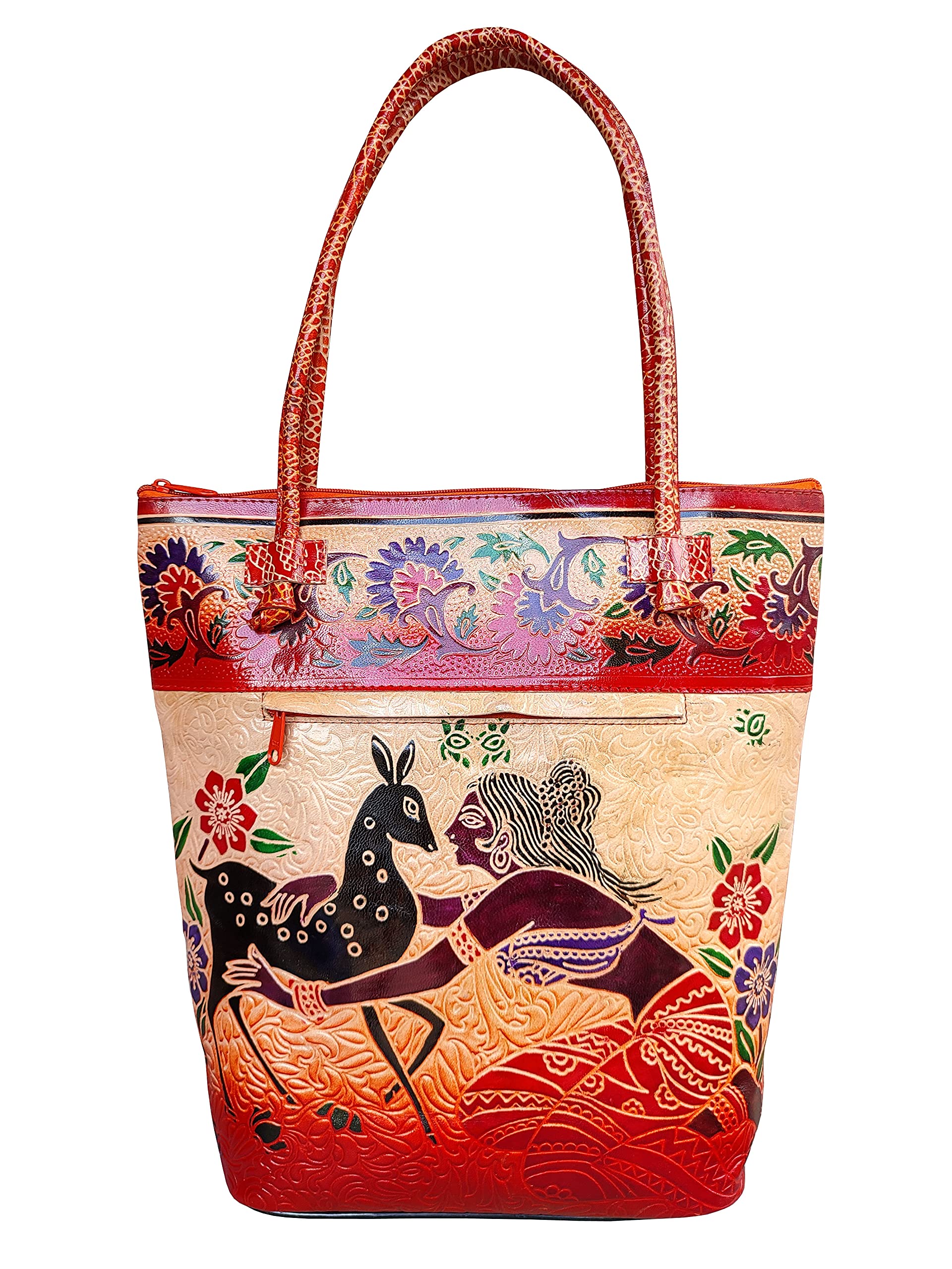 Handcrafted from Genuine Leather a Beautiful Ethnic Art of West Bengal. Design on Both Sides Double Shoulder Tote Handle One Main Zipper compartment One Zipper pocket in Back and Two Compartments inside One zipper and One open cell phone compartment. Closes fully with zip. This purse is a classic example of age old Shantiniketan craft which was introduced in West Bengal India during the 1940s. The Shantiniketan style evolved as a result of the Art Movement and these products have now become world famous for their applique batik and embossed craft work. The process of burnishing the leather gives it an elegant sheen and brings out the colors. The major embossing craft is done by hand and is an intricate process. After the final leather made it is then stitched into the desired product coated with a lacquer finish for making the product shiny and long lasting. We are happy for your interest SHANTINIKETAN EMBOSSED LEATHER PRODUCTS and artist of Shantinikan thanks to you.