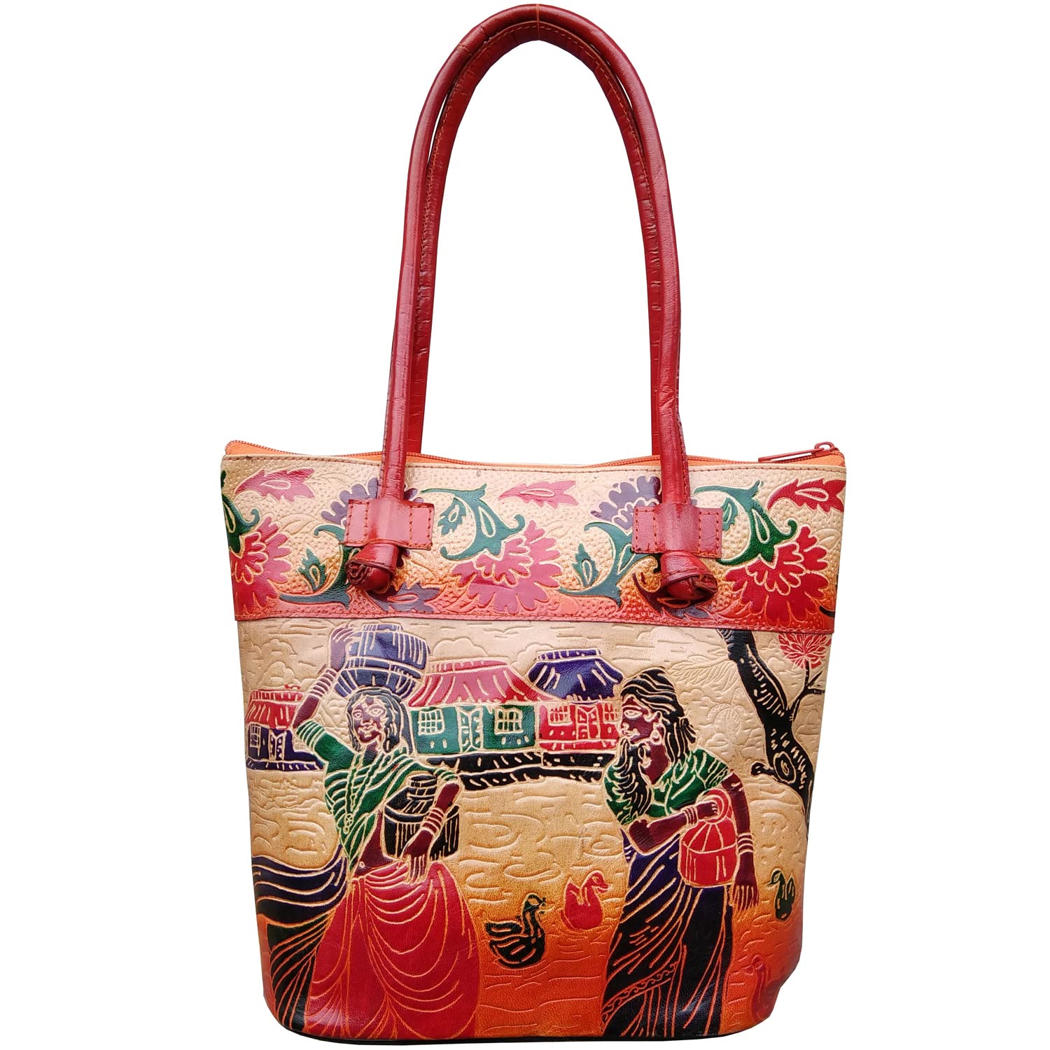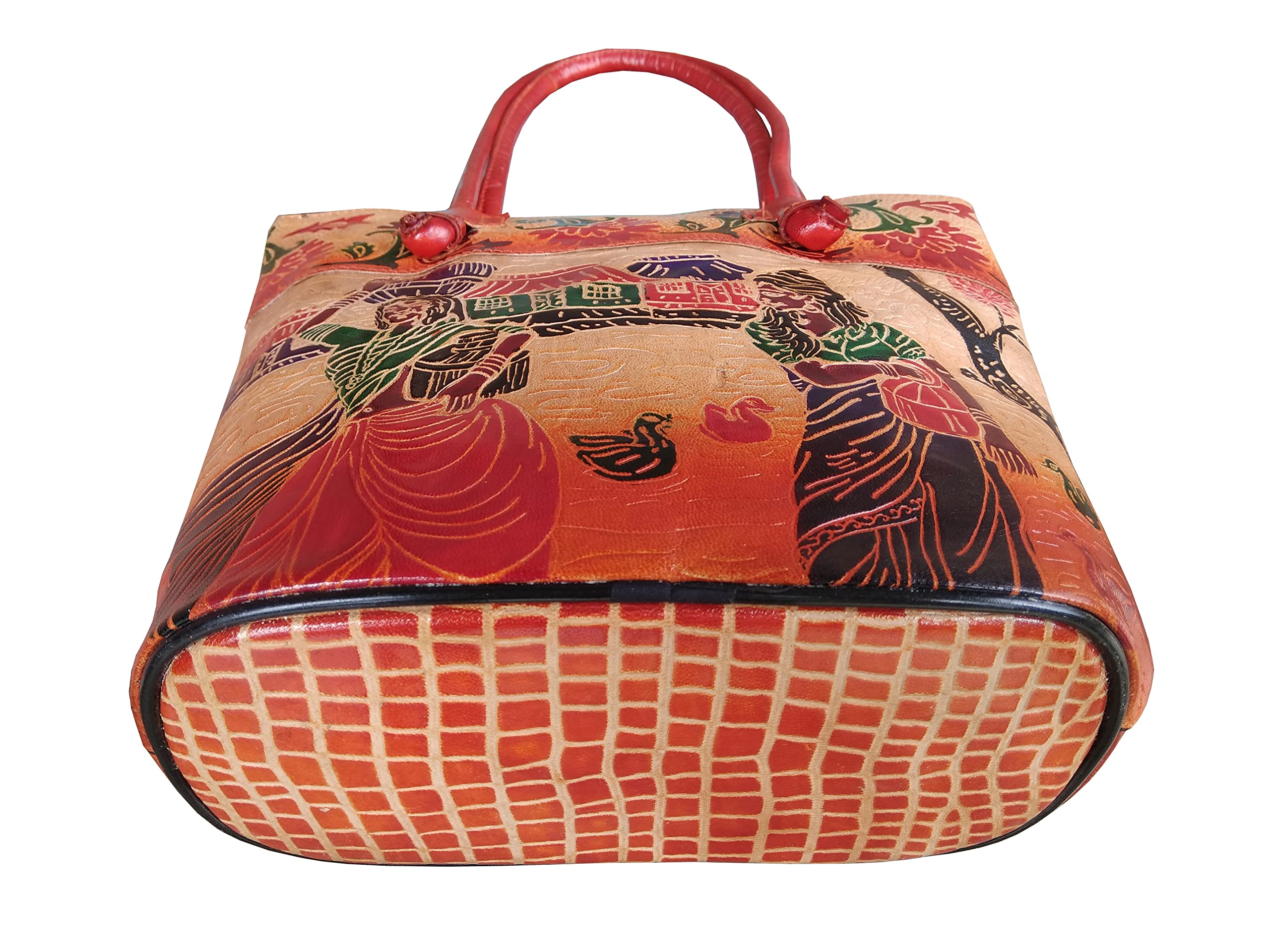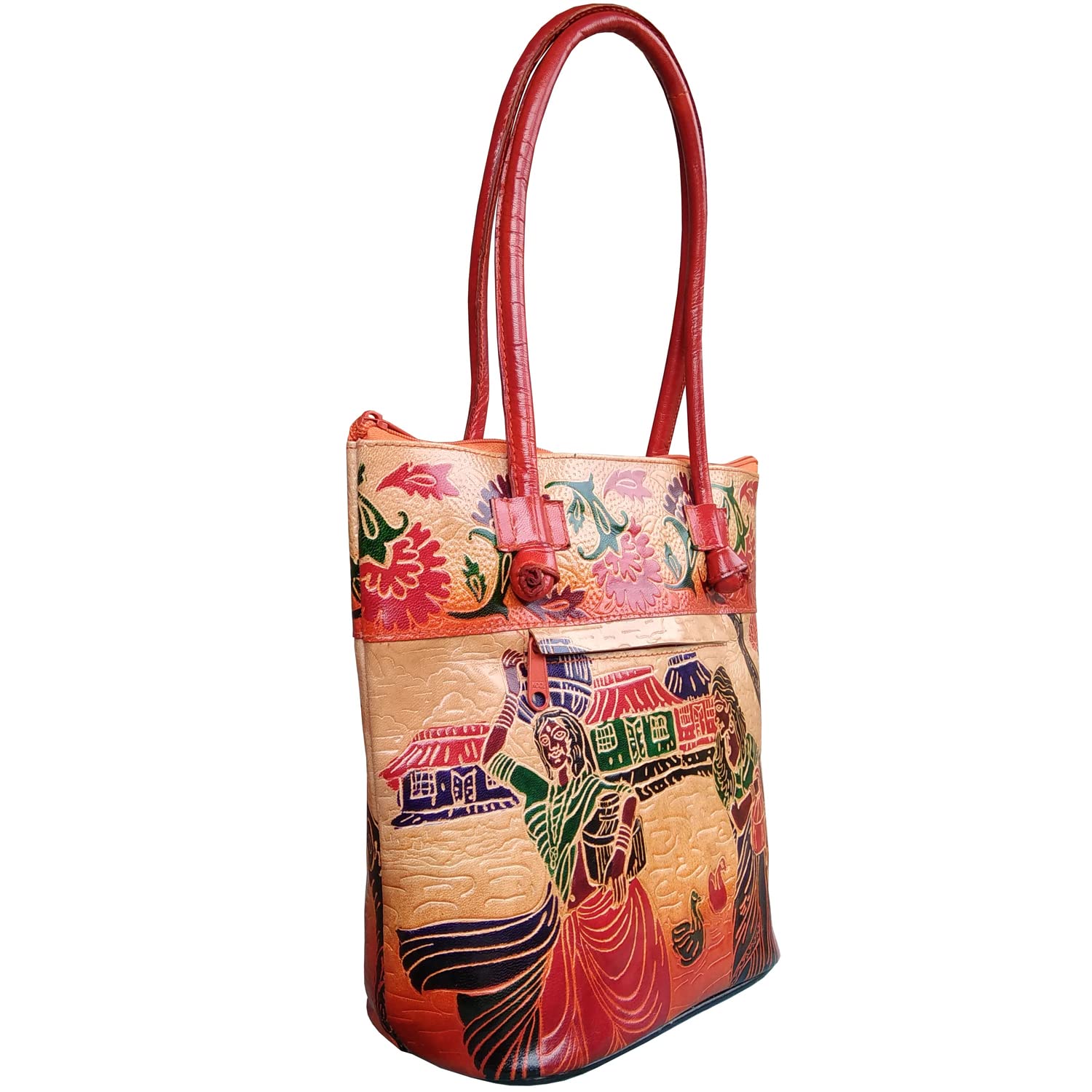 Handcrafted from Genuine Leather a Beautiful Ethnic Art of West Bengal. Design on Both Sides Double Handle One Main Zipper compartment One Zipper pocket in Back and Two Compartments inside One zipper and One open cell phone compartment. Closes fully with zip. This purse is a classic example of age old Shantiniketan craft which was introduced in West Bengal India during the 1940s. The Shantiniketan style evolved as a result of the Art Movement and these products have now become world famous for their applique batik and embossed craft work. The process of burnishing the leather gives it an elegant sheen and brings out the colors. The major embossing craft is done by hand and is an intricate process. After the final leather made it is then stitched into the desired product coated with a lacquer finish for making the product shiny and long lasting. We are happy for your interest SHANTINIKETAN EMBOSSED LEATHER PRODUCTS and artist of Shantinikan thanks to you.