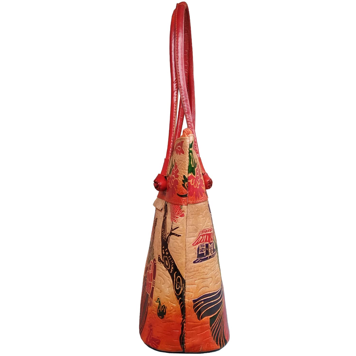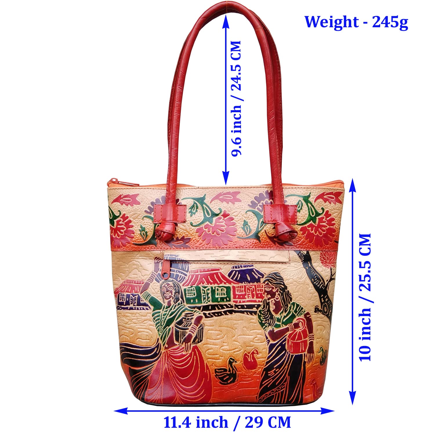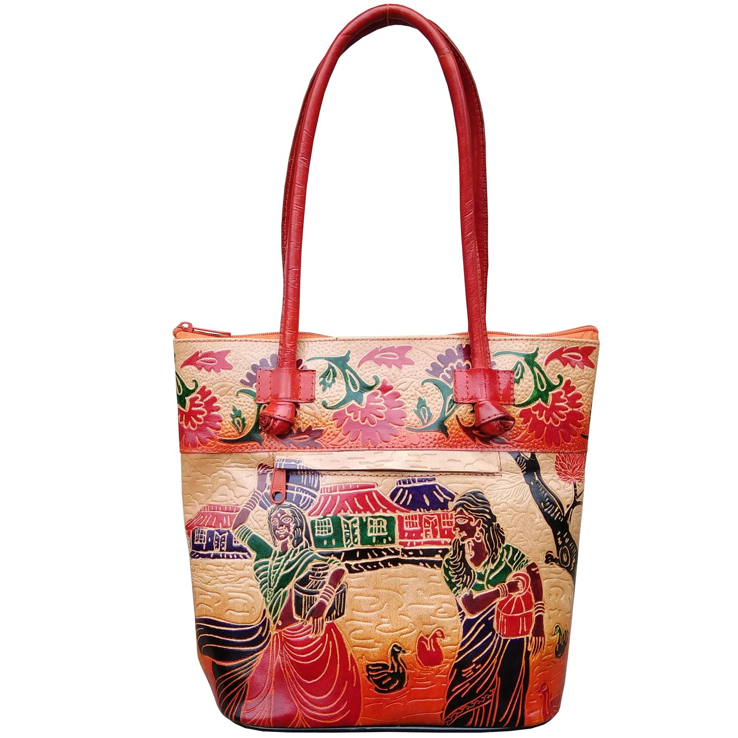 Handcrafted from Genuine Leather a Beautiful Ethnic Art of West Bengal. Design on Both Sides Double Handle One Main Zipper compartment One Zipper pocket in Back and Two Compartments inside One zipper and One open cell phone compartment. Closes fully with zip. This purse is a classic example of age old Shantiniketan craft which was introduced in West Bengal India during the 1940s. The Shantiniketan style evolved as a result of the Art Movement and these products have now become world famous for their applique batik and embossed craft work. The process of burnishing the leather gives it an elegant sheen and brings out the colors. The major embossing craft is done by hand and is an intricate process. After the final leather made it is then stitched into the desired product coated with a lacquer finish for making the product shiny and long lasting. We are happy for your interest SHANTINIKETAN EMBOSSED LEATHER PRODUCTS and artist of Shantinikan thanks to you.