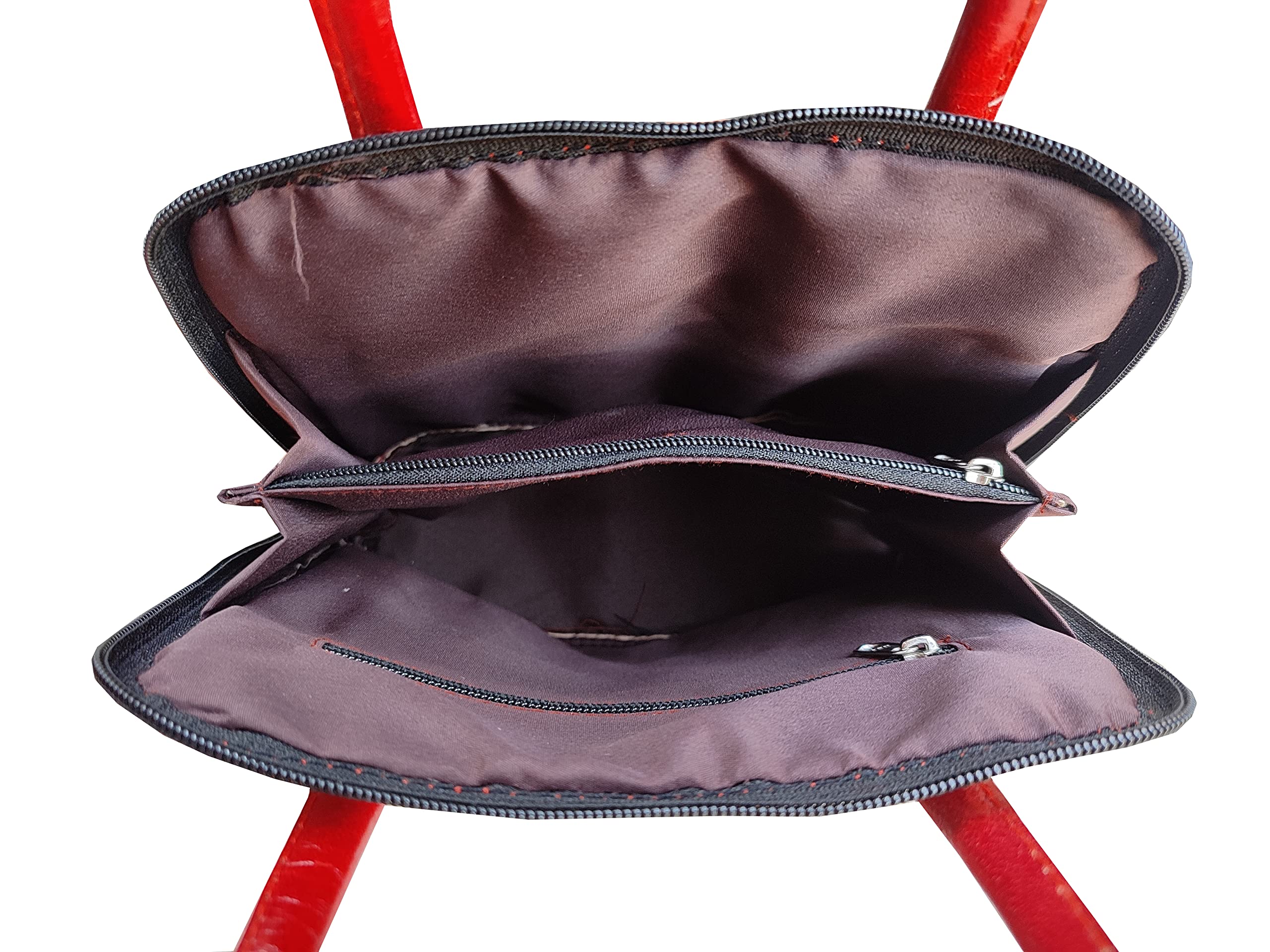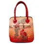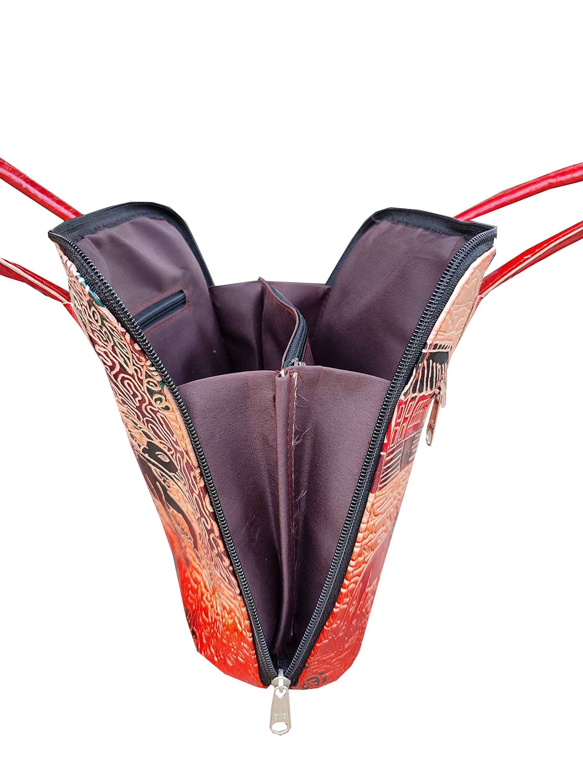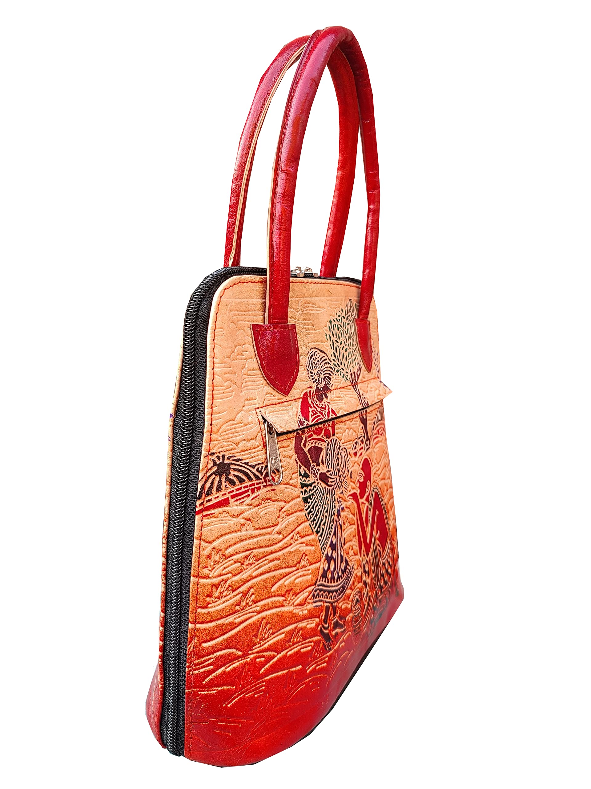 Handcrafted from Genuine Leather a Beautiful Ethnic Art of West Bengal. Design on Both Sides Double Handle One Main Zipper compartment One Zipper pocket in Back and Two zipper Compartments inside Closes fully with zip. This purse is a classic example of age old Shantiniketan craft which was introduced in West Bengal India during the 1940s. The Shantiniketan style evolved as a result of the Art Movement and these products have now become world famous for their applique batik and embossed craft work. The process of burnishing the leather gives it an elegant sheen and brings out the colors. The major embossing craft is done by hand and is an intricate process. After the final leather made it is then stitched into the desired product coated with a lacquer finish for making the product shiny and long lasting. We are happy for your interest SHANTINIKETAN EMBOSSED LEATHER PRODUCTS and artist of Shantinikan thanks to you.