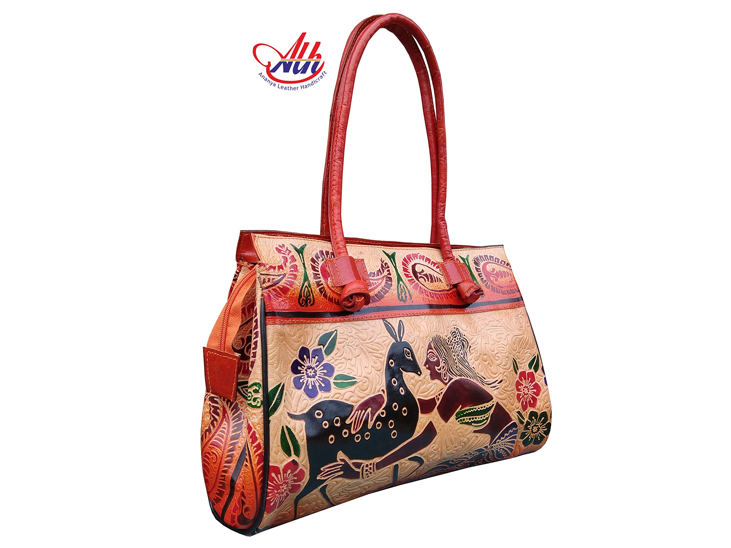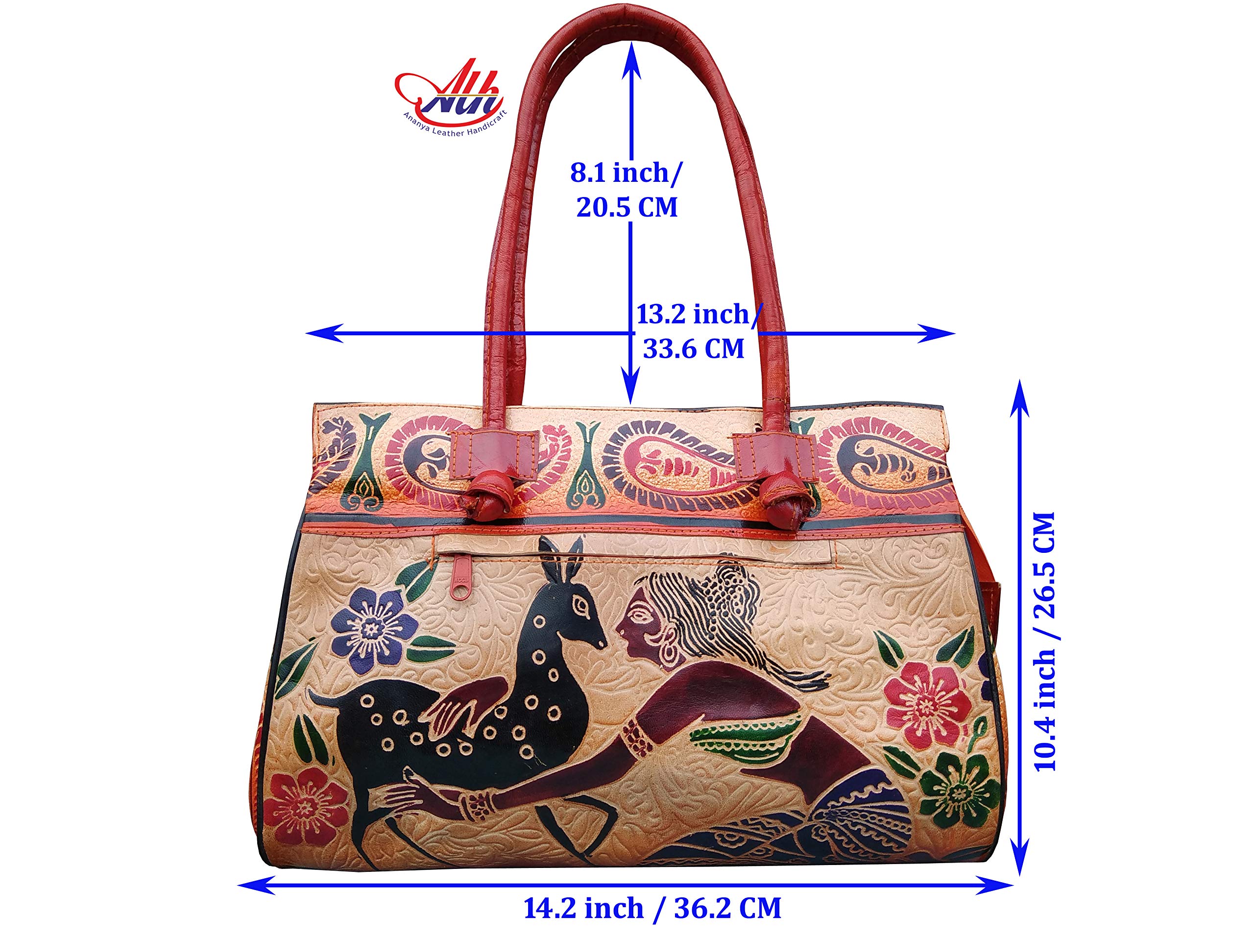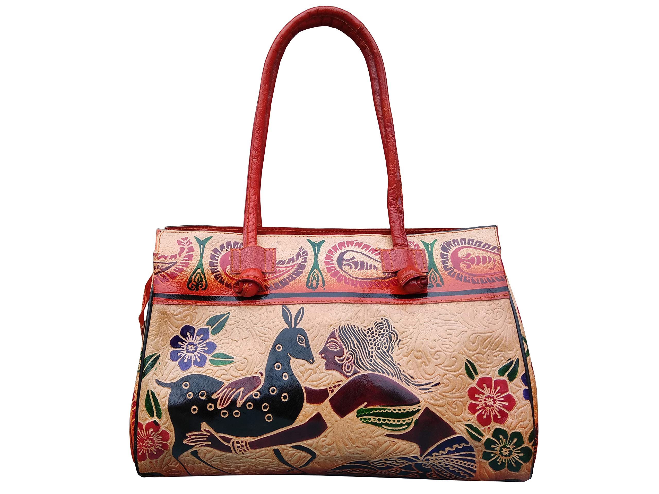 Handcrafted from Genuine Leather a Beautiful Ethnic Art of West Bengal. A Definite Eye-Catcher in any Event and Carries your Essentials Easily. Design on Both Sides Double Shoulder Tote Handle One Main Zipper compartment One Zipper pocket in Back and Three Compartments inside Two zipper and One open cell phone compartment. Closes fully with zip. This purse is a classic example of age old Shantiniketan craft which was introduced in West Bengal India during the 1940s. The Shantiniketan style evolved as a result of the Art Movement and these products have now become world famous for their applique batik and embossed craft work. The process of burnishing the leather gives it an elegant sheen and brings out the colors. The major embossing craft is done by hand and is an intricate process. After the final leather made it is then stitched into the desired product coated with a lacquer finish for making the product shiny and long lasting. We are happy for your interest SHANTINIKETAN EMBOSSED LEATHER PRODUCTS and artist of Shantinikan thanks to you.
