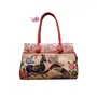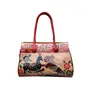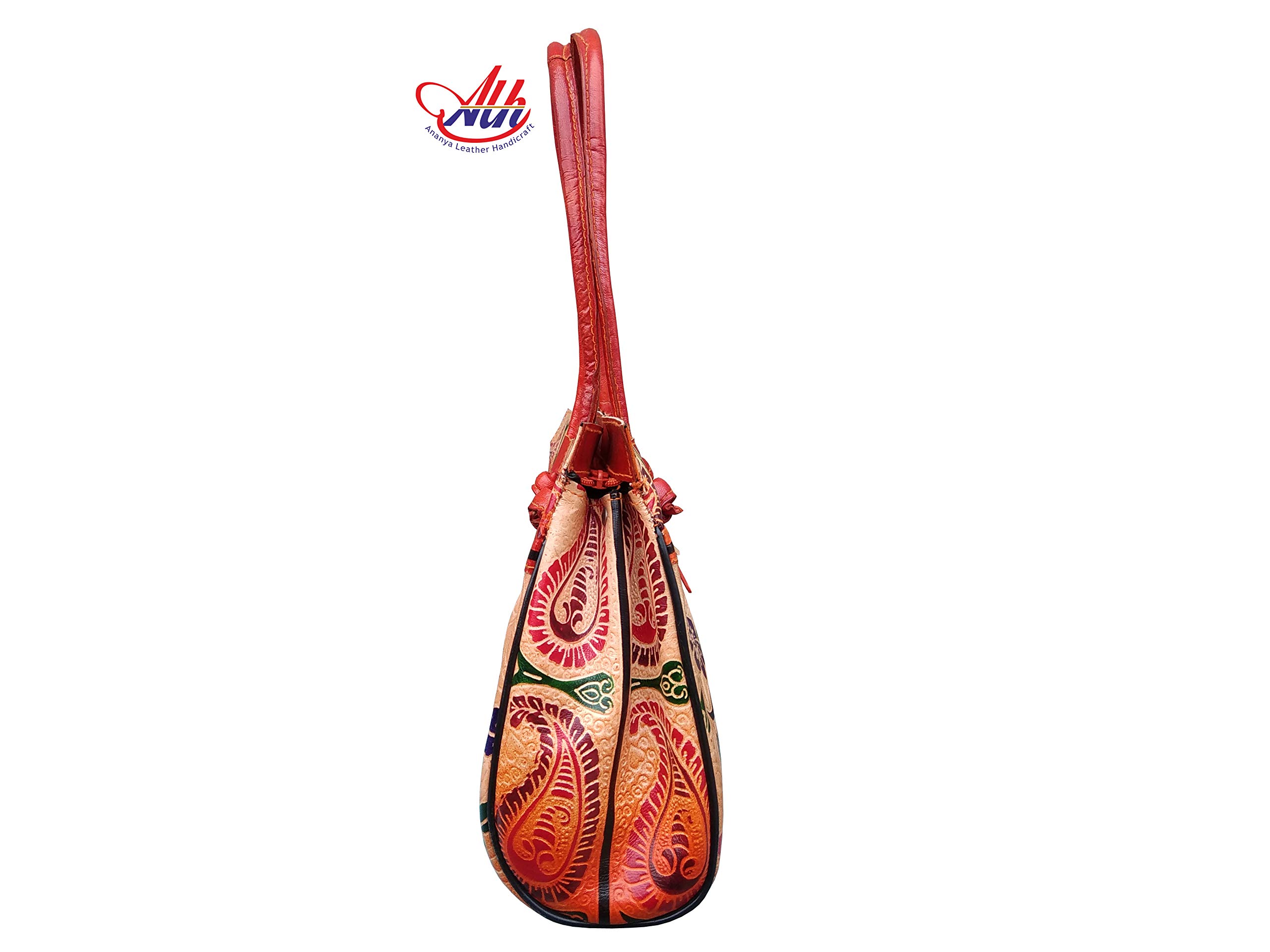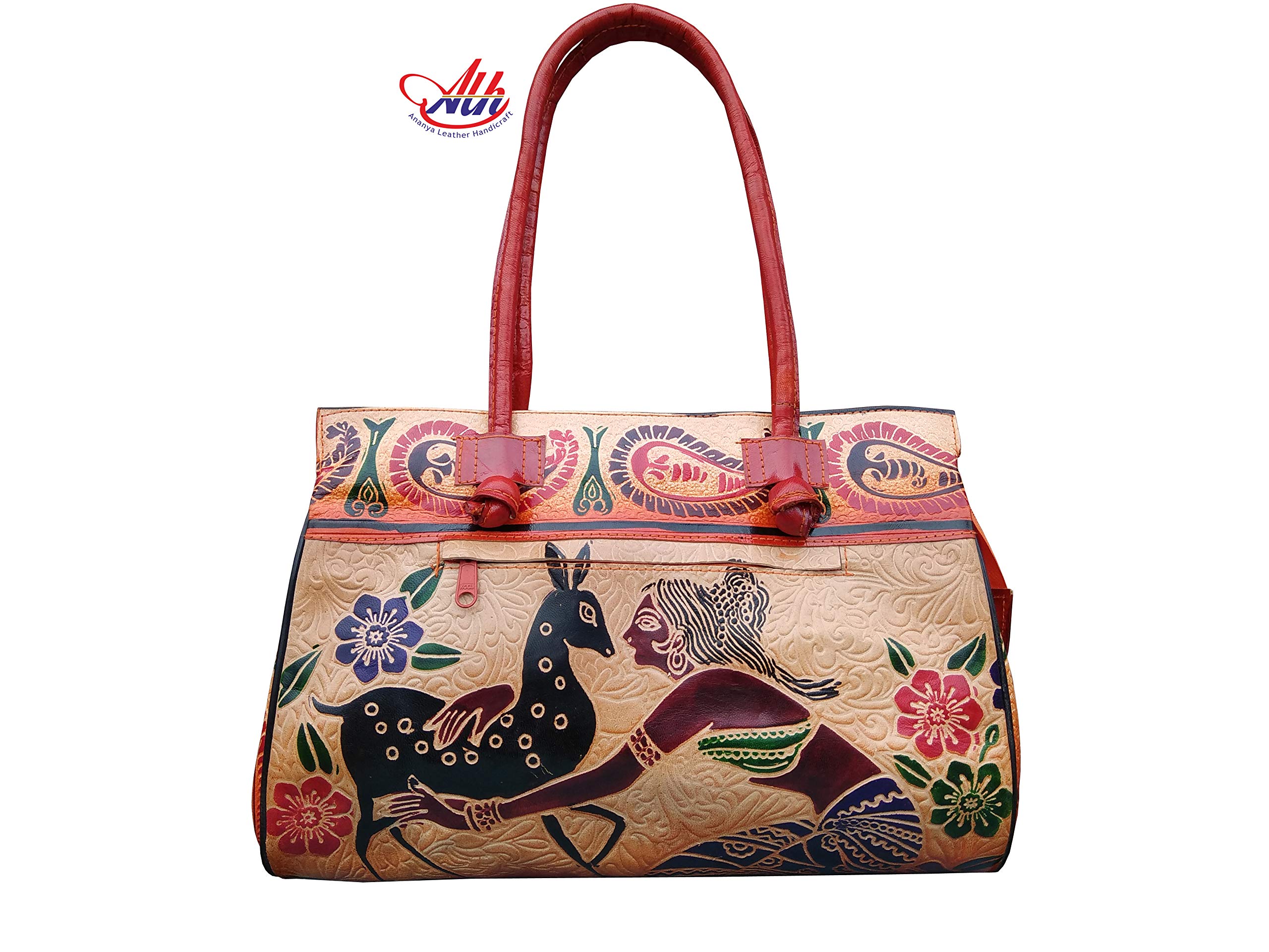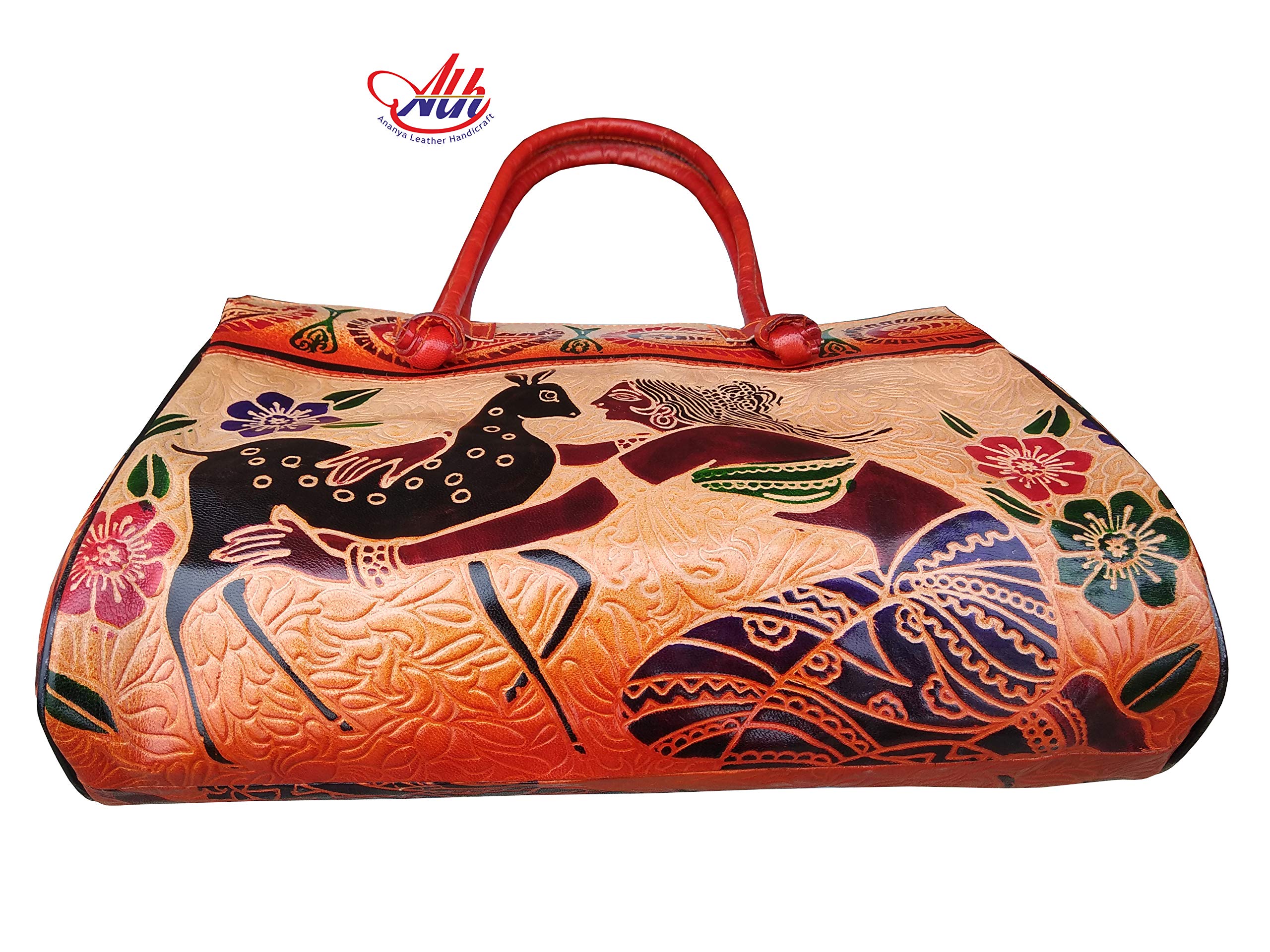 Handcrafted from Genuine Leather a Beautiful Ethnic Art of West Bengal. A Definite Eye-Catcher in any Event and Carries your Essentials Easily. Design on Both Sides Double Shoulder Tote Handle One Main Zipper compartment One Zipper pocket in Back and Three Compartments inside Two zipper and One open cell phone compartment. Closes fully with zip. This purse is a classic example of age old Shantiniketan craft which was introduced in West Bengal India during the 1940s. The Shantiniketan style evolved as a result of the Art Movement and these products have now become world famous for their applique batik and embossed craft work. The process of burnishing the leather gives it an elegant sheen and brings out the colors. The major embossing craft is done by hand and is an intricate process. After the final leather made it is then stitched into the desired product coated with a lacquer finish for making the product shiny and long lasting. We are happy for your interest SHANTINIKETAN EMBOSSED LEATHER PRODUCTS and artist of Shantinikan thanks to you.