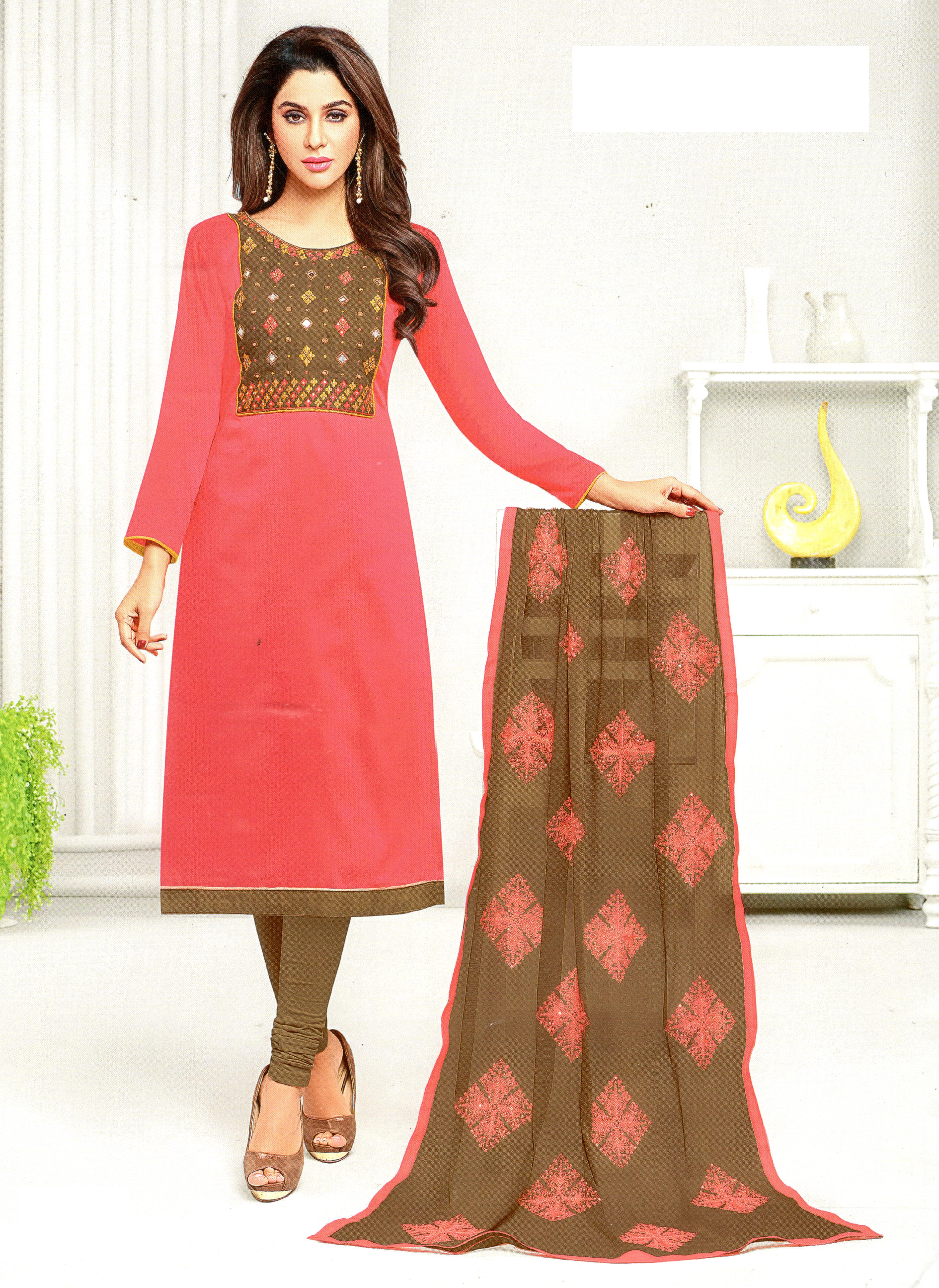 MAHATI cotton pink embroidered salwar suits - Top 2.5m Bottom 2.4 m Dupatta 2.5 m. For stitched suits (with lining) - Size in Inches: Height 46 - Size :S 36 M 38 L 40 XL 42 XXL 44 3XL 46 4XL 48 5XL 50 - Handwash - Dry in Shade - YOU MAKE A MARK WHEN YOU WEAR MAHATI