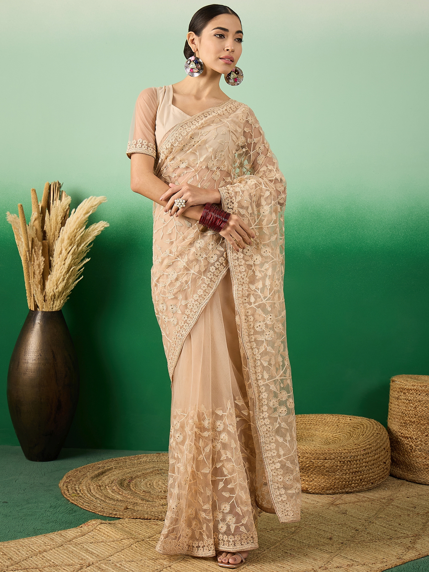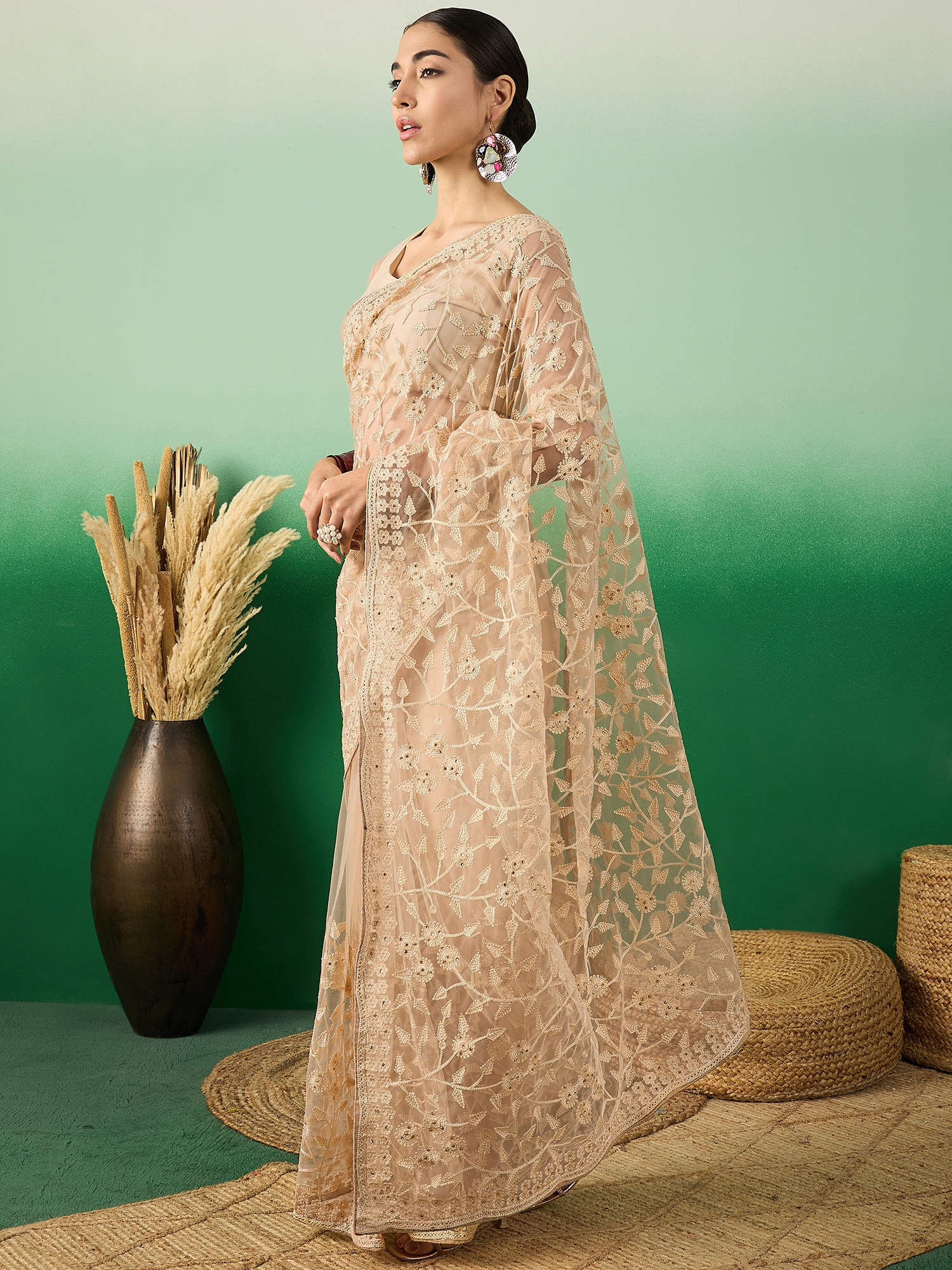 Fashion Dream Womens Beige Net Saree | Soft & Elegant Traditional Wear