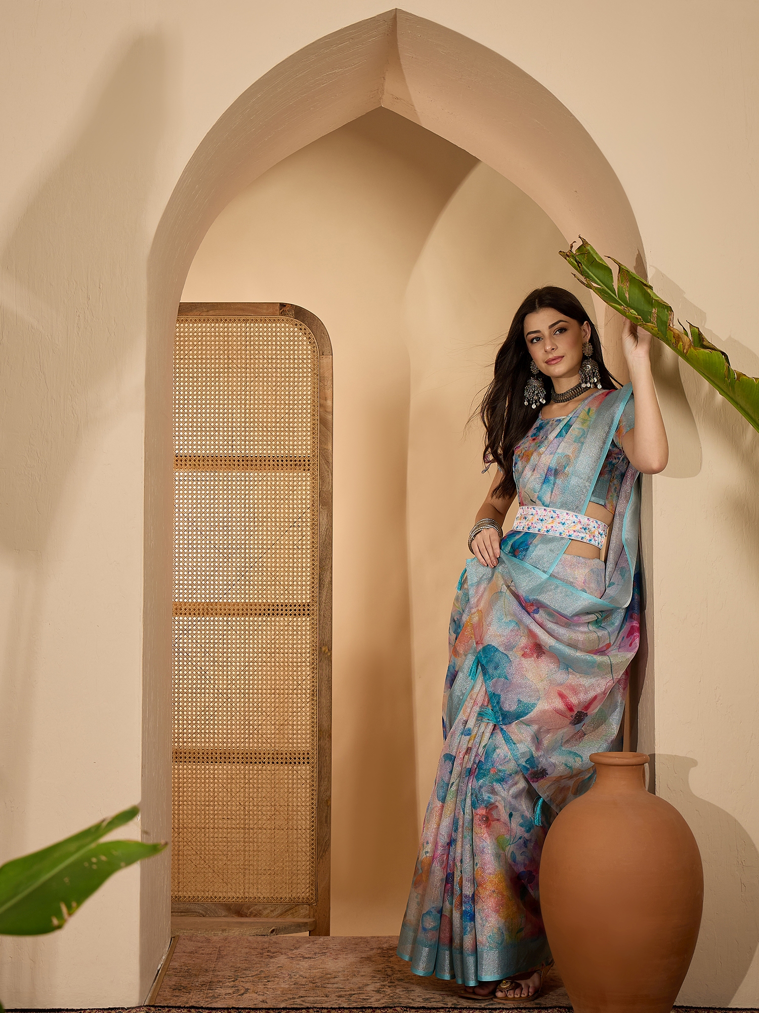 • Saree Work-Digital Print ,Blouse Work- Linen Zari Silver