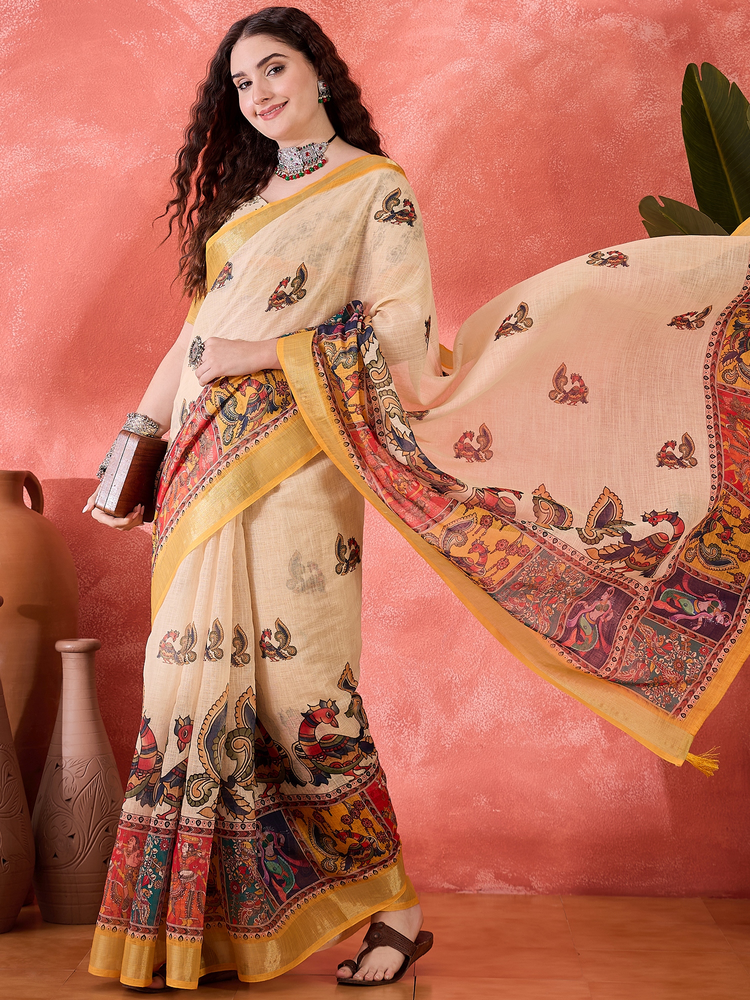 Fashion Dream Womens Cream Linen Cotton Blend Saree | Soft & Elegant Traditional Wear