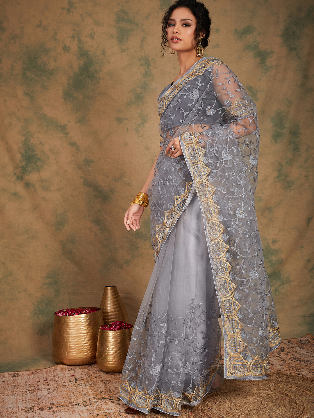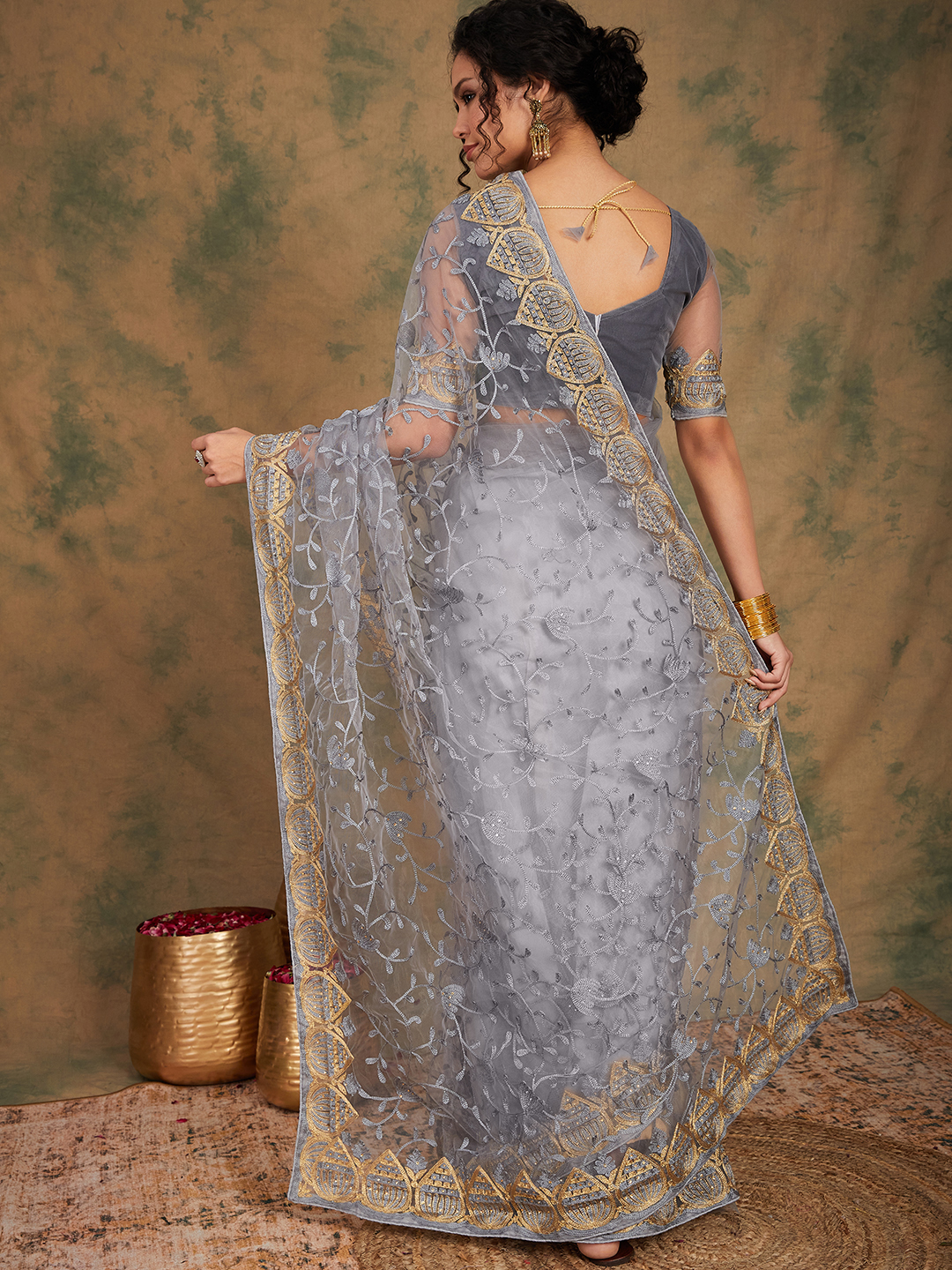 Fashion Dream Womens Grey Net Saree | Soft & Elegant Traditional Wear