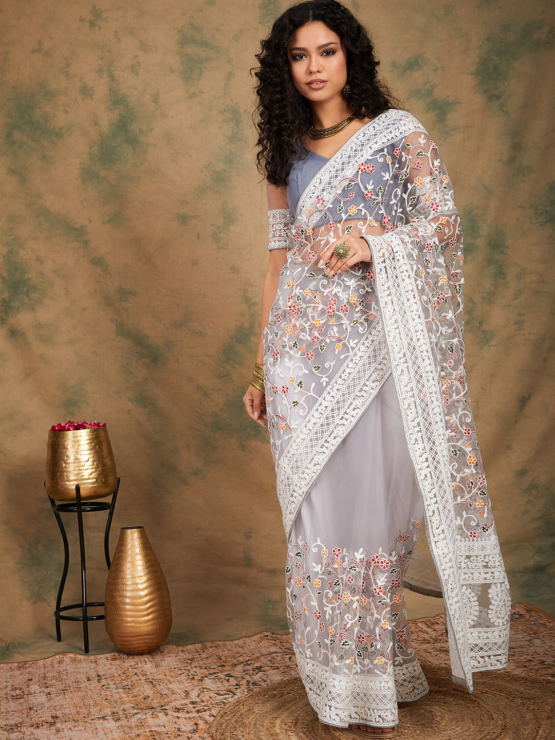 AASTHA FASHION Fashion Dream Womens Grey Net Saree | Soft & Elegant Traditional Wear