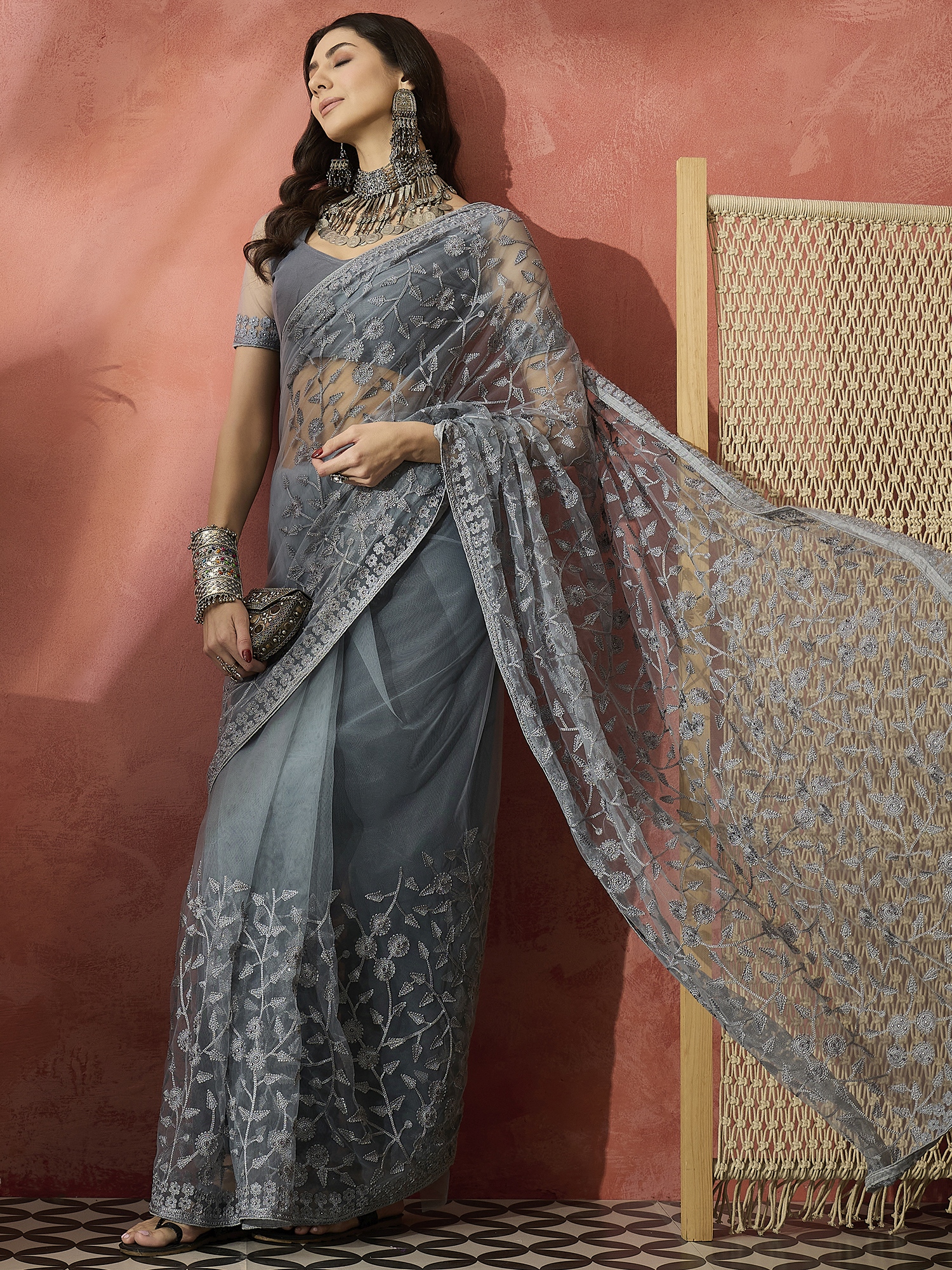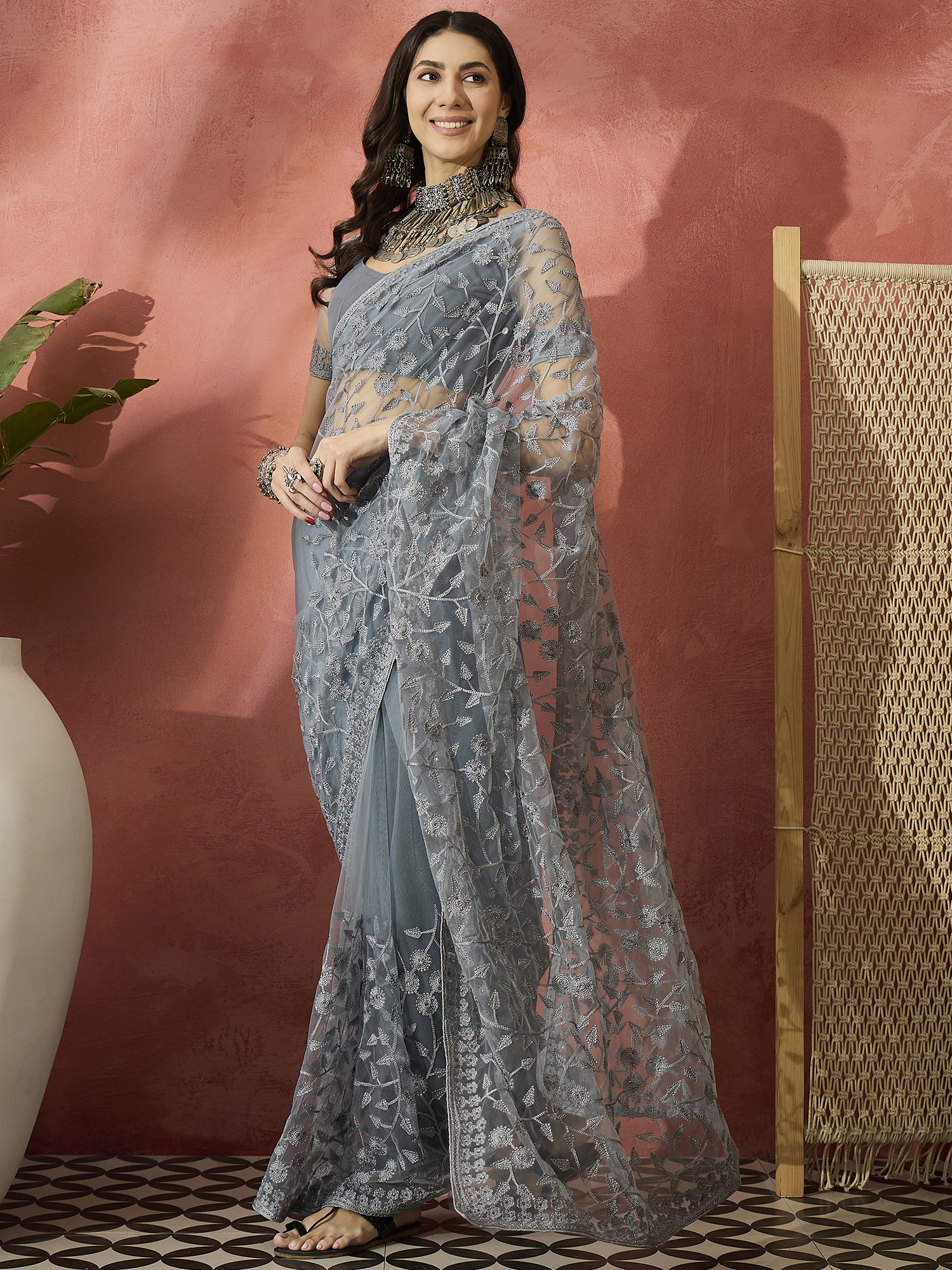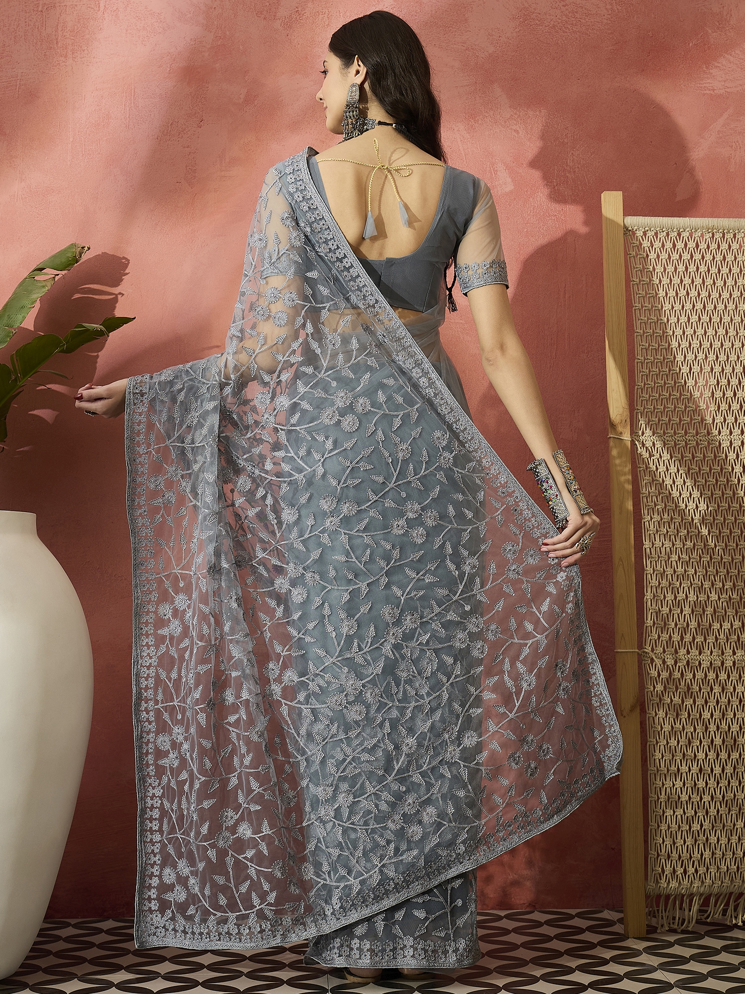 Fashion Dream Womens Light Grey Net Saree | Soft & Elegant Traditional Wear