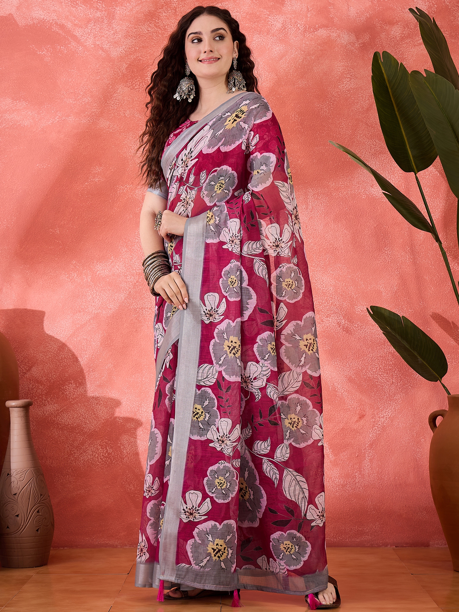 Fashion Dream Womens Magenta Linen Cotton Blend Saree | Soft & Elegant Traditional Wear
