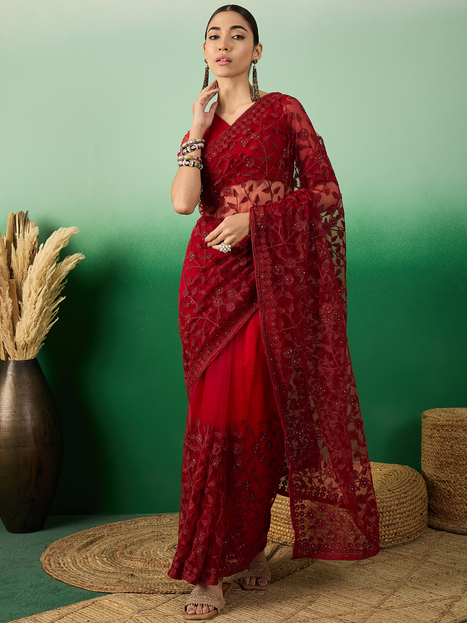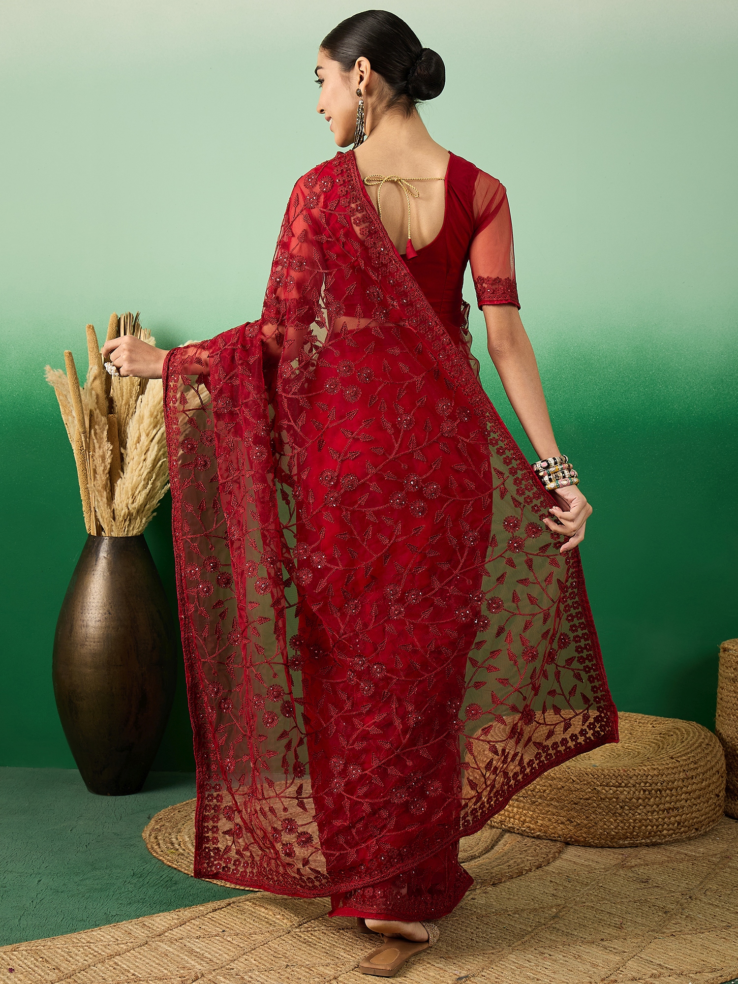 Fashion Dream Womens Maroon Net Saree | Soft & Elegant Traditional Wear