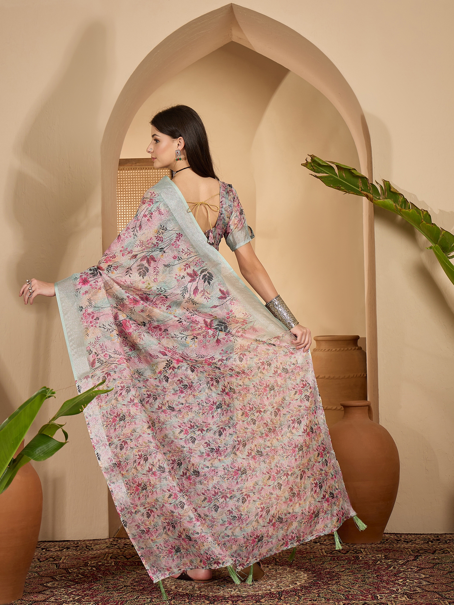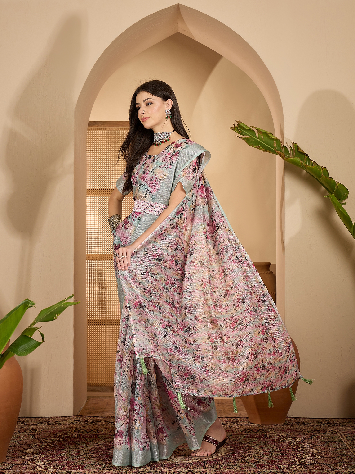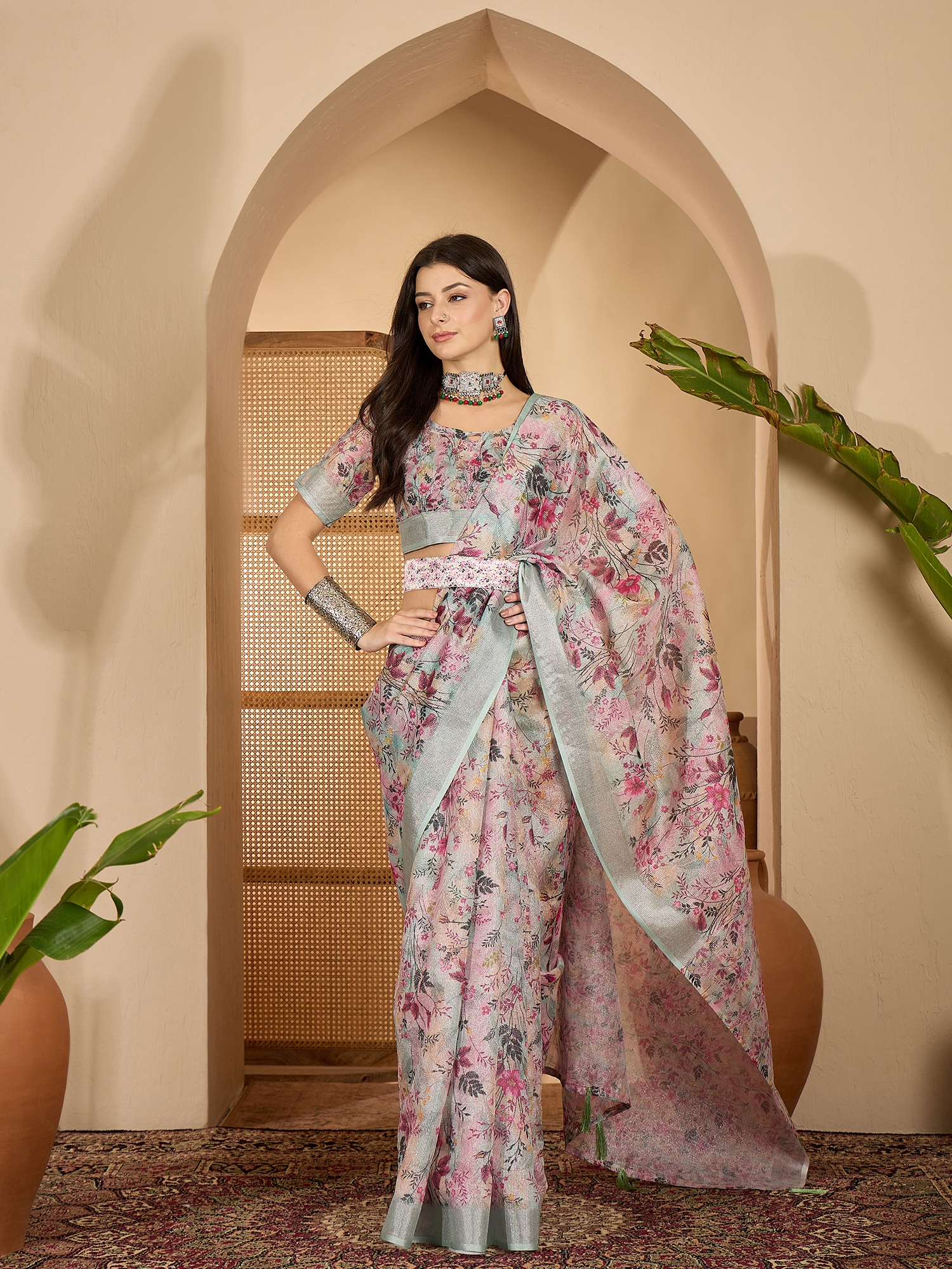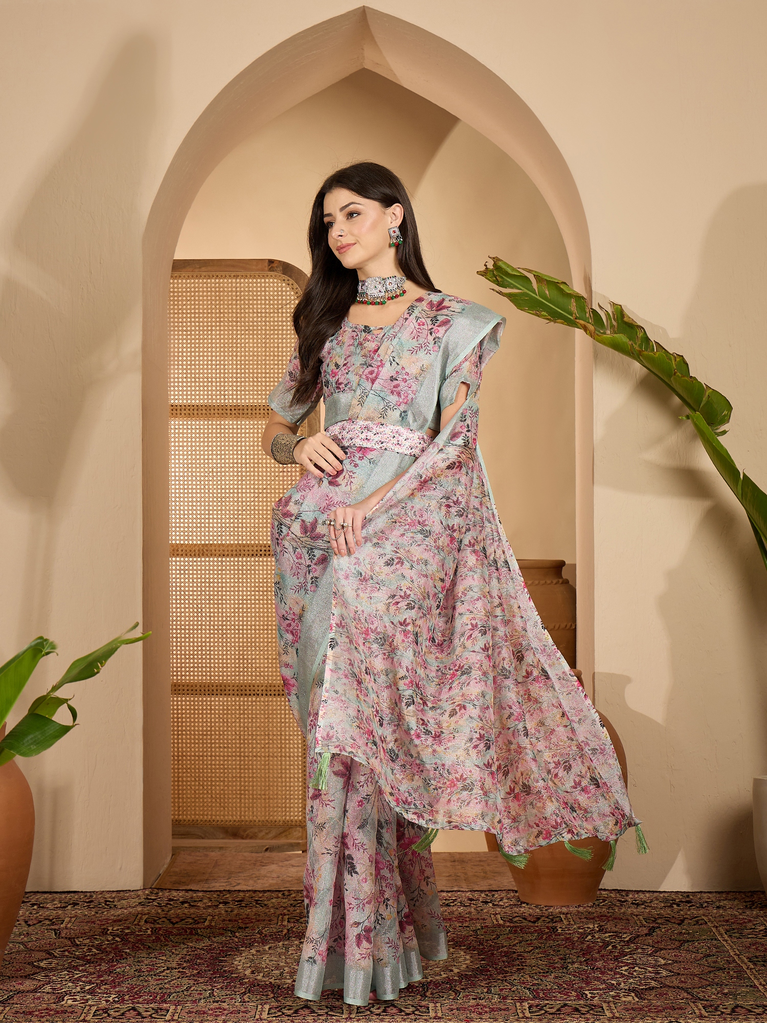 • Saree Work-Digital Print ,Blouse Work- Linen Zari Silver