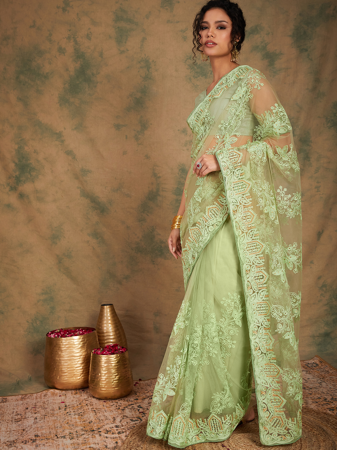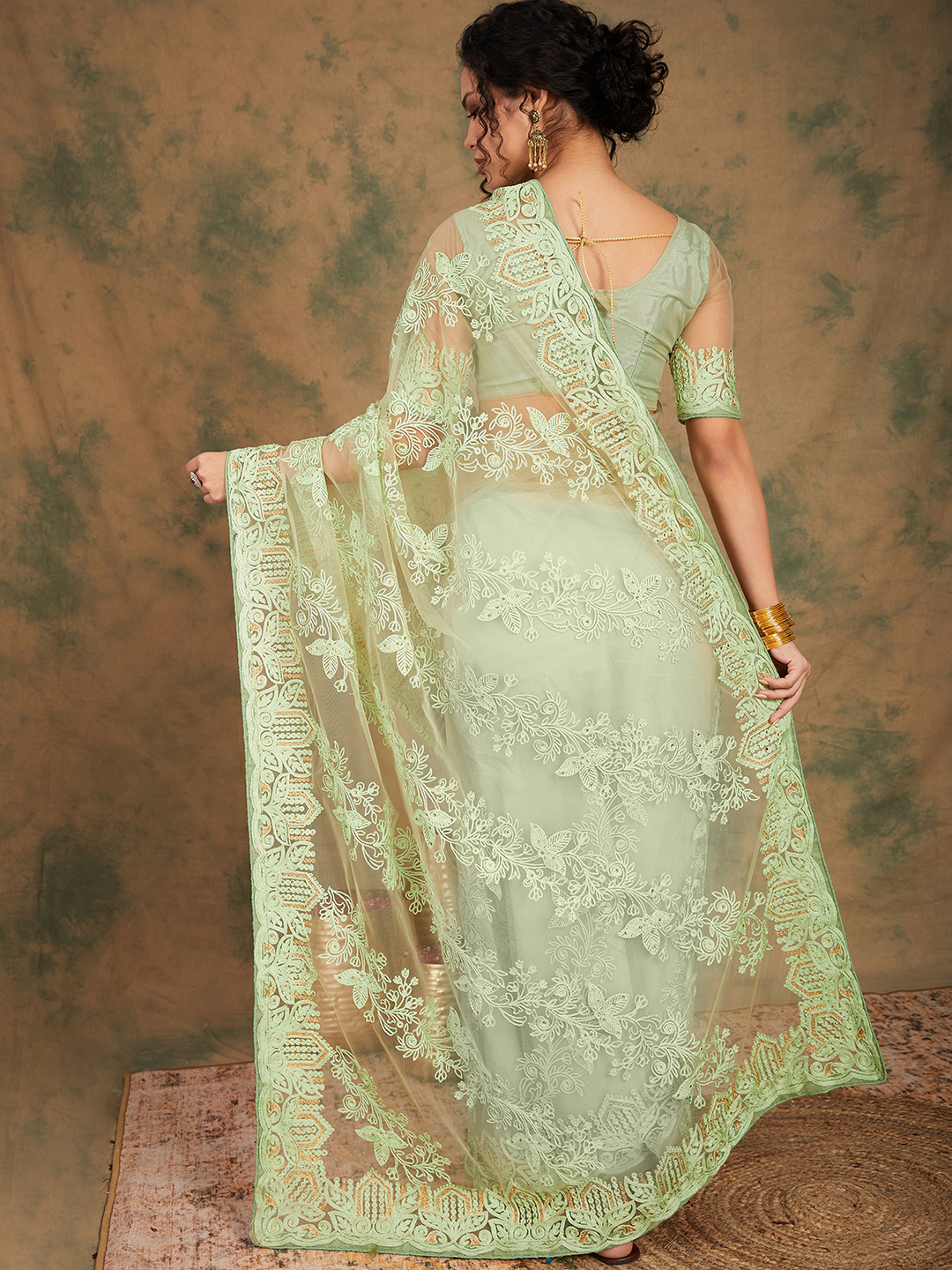 Fashion Dream Womens Pista Green Net Saree | Soft & Elegant Traditional Wear