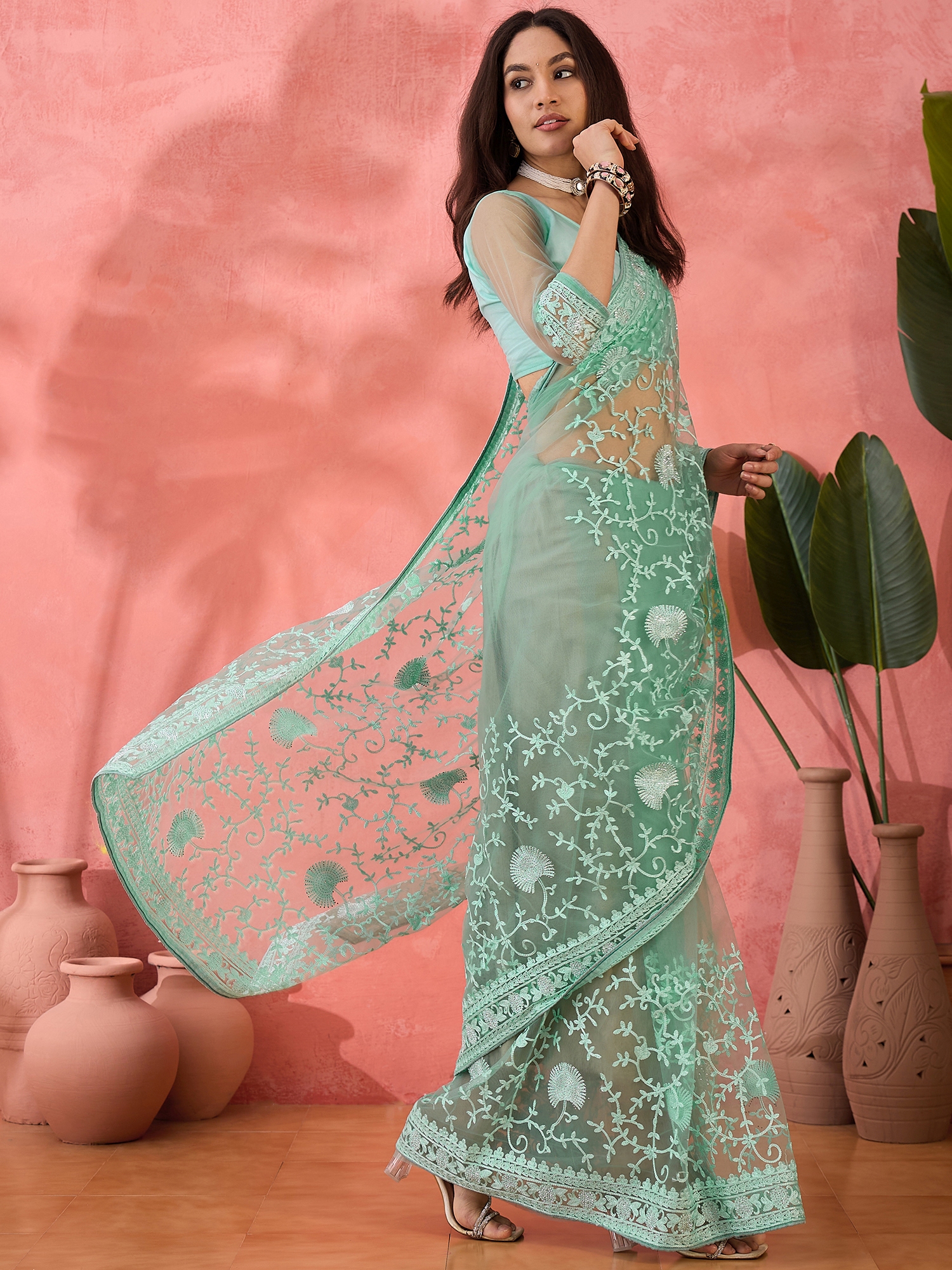 AASTHA FASHION Fashion Dream Womens Sea Green Net Saree | Soft & Elegant Traditional Wear