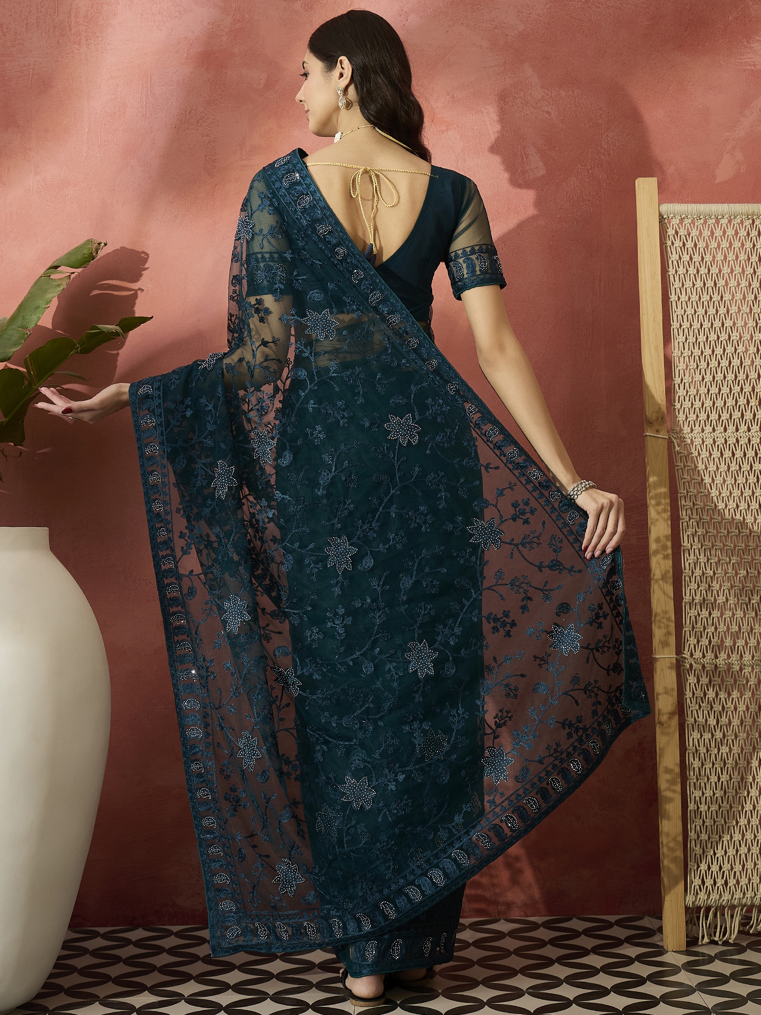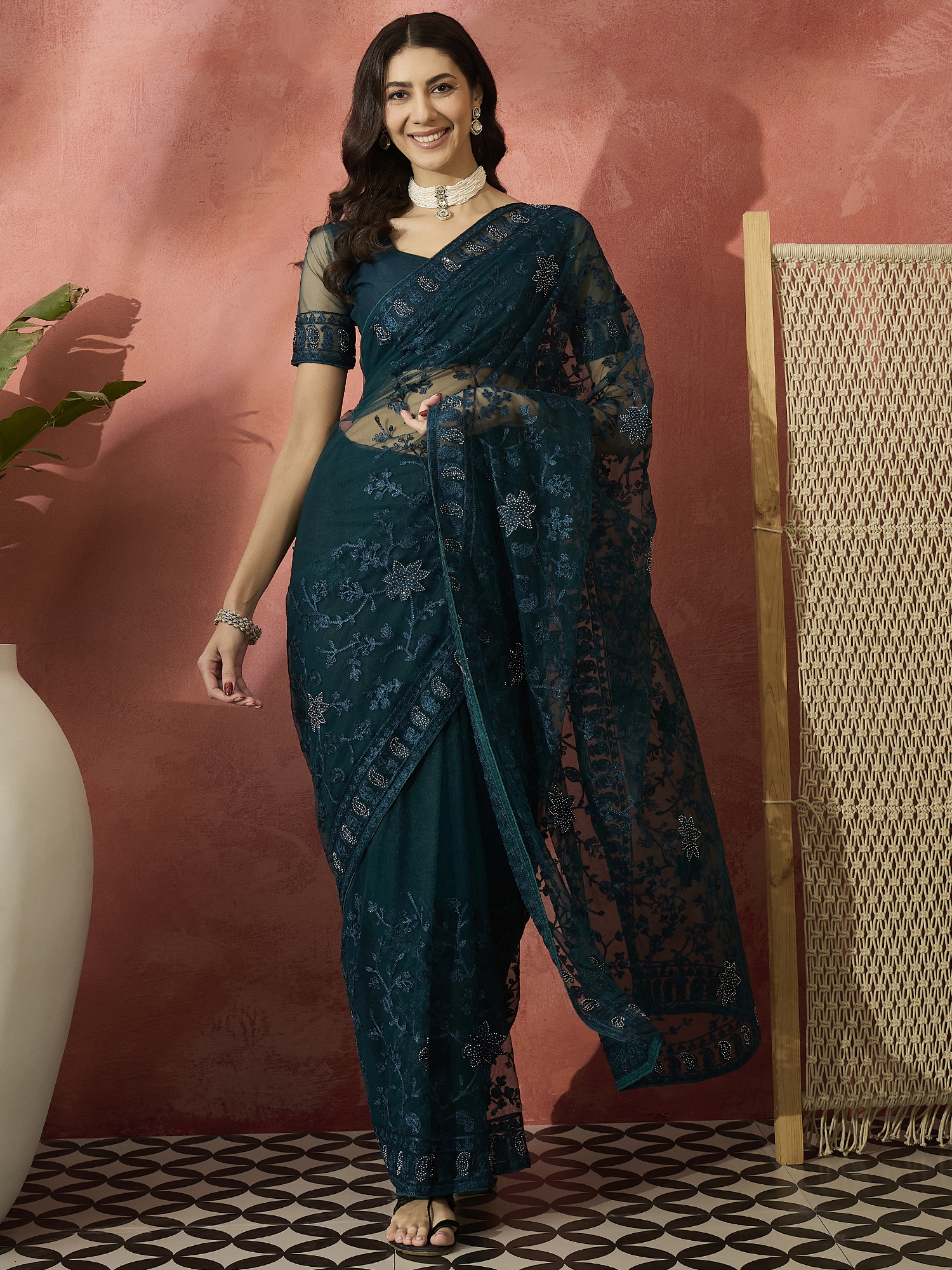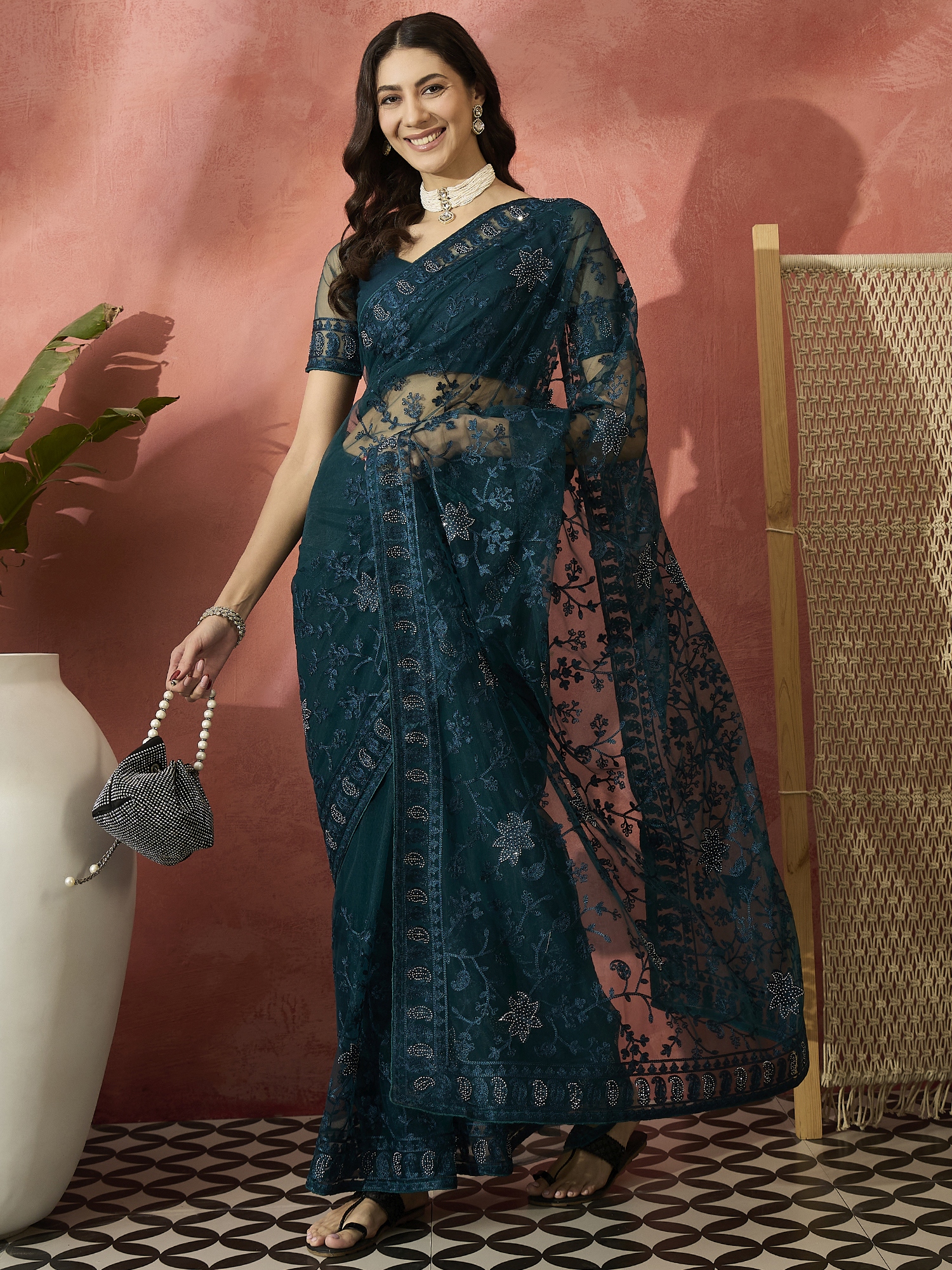 Fashion Dream Womens Teal Net Saree | Soft & Elegant Traditional Wear