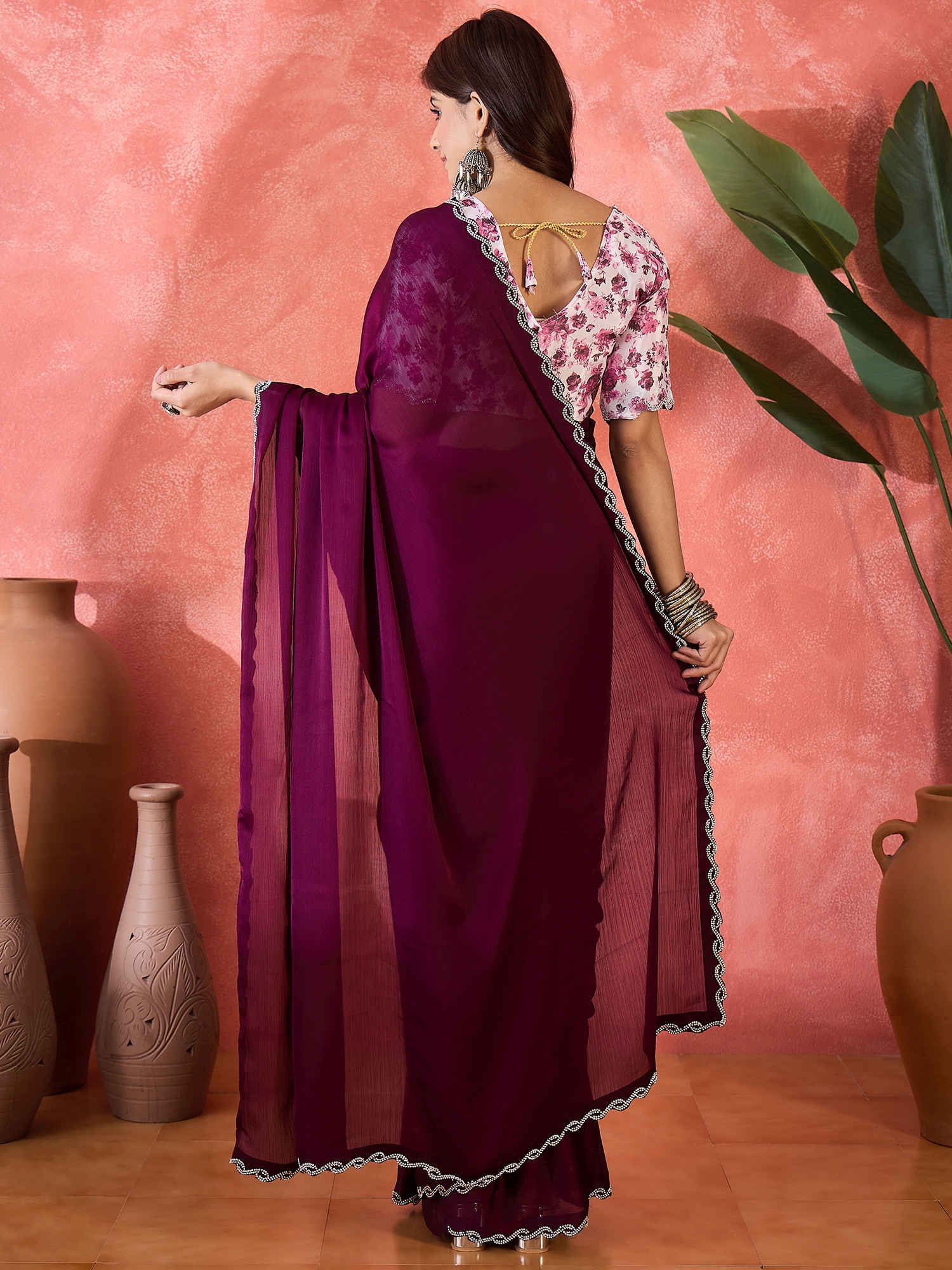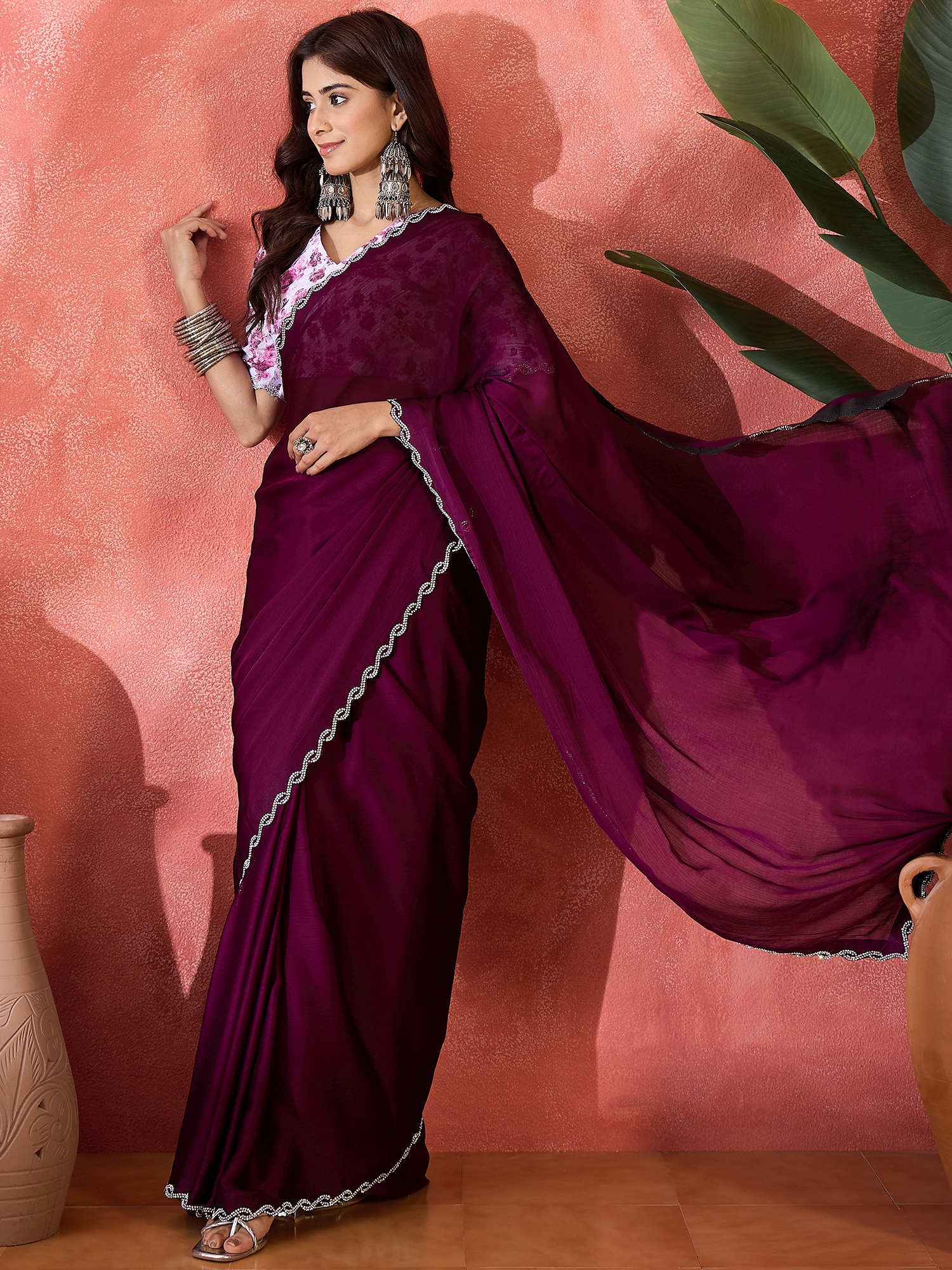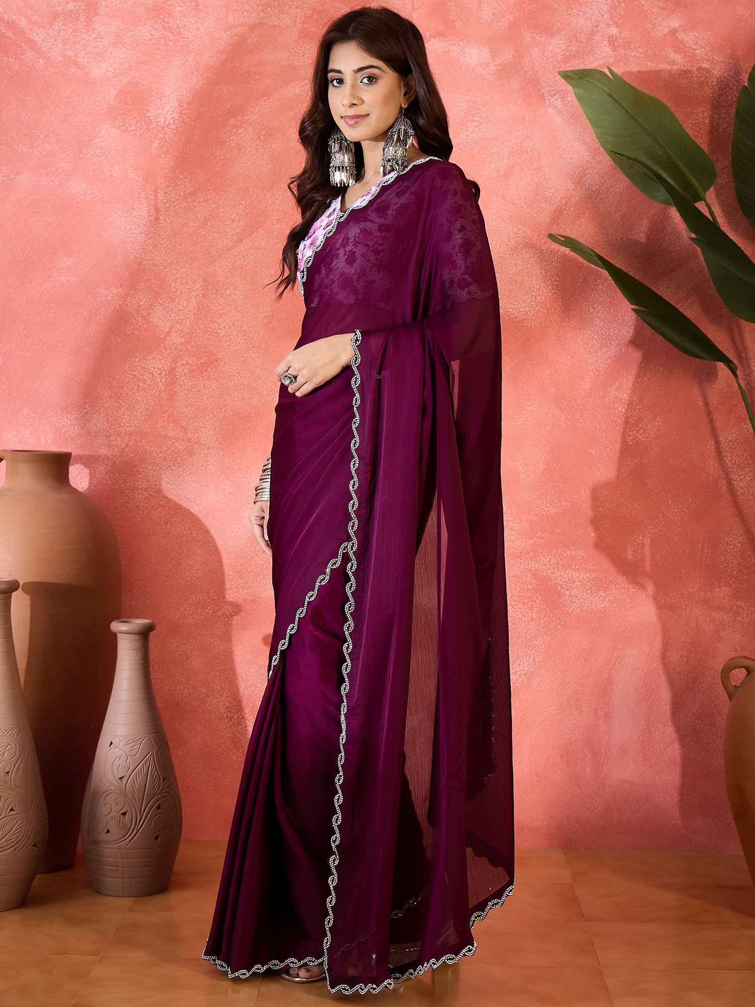 AASTHA FASHION Fashion Dream Womens Wine Heavy Satin Chiffon Saree | Soft & Elegant Traditional Wear
