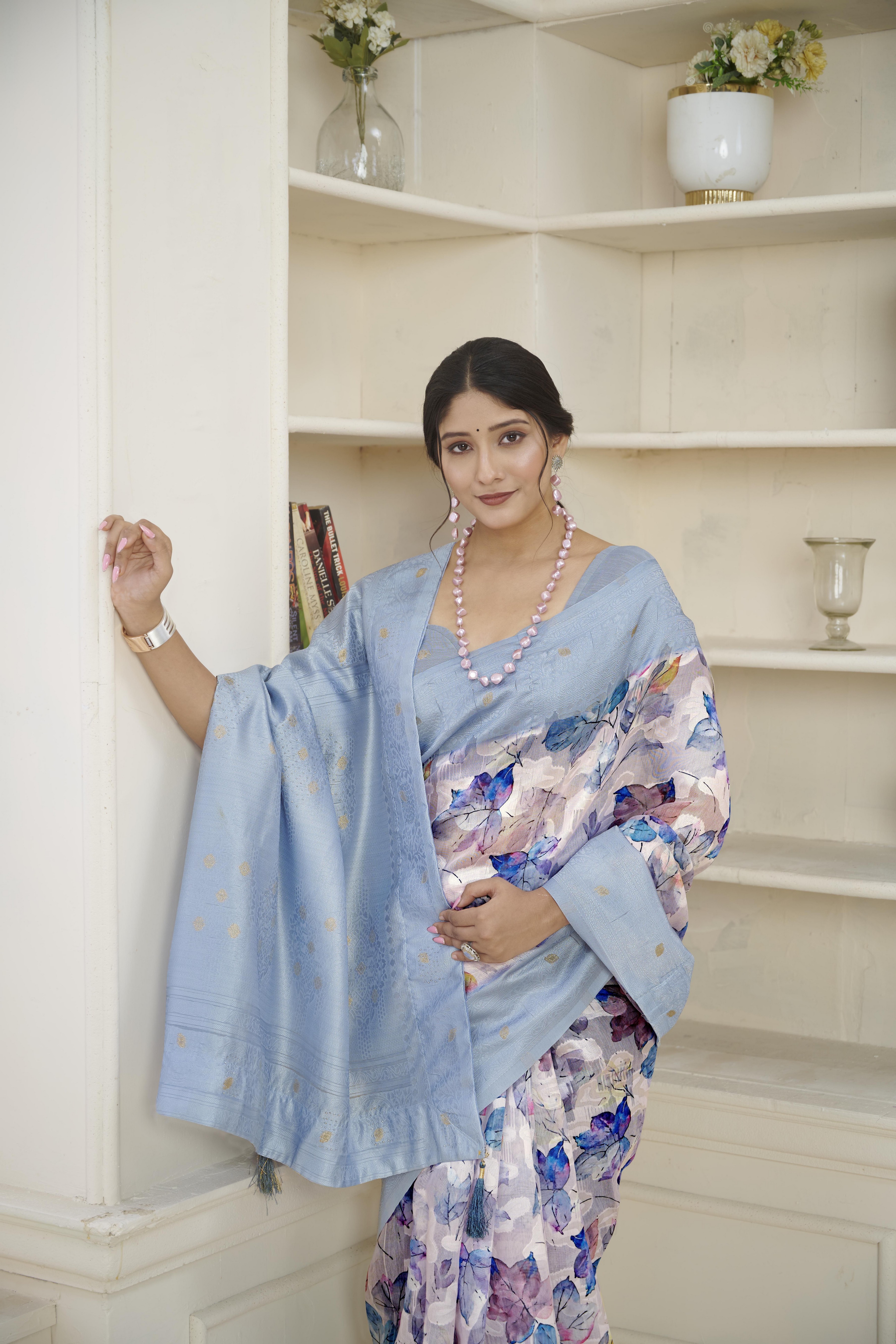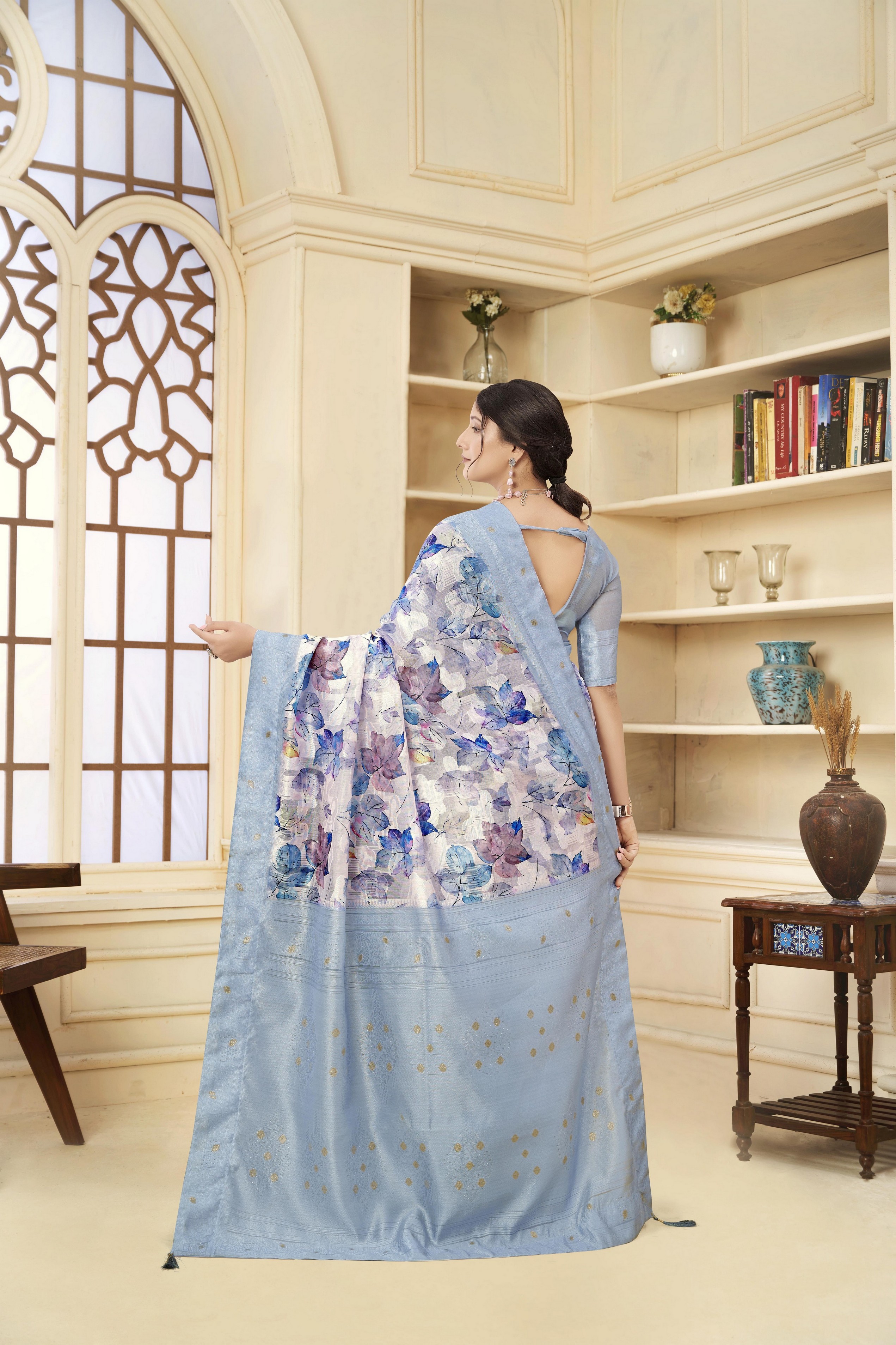 Aqua Blue Color Wevon Jacquard Designer With Printed Rich Silk Fabric Stylish Ceremonial Saree