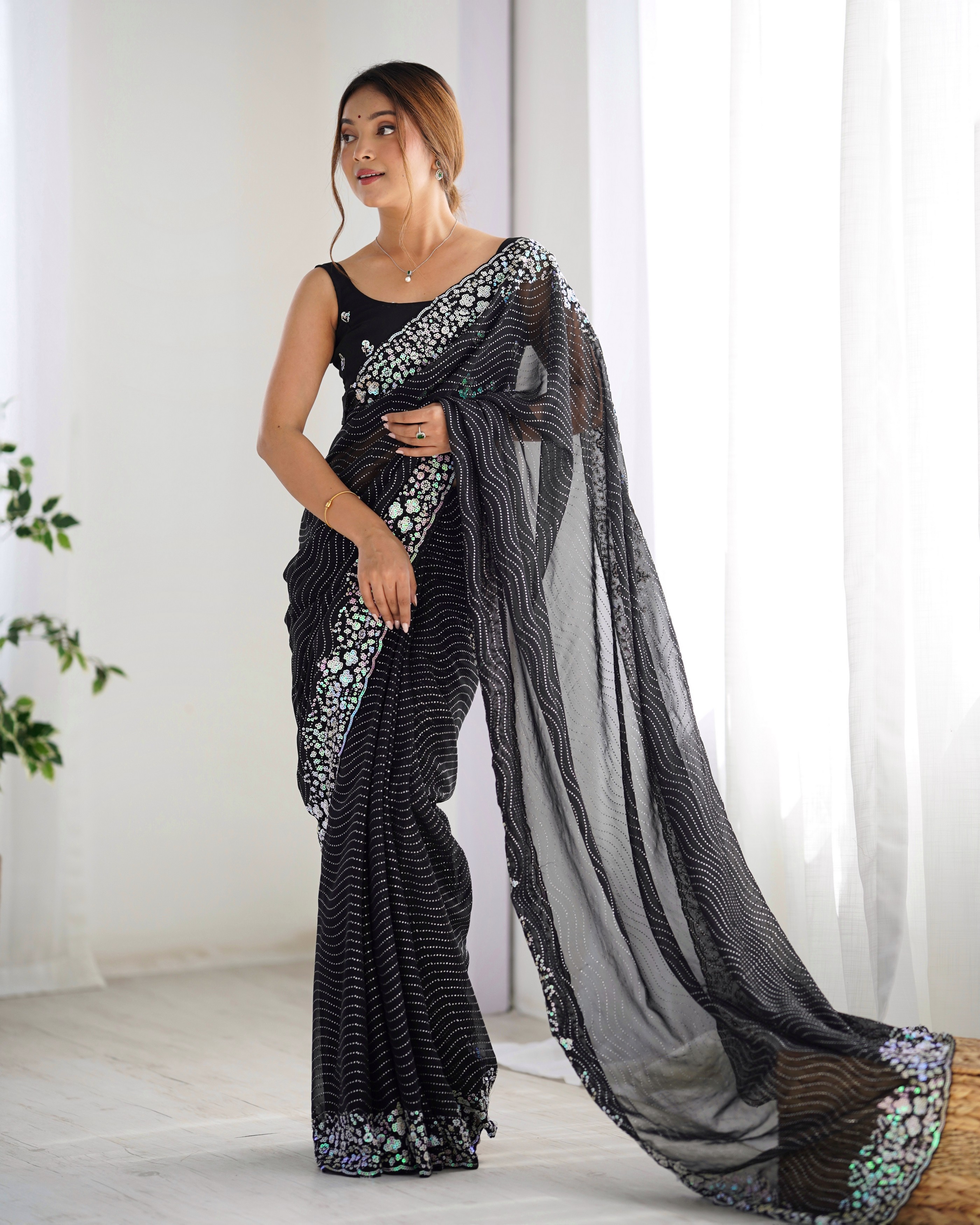 Black Color Georgette Fabric Beautiful Partywear Embroidered Saree