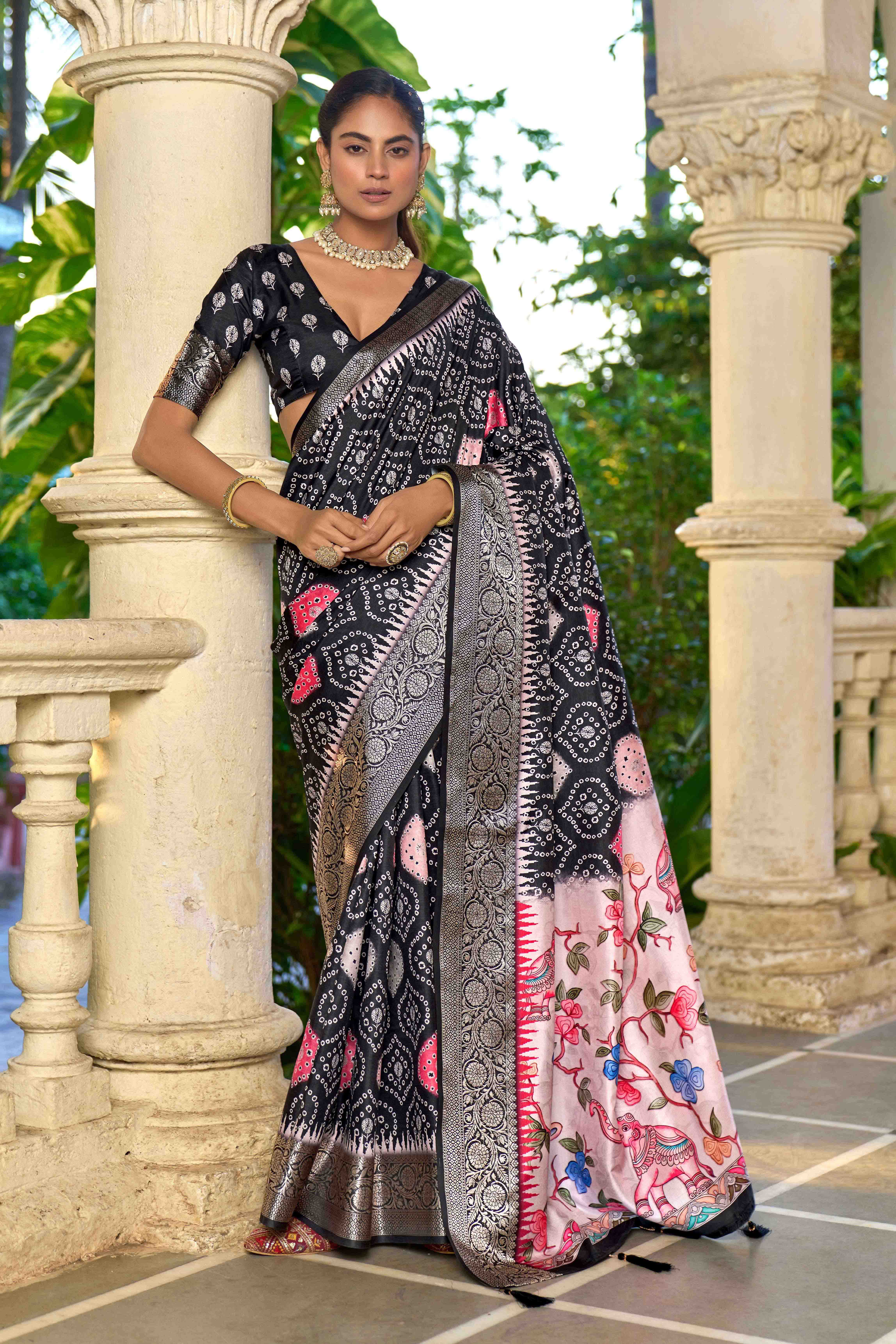 Black Color Silk Blended Traditional Bandhani Ajrakh Printed Saree