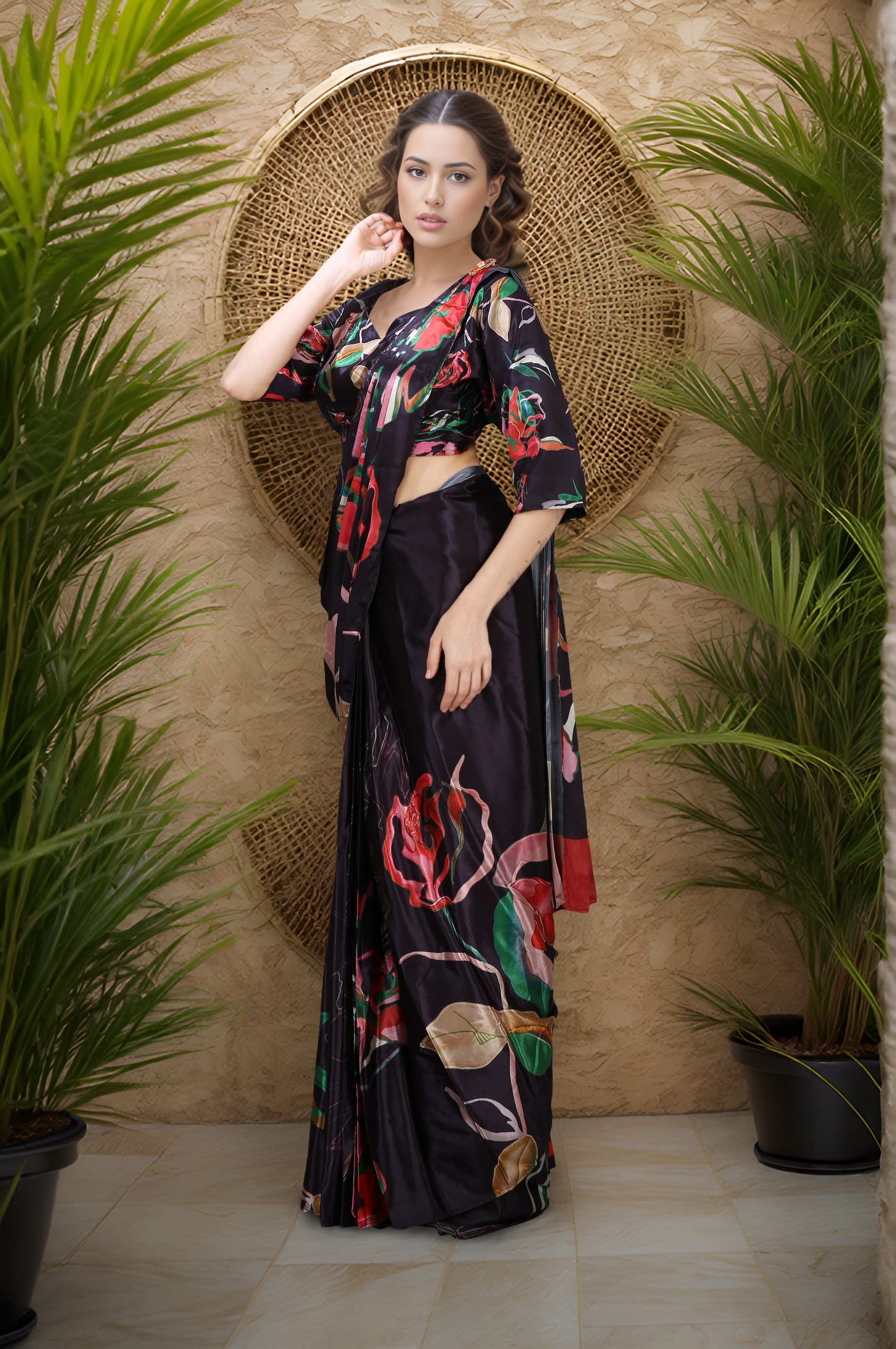 Black Color Silk Crepe Fabric Beautiful Ready To Wear Partywear Saree