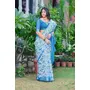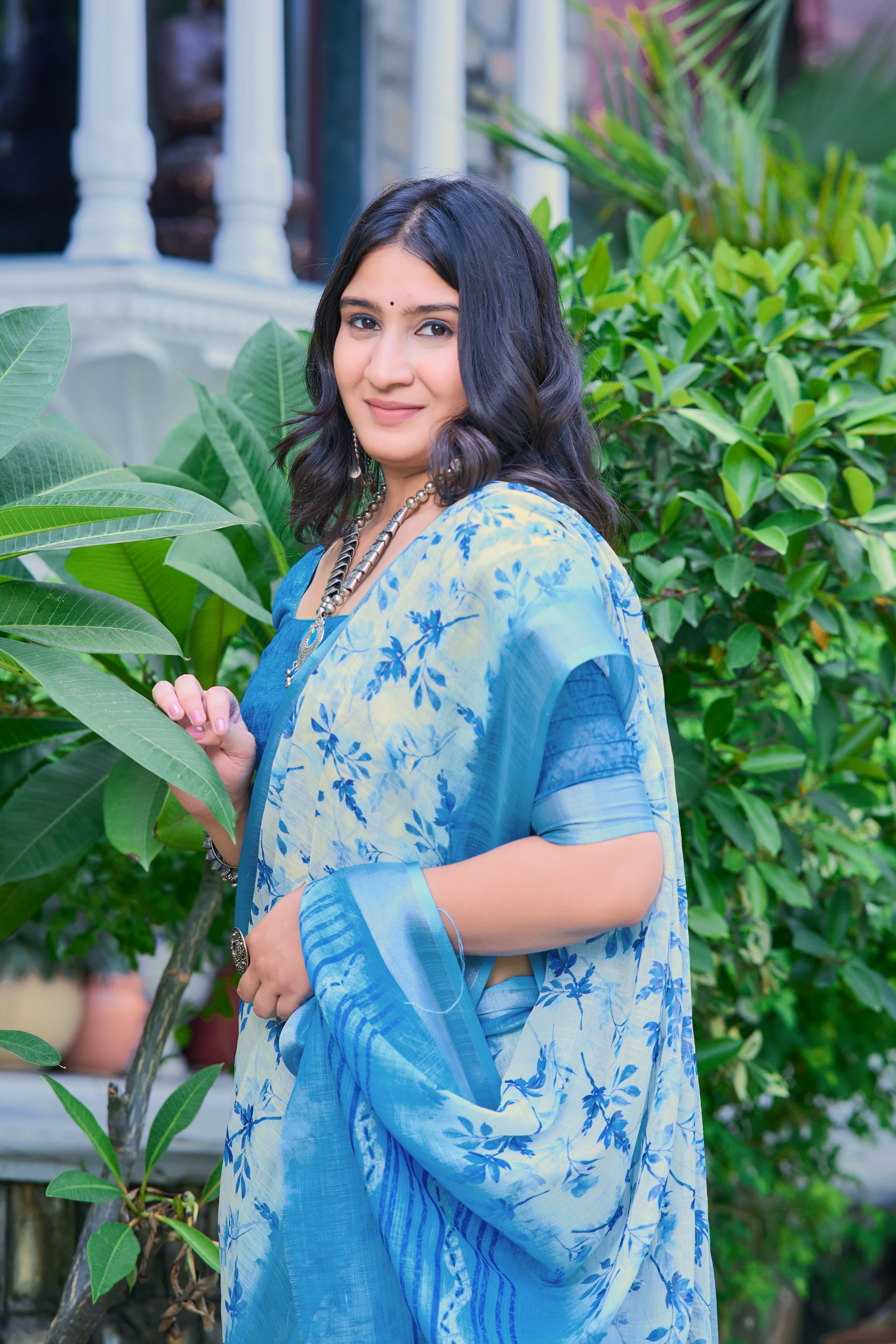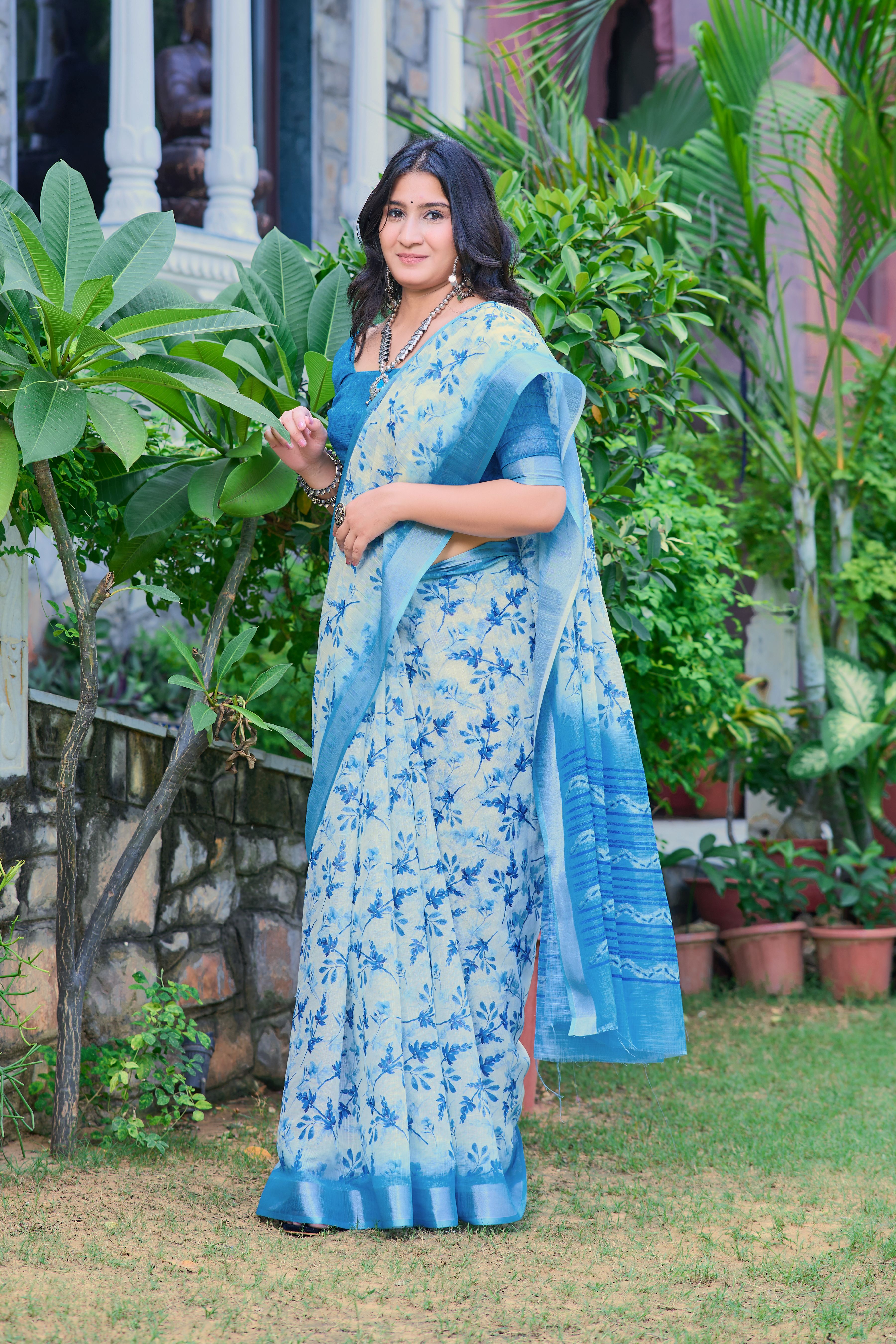 Blue Color Beautiful Linen Cotton Fabric Designer Festive Wear Saree